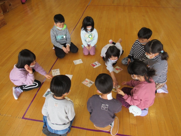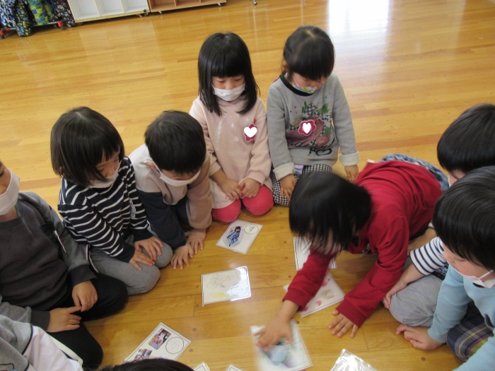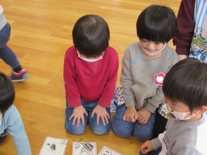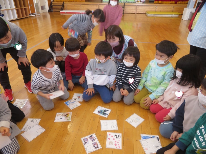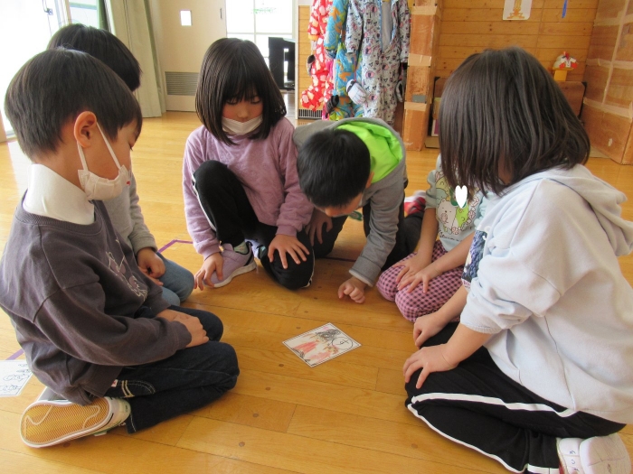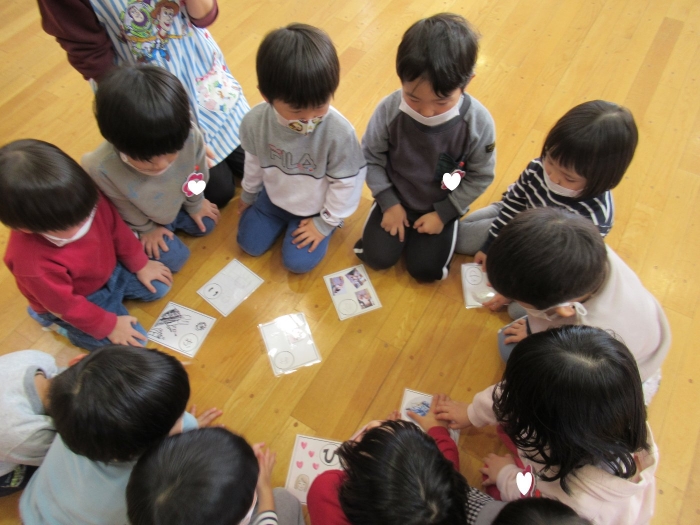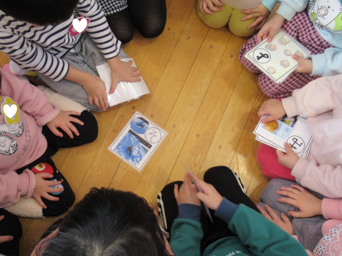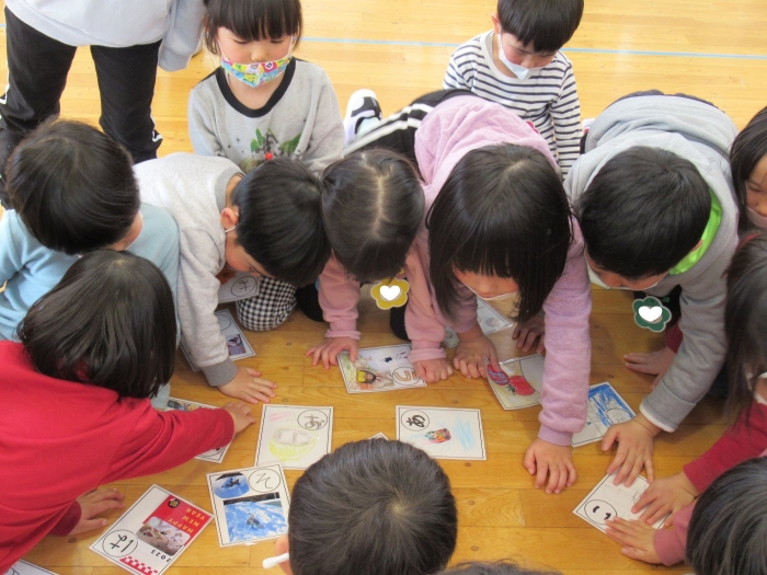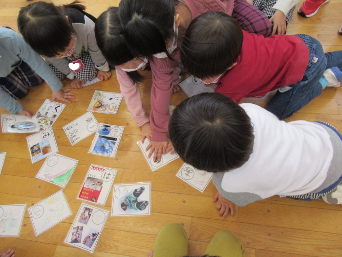さて、今日のお楽しみは『カルタとり大会』。冬休み中、ご家庭でお子さんと一緒に作成していただいたカルタを使って行いました。手作りのため、同じ文字が数枚あったり、スケートやみかん等、同じ絵のカルタも数枚あります。そのため、「そっちの”す”じゃないよ。こっちの”す”じゃない?」みたいな事態もたびたび起こります。そんな様子も、手作りの面白さならでは。ちなみに今年は『あ』と『す』の文字が多かったようです。いちごさんは、自分の作ったカルタを他のお友達にとられてしまい、「それ私のだからダメ!」という場面も(汗)。とにかく熱い戦いを繰り広げ、その中でいちごさんもルールを少しずつ理解しながらカルタとりを楽しみました。