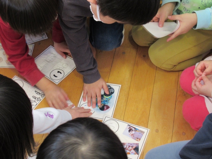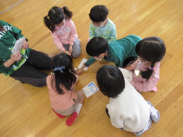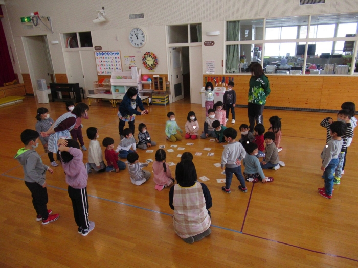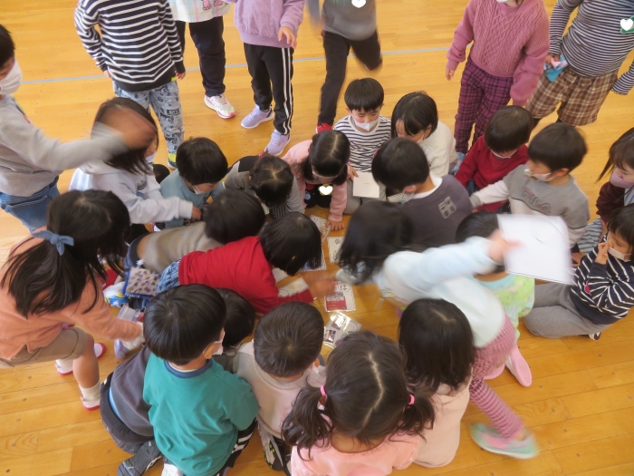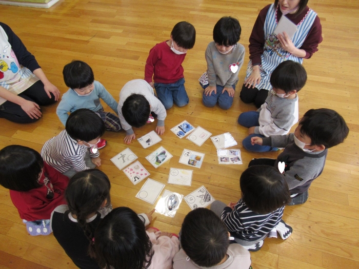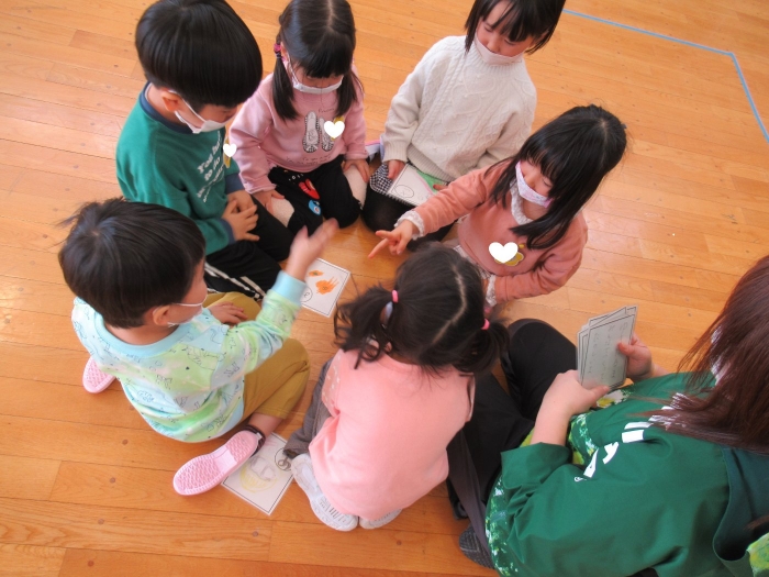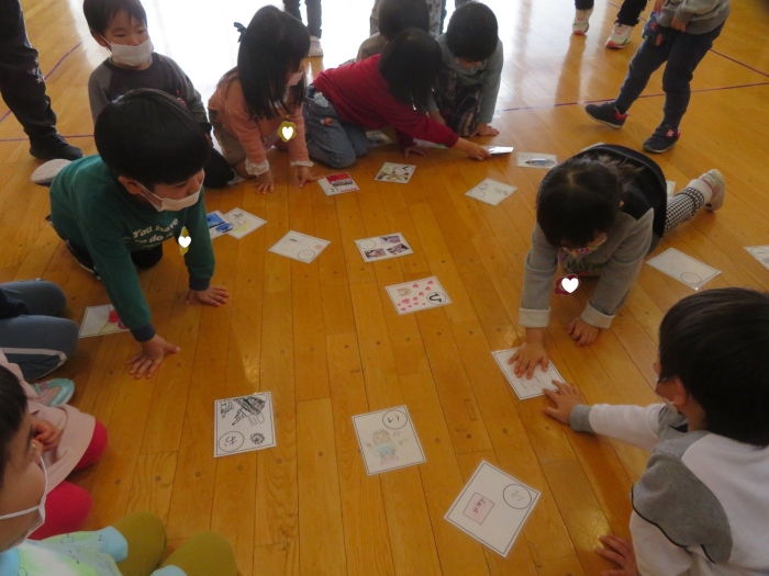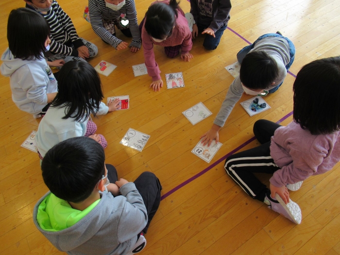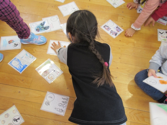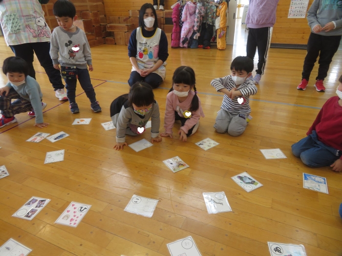 さて、今日のお楽しみは『カルタとり大会』。冬休み中、ご家庭でお子さんと一緒に作成していただいたカルタを使って行いました。手作りのため、同じ文字が数枚あったり、スケートやみかん等、同じ絵のカルタも数枚あります。そのため、「そっちの”す”じゃないよ。こっちの”す”じゃない?」みたいな事態もたびたび起こります。そんな様子も、手作りの面白さならでは。ちなみに今年は『あ』と『す』の文字が多かったようです。いちごさんは、自分の作ったカルタを他のお友達にとられてしまい、「それ私のだからダメ!」という場面も(汗)。とにかく熱い戦いを繰り広げ、その中でいちごさんもルールを少しずつ理解しながらカルタとりを楽しみました。