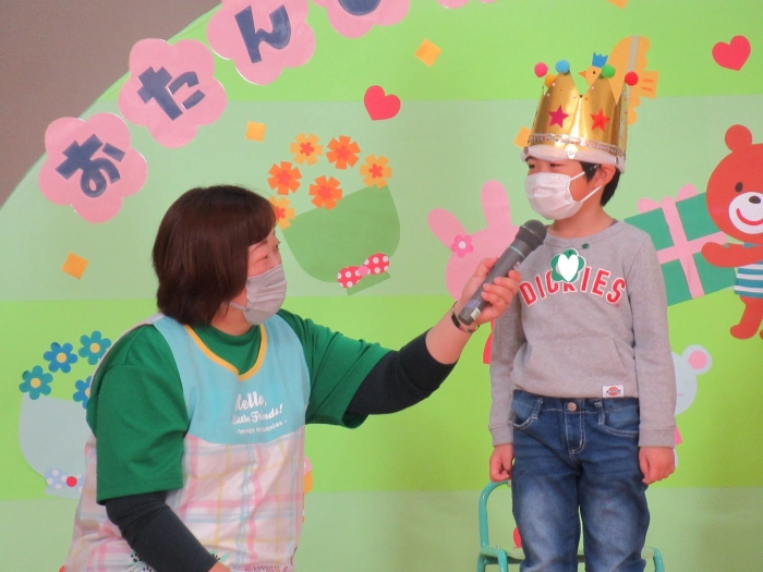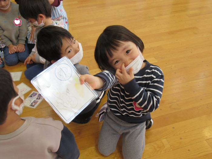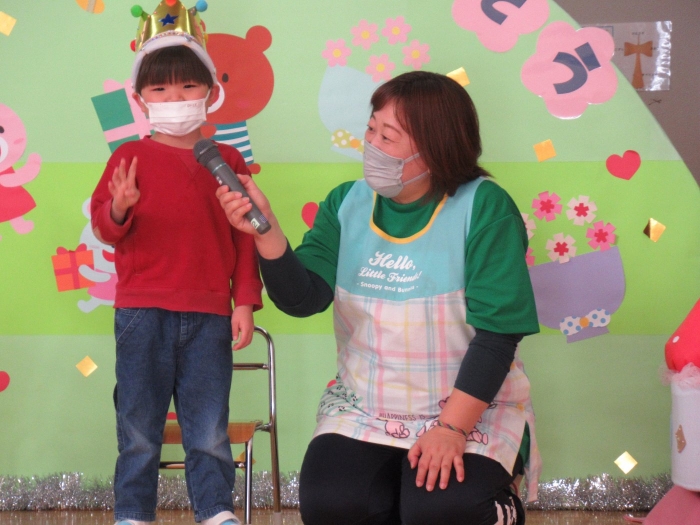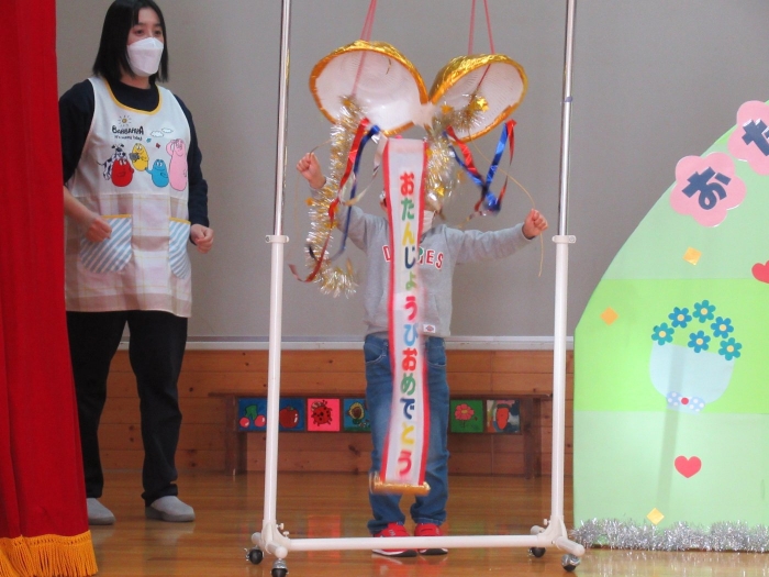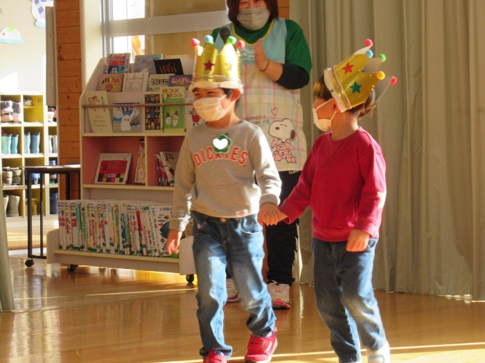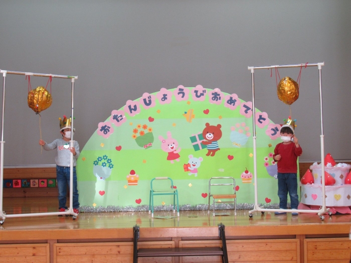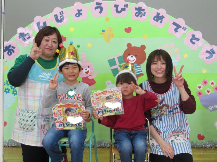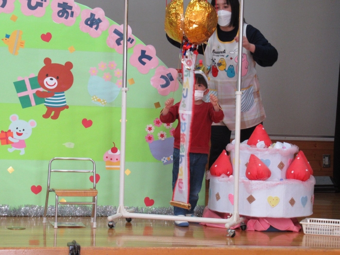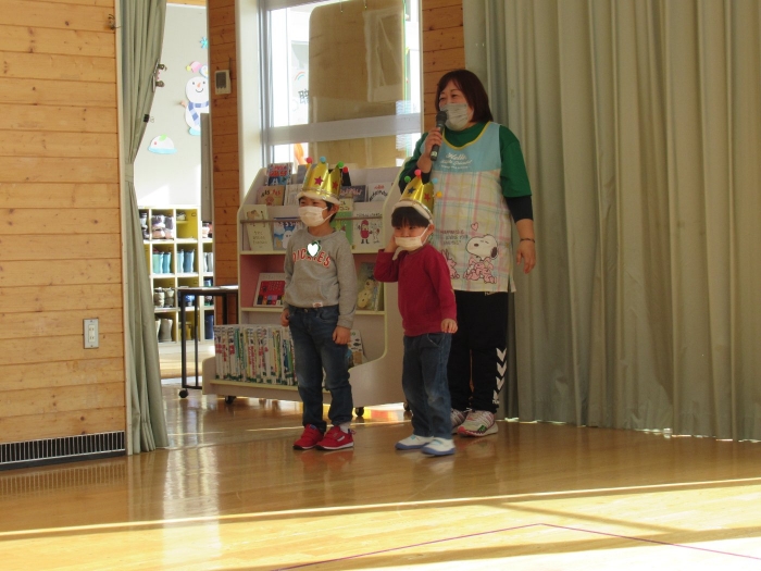 今日は、1月生まれさん3名の誕生会。残念ながら1名欠席してしまいましたが、2月に一緒にお祝いをしたいと思います。さて、1月生まれさん達、数日前から楽しみにしていたようで、今日はかなりテンション高めでした(笑)。みんなにお祝いをしてもらい、とても嬉しそうな二人でしたよ。