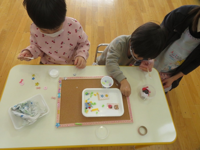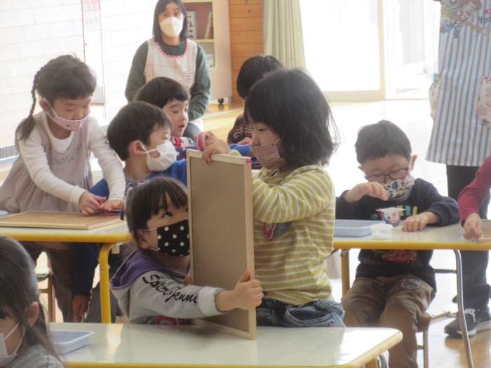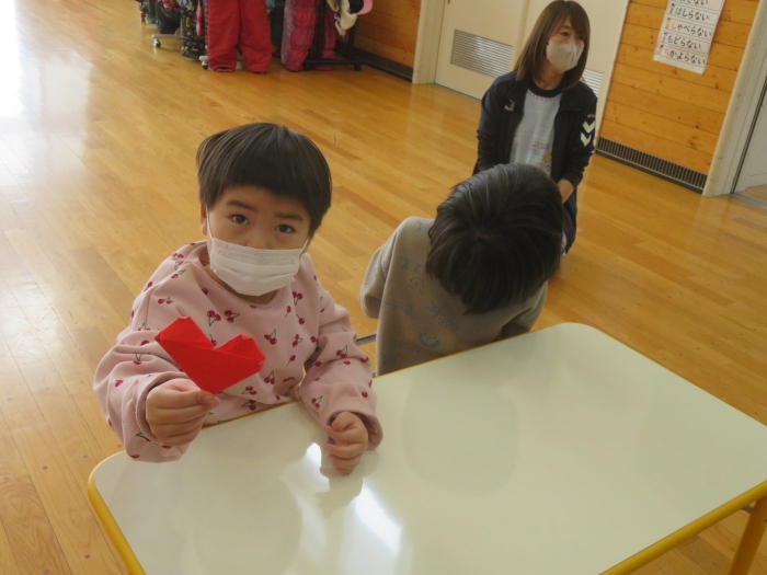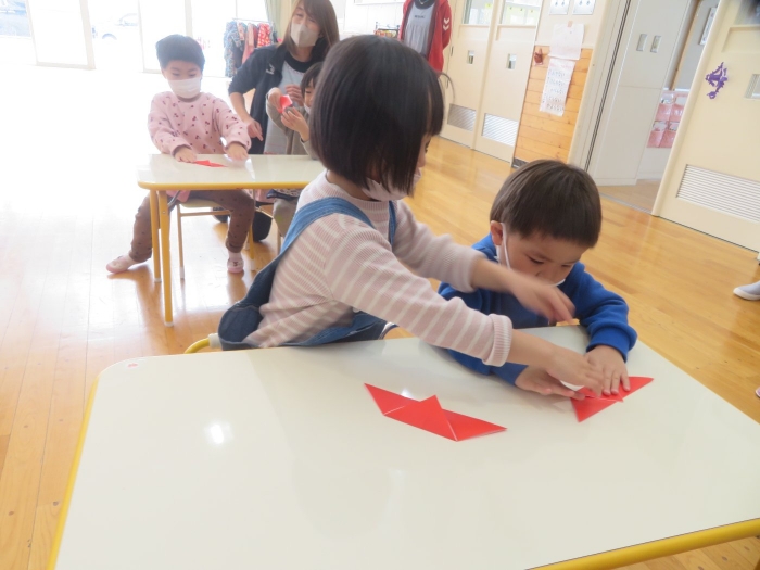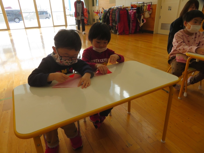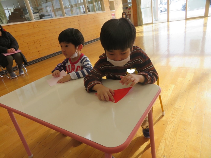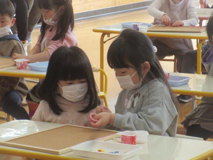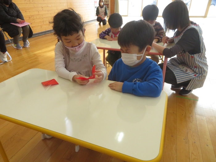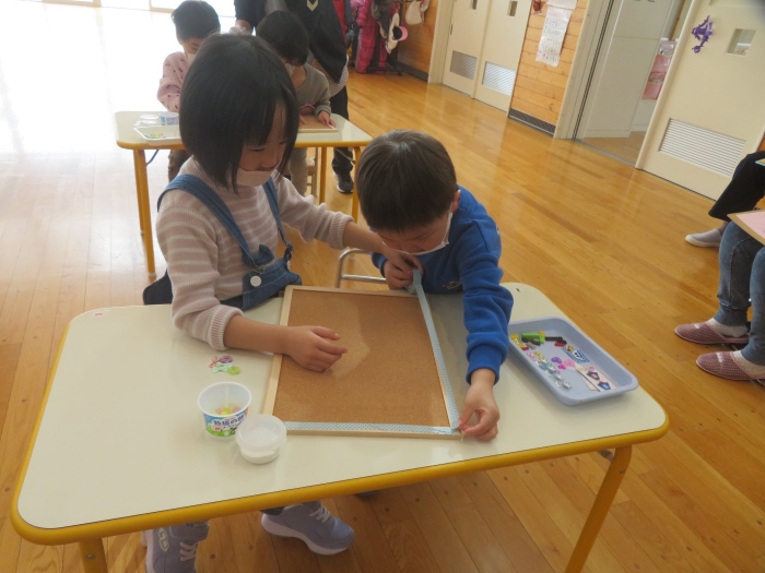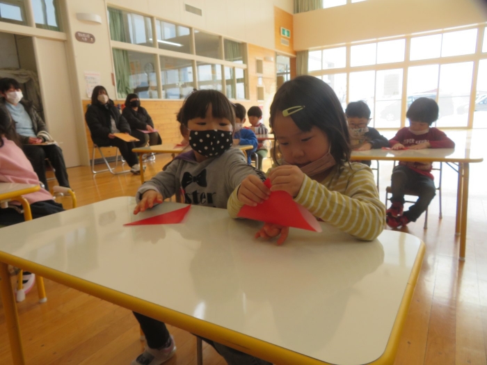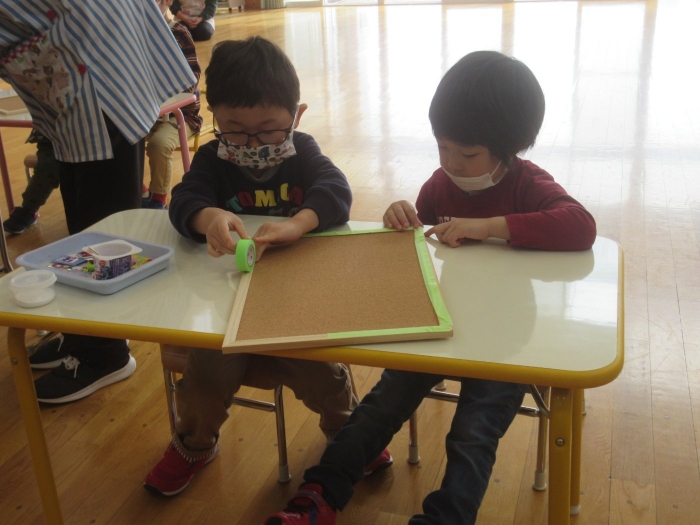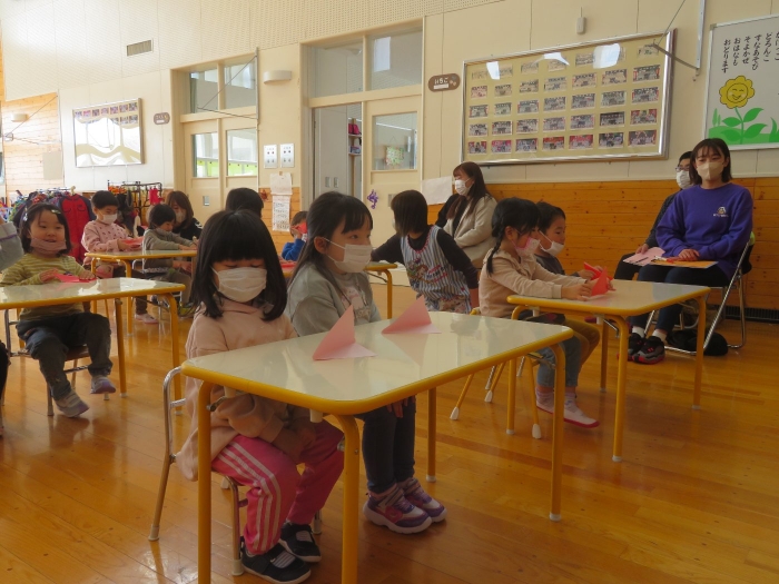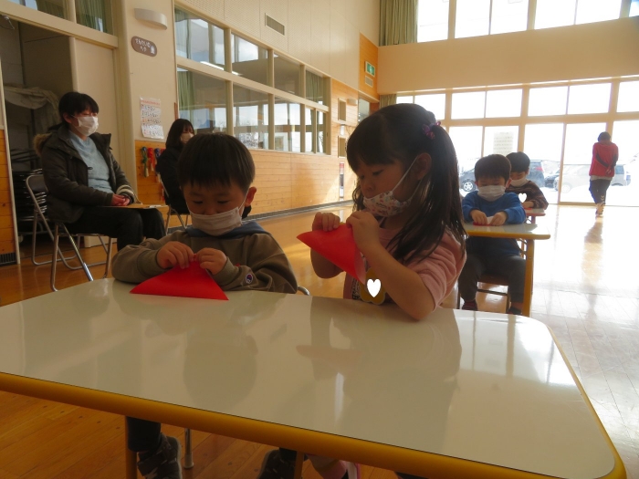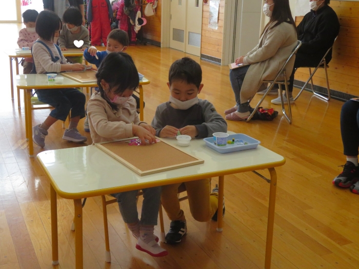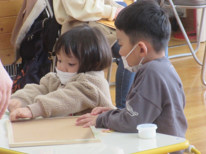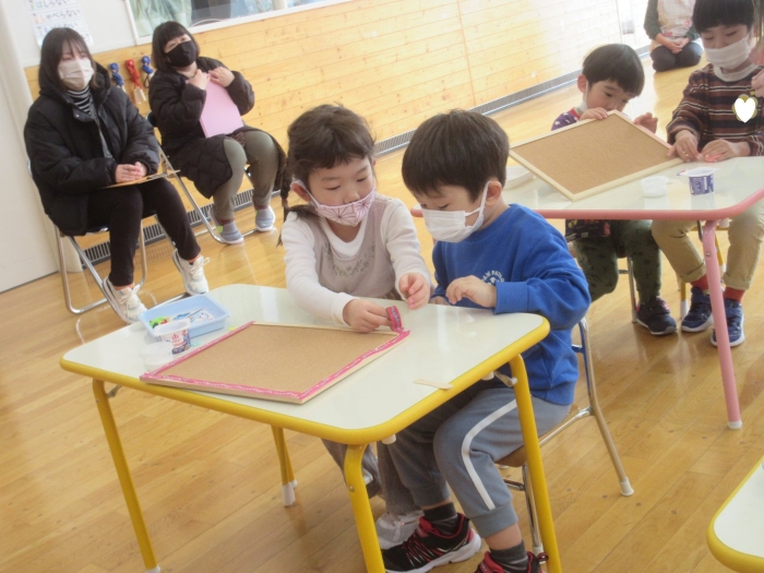 今日は、つくし組・いちご組の参観日。お別れ会に向けて、2クラス合同でたけのこさんへのプレゼント制作の様子を見ていただきました。つくしさんは、いちごさんの様子を気にかけながら、いちごさんは、難しい所はつくしさんに教えてもらいながら、ペアのお友達と協力して作る姿が見られていたでしょうか。お父さんお母さんは、子ども達の様子を参観しながら、つい口を出したくなる場面があったかもしれませんね。参観日の様子を通して、アンケートに書ききれなかったことや、お子さんのことで気になる姿などがありましたら、お知らせください。お別れ会まで1週間、来週も、つくしさん・いちごさんで力を合わせて取り組んでいきたいと思います。