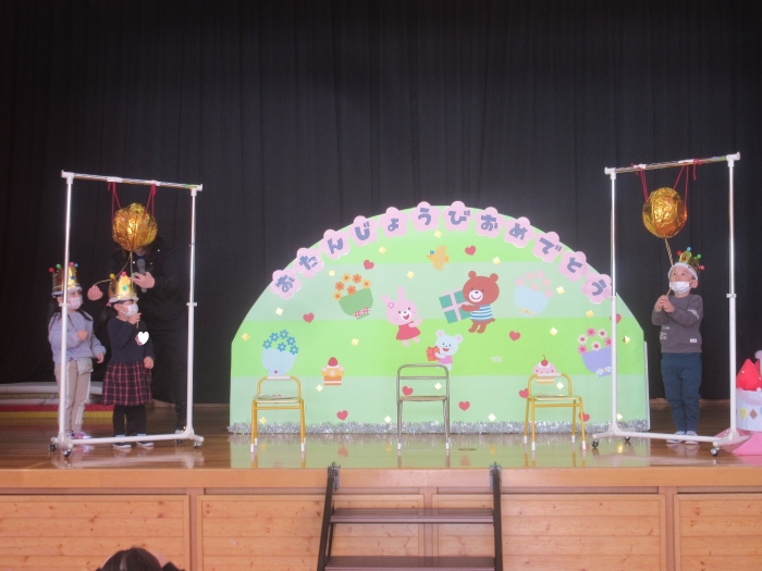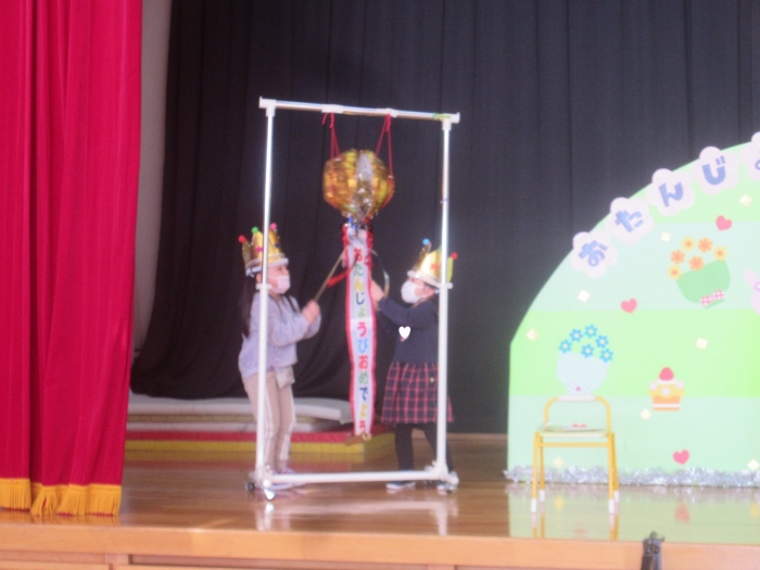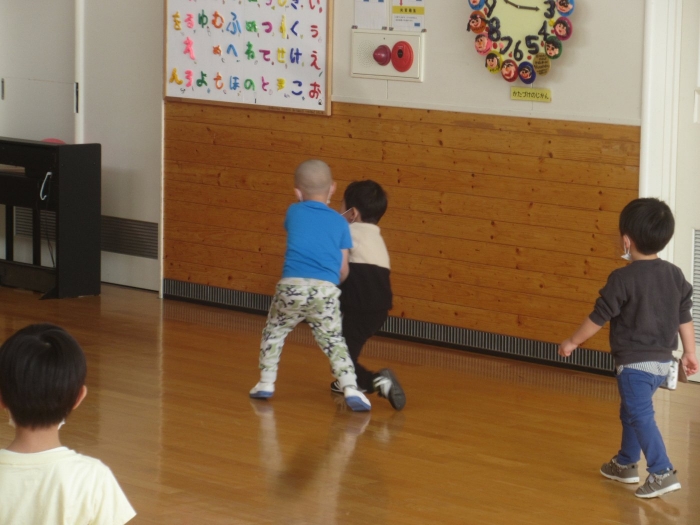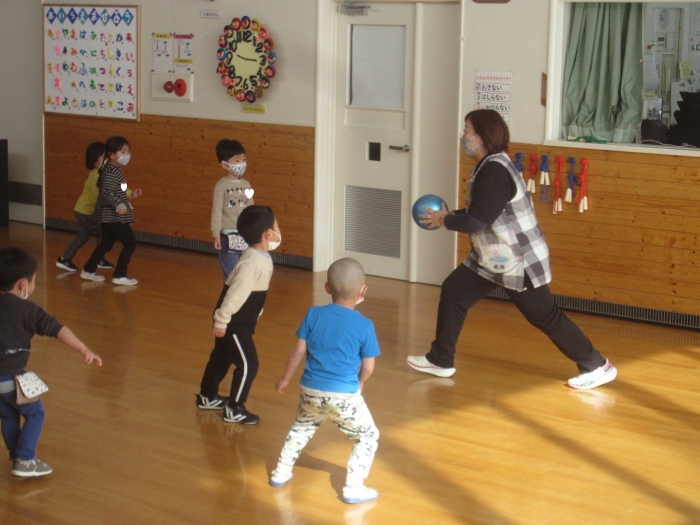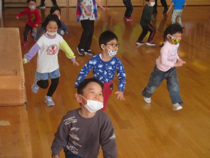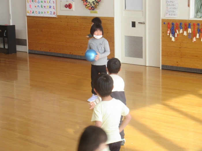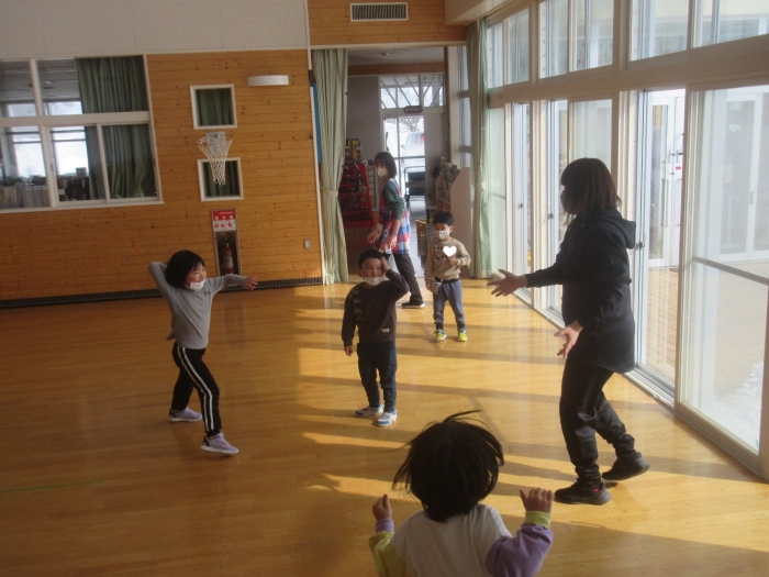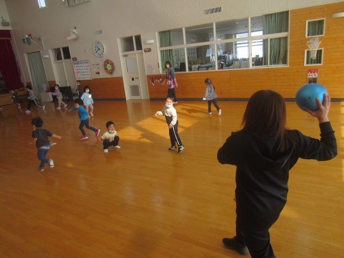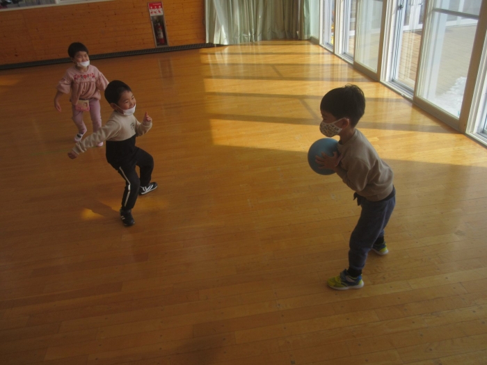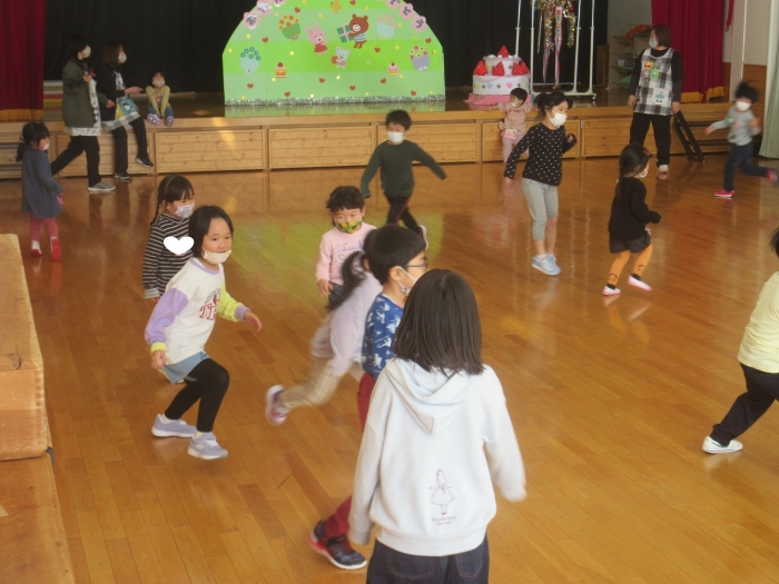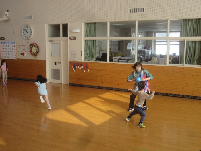 今日は2月の誕生会。つくしさん1名、いちごさん1名、先月お休みした1月生まれのつくしさん1名、3名のお祝いでした。みんなに祝ってもらえるこの日を、首をなが~くして待っていたでしょうね。3名とも元気いっぱ自己紹介をしたり、質問に答えてくれたりしてくれましたよ。さて、今日のお楽しみは、みんなが大好きな『かたき』。普段の遊びの中でも行っているので、ほとんどのお友達がルールを理解しながら参加していました。ボールを当てられて泣いたり、悔しがったり、叫んでいたり(笑)。自分の気持ちを前面にだしながら、子ども達も先生方も本気勝負!担任が、自分のクラスの子ども達を次から次へと当てていくという、すさまじい闘いが繰り広げられていました。大人も子供も、全力だからこその楽しさや悔しさをたっぷり味わいながら、汗だくになって楽しみました。