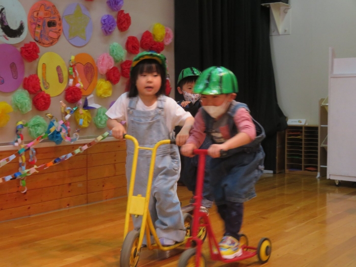 すいかヘルメットとつなぎ