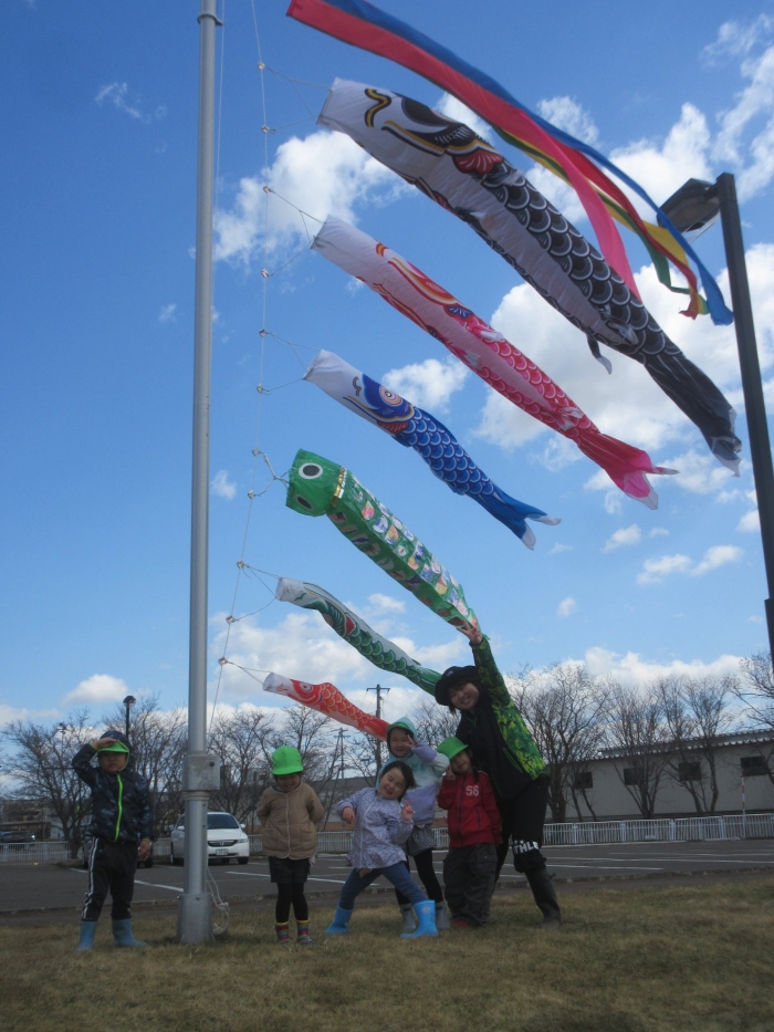 昨日は、たけのこさんが数日かけてみんなで作った大きな鯉のぼりを揚げました。もうご覧になりましたか?かなりの強風だったので、どこかへ飛んで行ってしまうのではないかと少し心配でしたが、今のところ、園庭で元気に泳いでいます。休み中、道路や地域のどこかで緑色の鯉のぼりを発見した場合は、たけのこさんの手作り鯉のぼりだと思いますので、幼稚園まで届けていただけると有難いです。