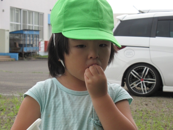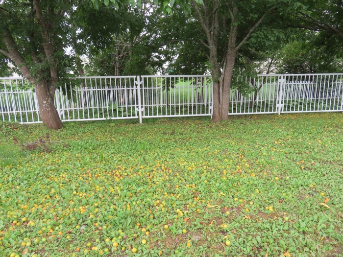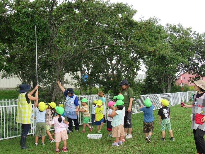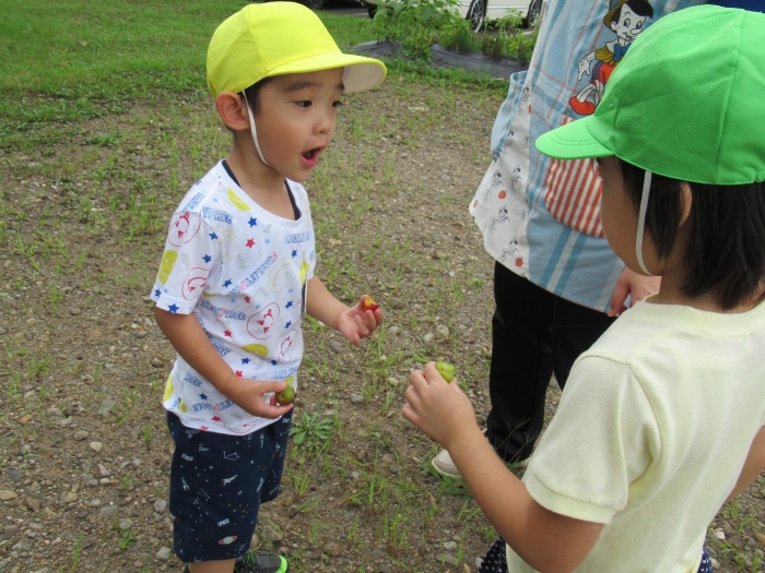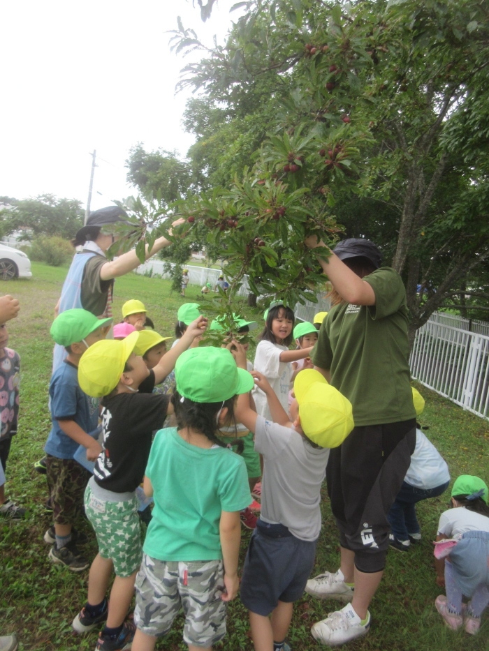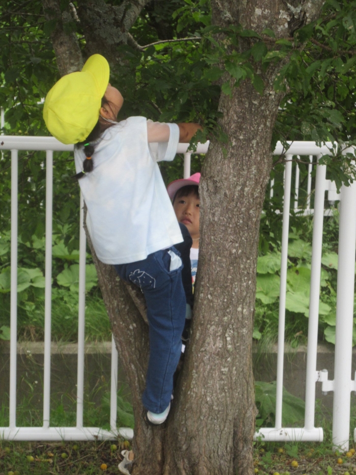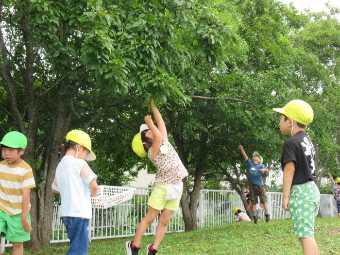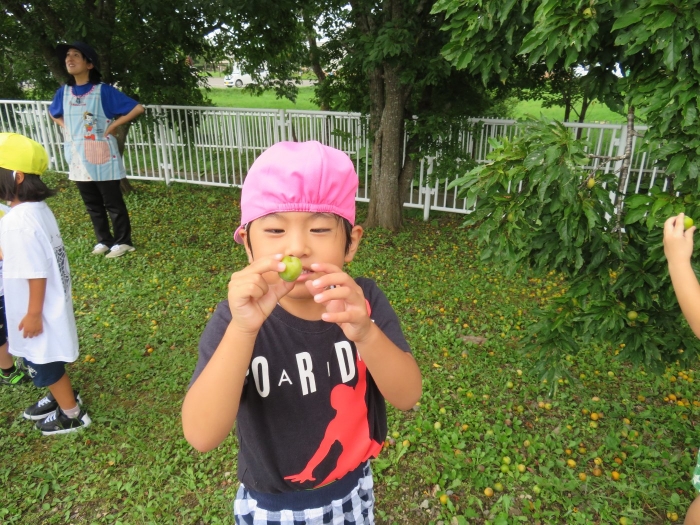 朝の会後は、みんなでスモモを採りに行きました。職員駐車場横のスモモの木に、大量に実がなっており、実の重さで枝が地面についてしまいそうなほど。