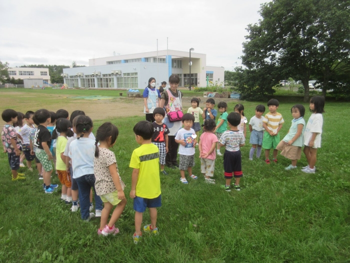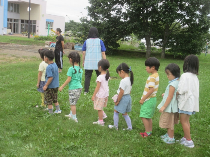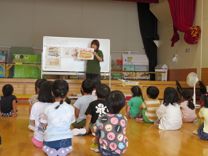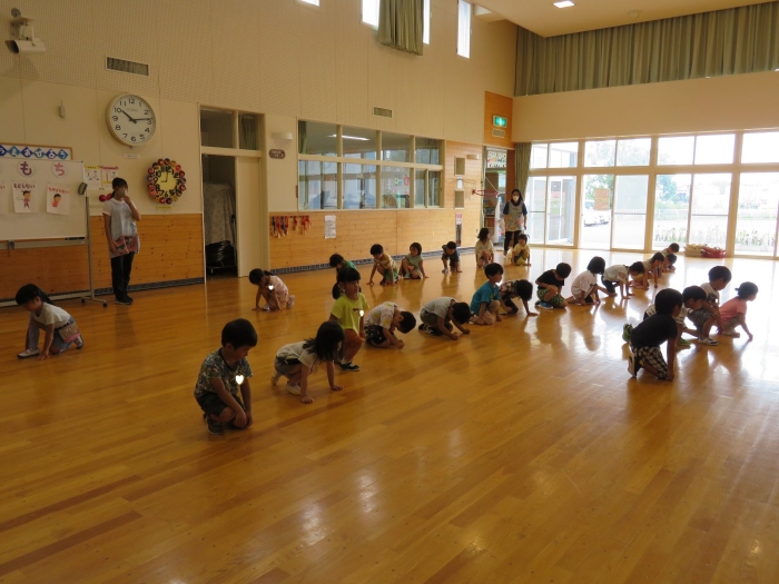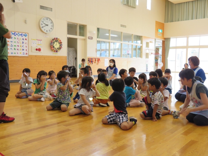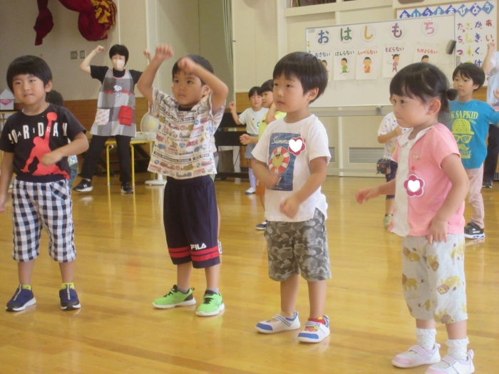 その後、引き続きR先生から9月に行われる神社祭典についてのお話がありました。今年は、地域全体でお祭りが開催されますね。幼稚園は、これまで同様につくし組・たけのこ組でお神輿を作成して担ぎ、全園児でよさこいを披露します。今日のげんきっ子タイムでは、よさこいの練習をしてみました。一年ぶりでしたが、振り付けを思い出しながら笑顔で踊る子ども達でした。これから準備で忙しくなりそうです。