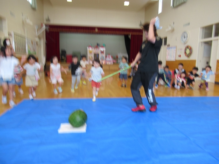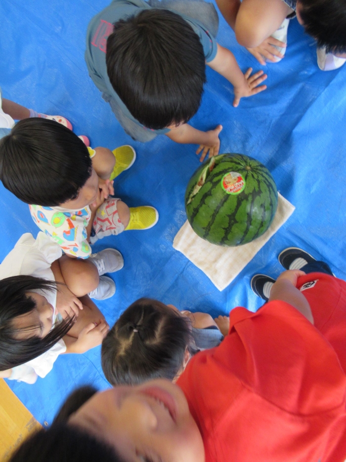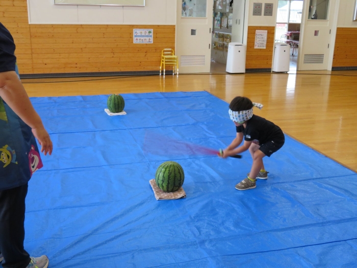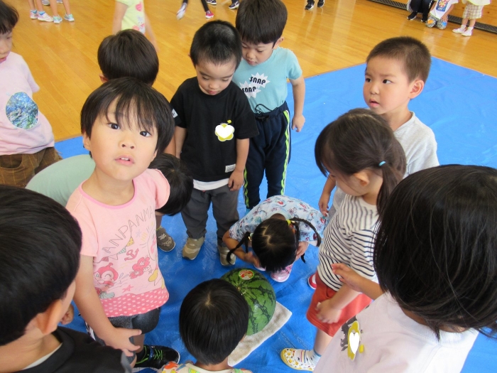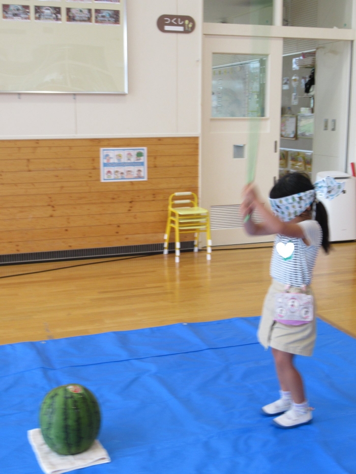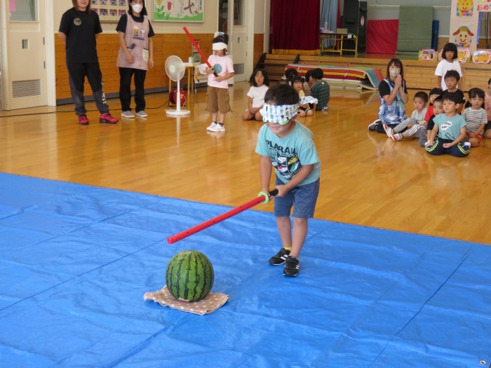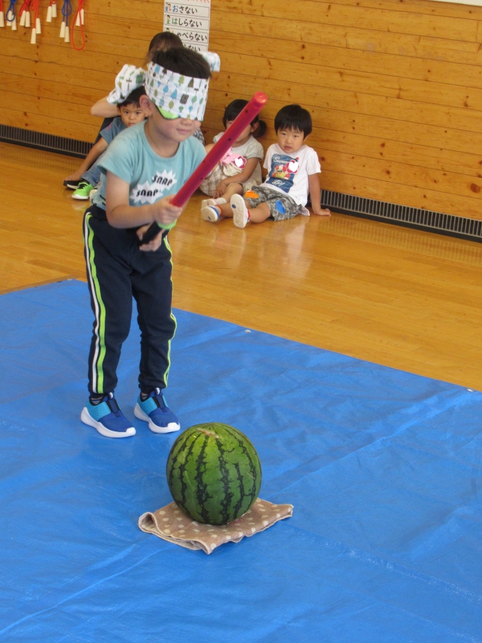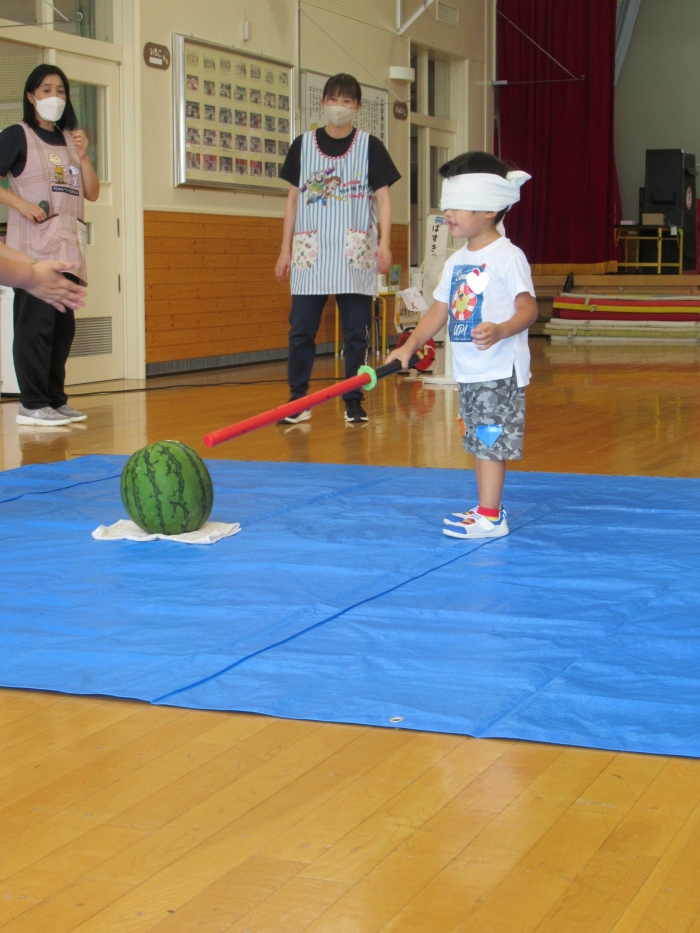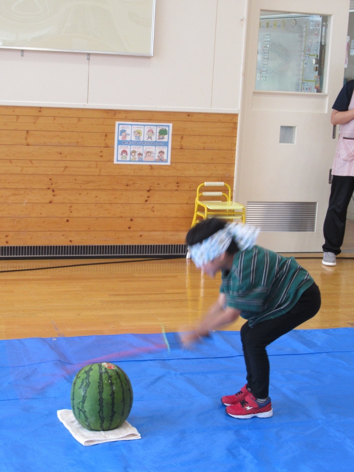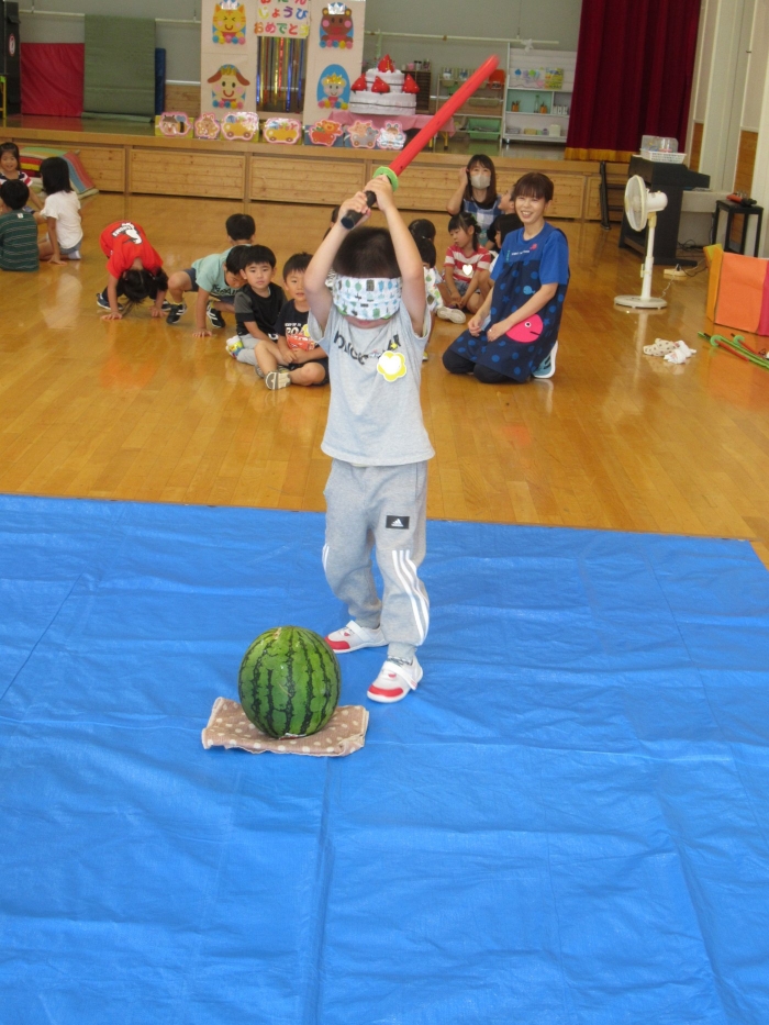 今日は、8月生まれさんの誕生会。つくしさん3名、たけのこさん1名のお祝いでした。今日の日をとても楽しみにしていたようで、ステージではかなりテンション高めの4名でした(笑)。質問コーナーや歌のプレゼント等、一年の一度みんなにお祝いしてもらい、笑顔いっぱいの4名でした。さて、今日のお楽しみはスイカ割り!今年のスイカは、かなりビッグ!昨年は、なかなか割れずに苦労しましたが…今年は無事に割れたかな?