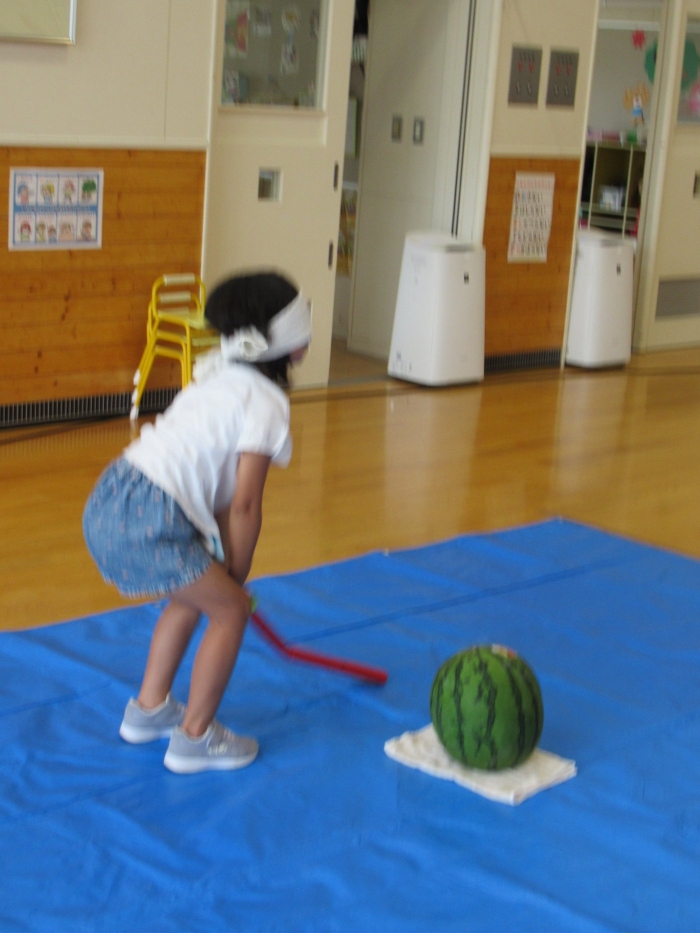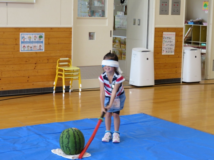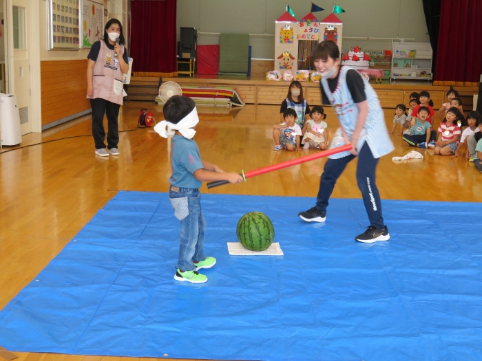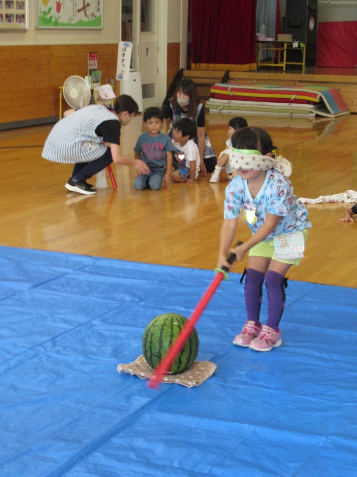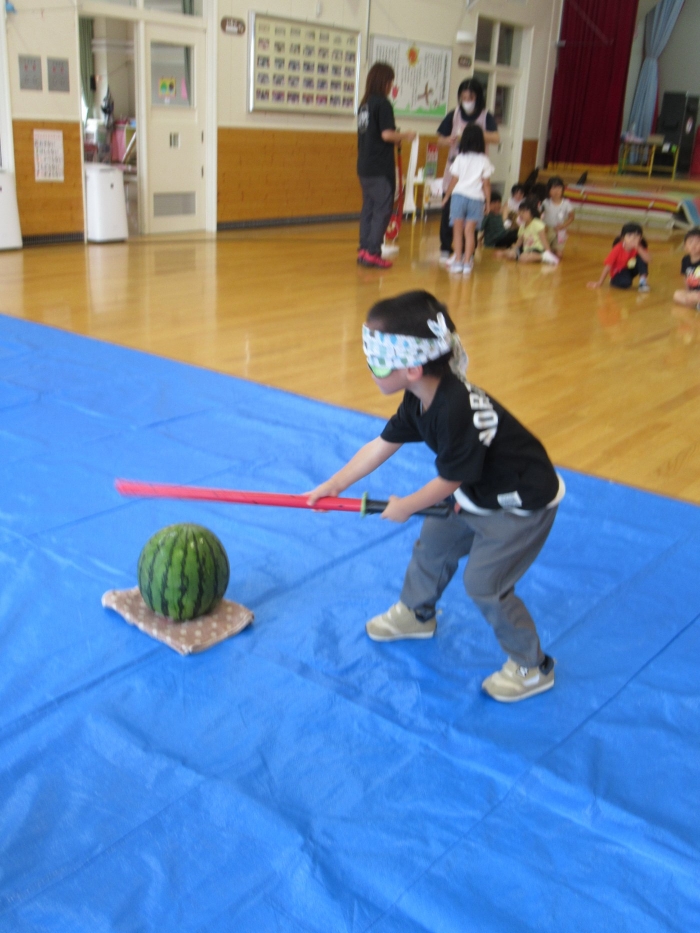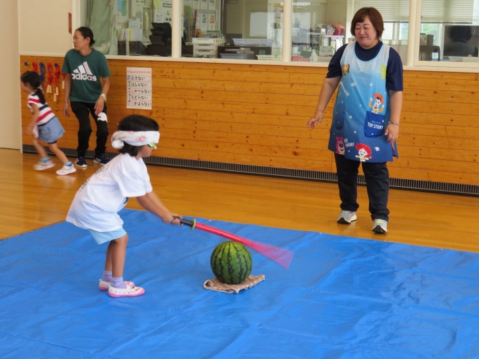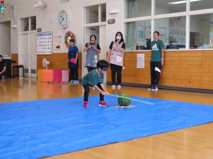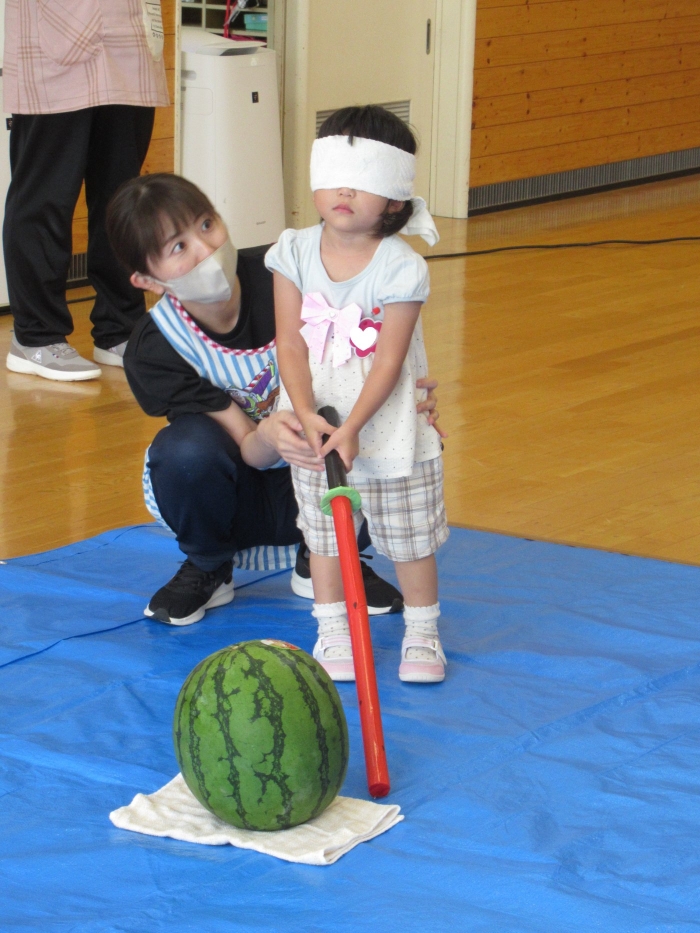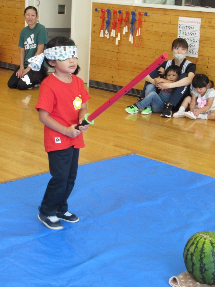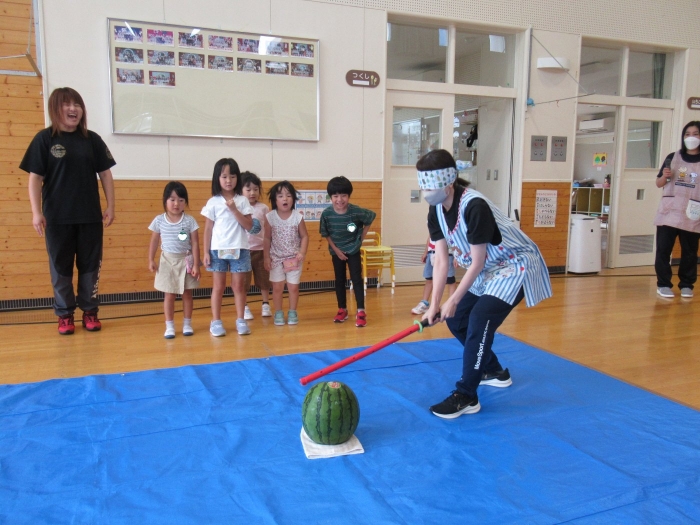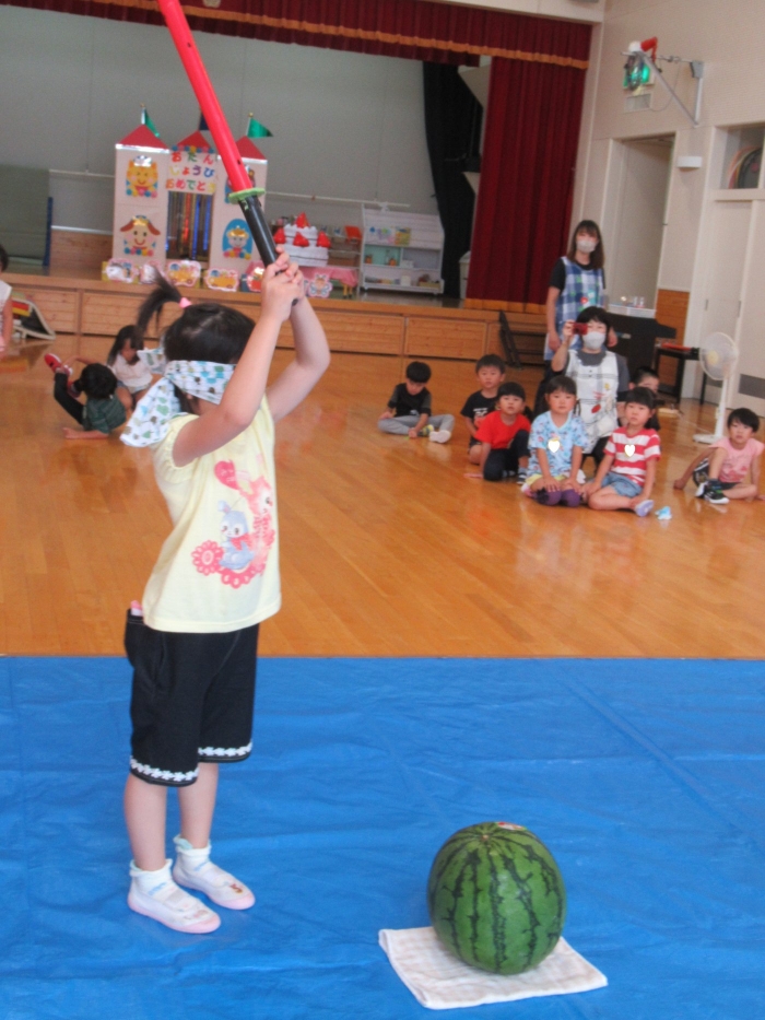 今日は、8月生まれさんの誕生会。つくしさん3名、たけのこさん1名のお祝いでした。今日の日をとても楽しみにしていたようで、ステージではかなりテンション高めの4名でした(笑)。質問コーナーや歌のプレゼント等、一年の一度みんなにお祝いしてもらい、笑顔いっぱいの4名でした。さて、今日のお楽しみはスイカ割り!今年のスイカは、かなりビッグ!昨年は、なかなか割れずに苦労しましたが…今年は無事に割れたかな?