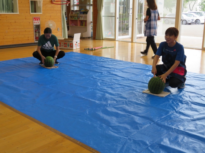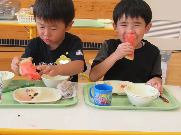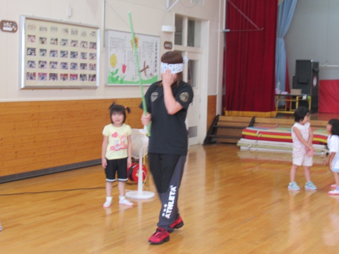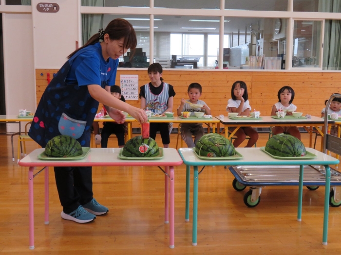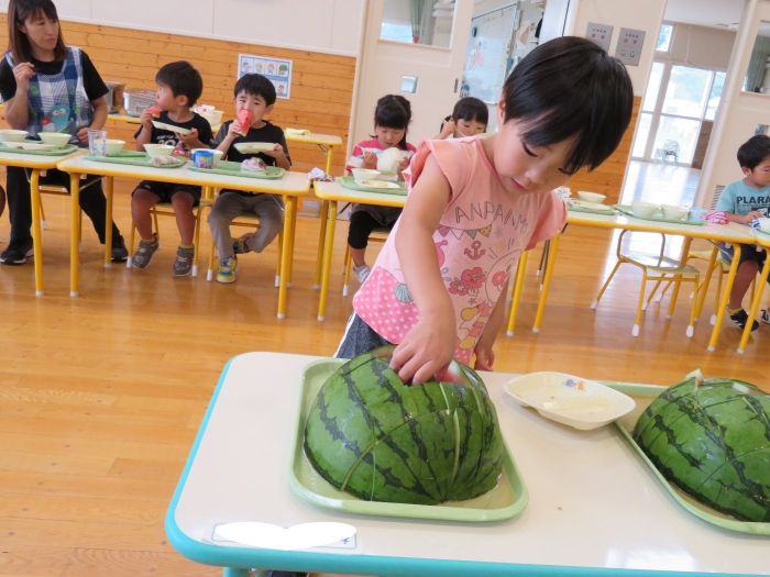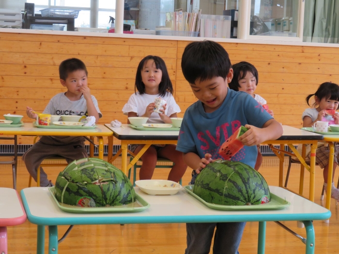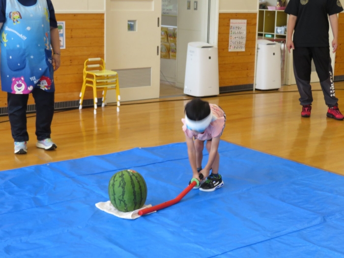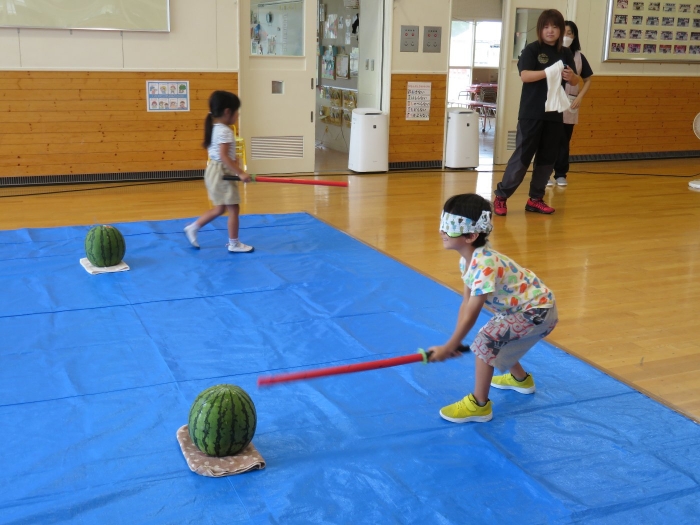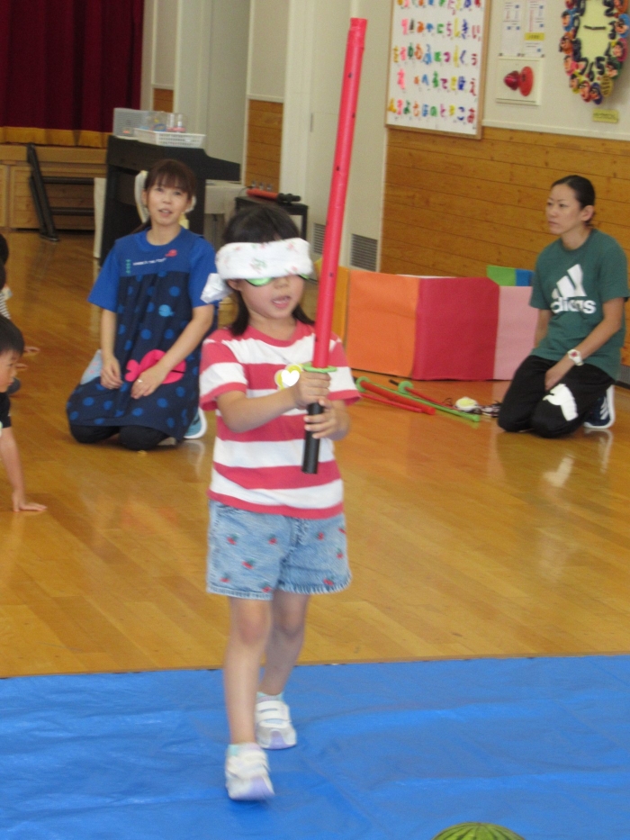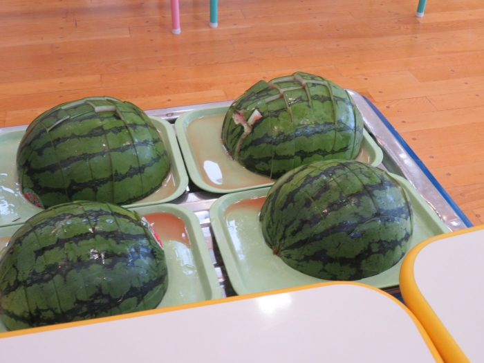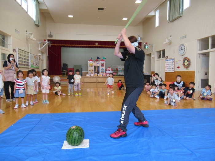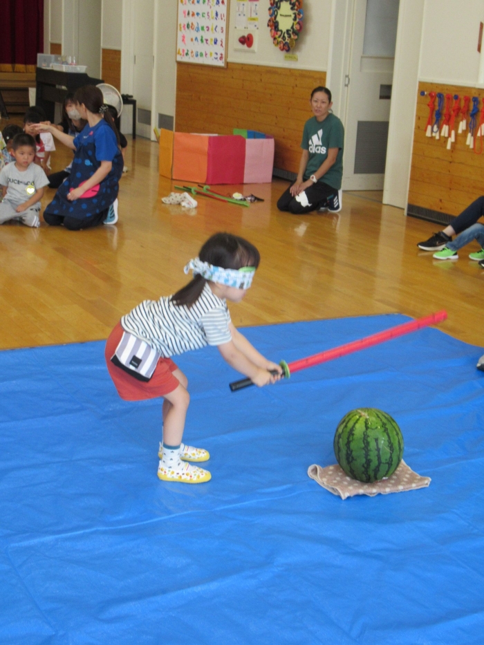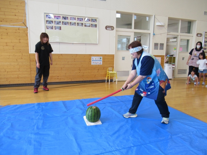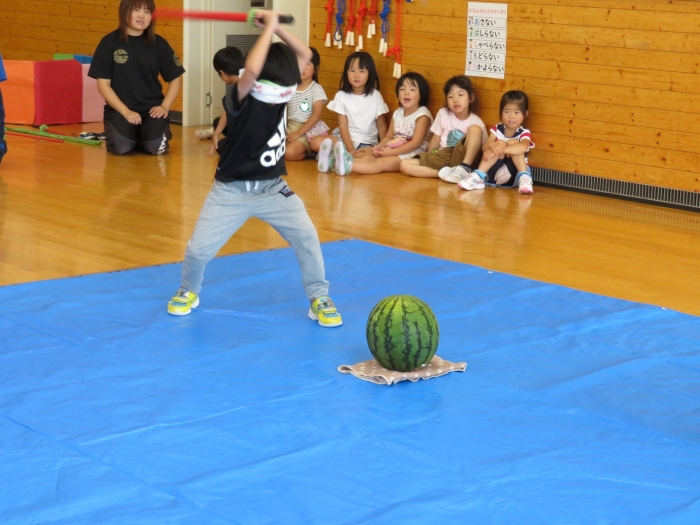 今日は、8月生まれさんの誕生会。つくしさん3名、たけのこさん1名のお祝いでした。今日の日をとても楽しみにしていたようで、ステージではかなりテンション高めの4名でした(笑)。質問コーナーや歌のプレゼント等、一年の一度みんなにお祝いしてもらい、笑顔いっぱいの4名でした。さて、今日のお楽しみはスイカ割り!今年のスイカは、かなりビッグ!昨年は、なかなか割れずに苦労しましたが…今年は無事に割れたかな?