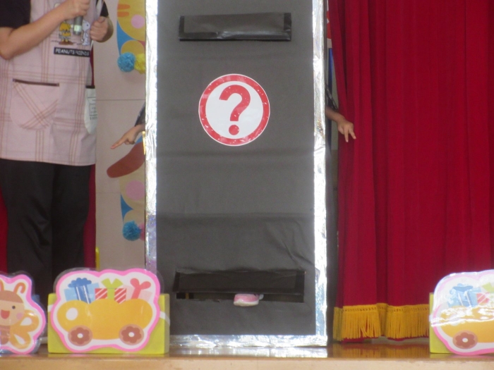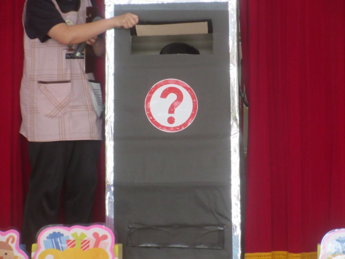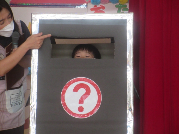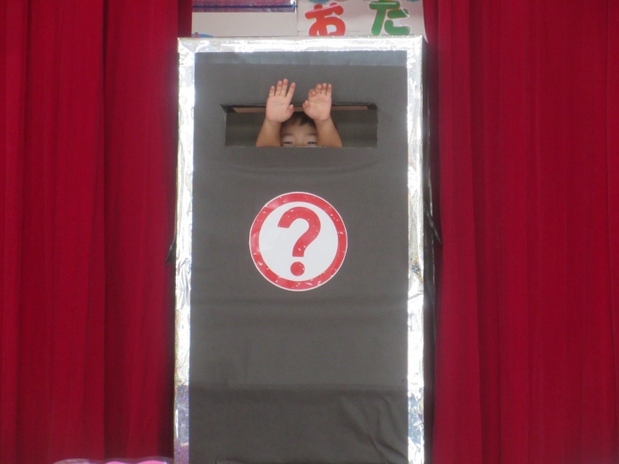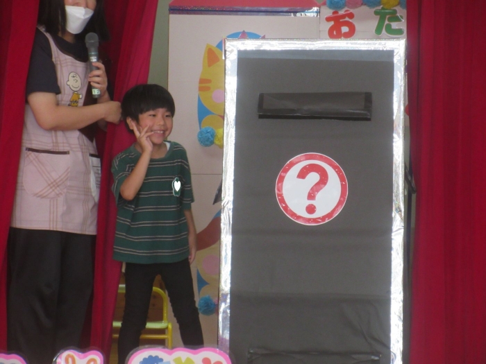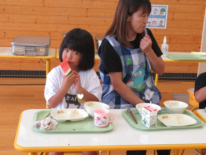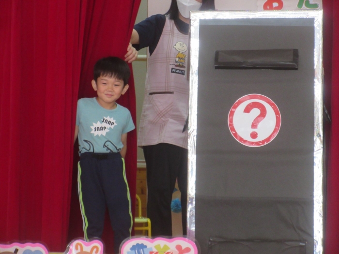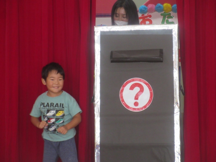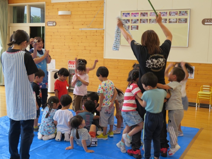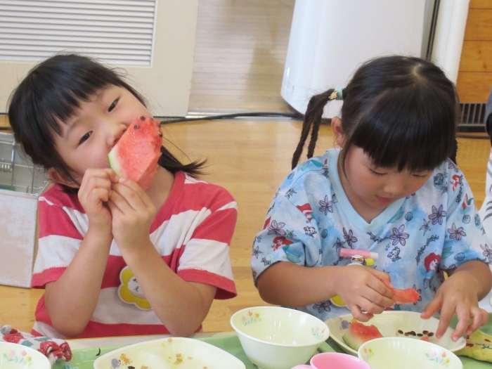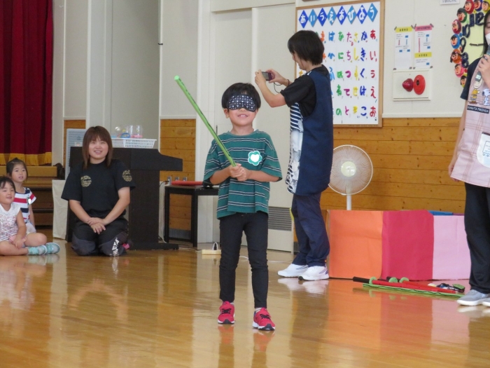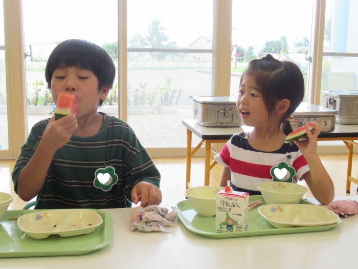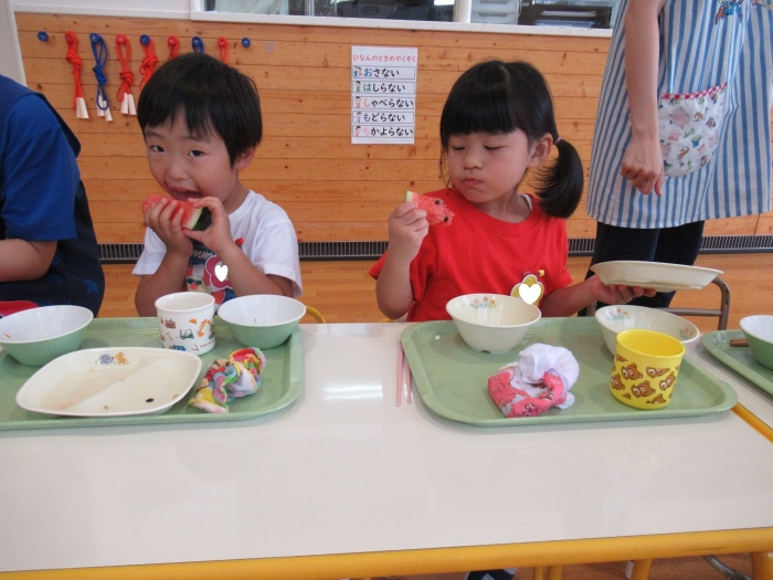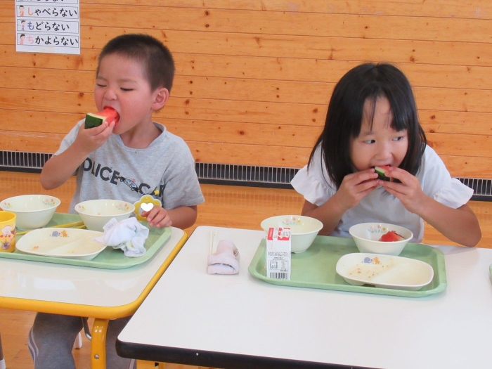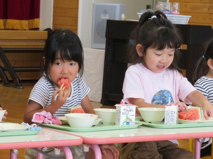 今日は、8月生まれさんの誕生会。つくしさん3名、たけのこさん1名のお祝いでした。今日の日をとても楽しみにしていたようで、ステージではかなりテンション高めの4名でした(笑)。質問コーナーや歌のプレゼント等、一年の一度みんなにお祝いしてもらい、笑顔いっぱいの4名でした。さて、今日のお楽しみはスイカ割り!今年のスイカは、かなりビッグ!昨年は、なかなか割れずに苦労しましたが…今年は無事に割れたかな?