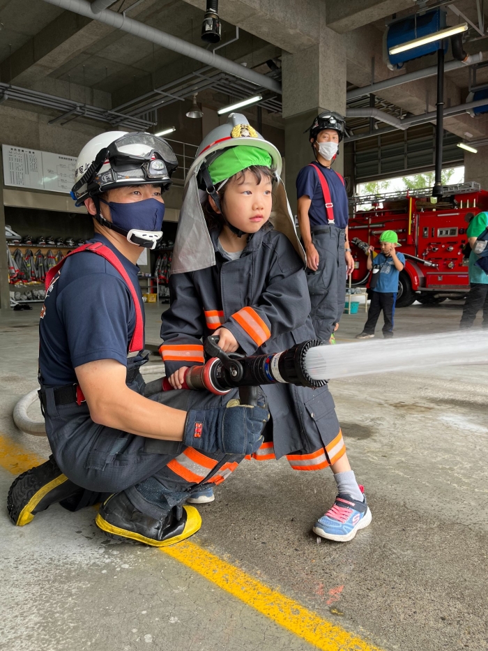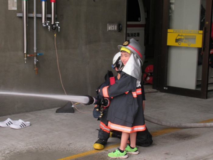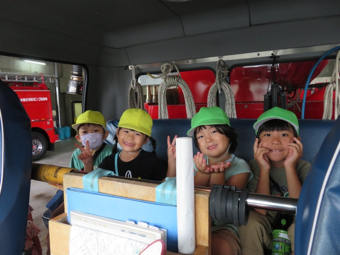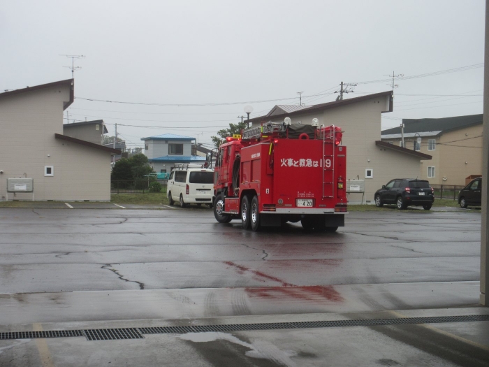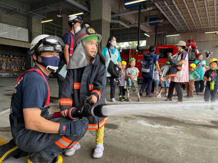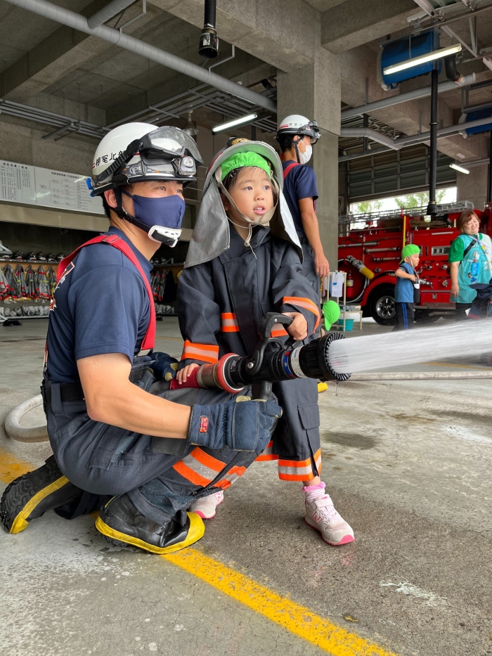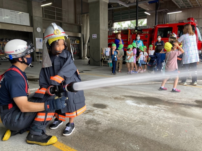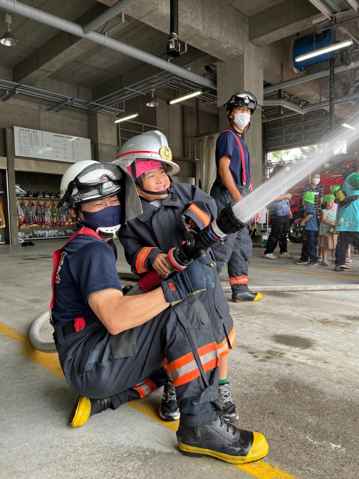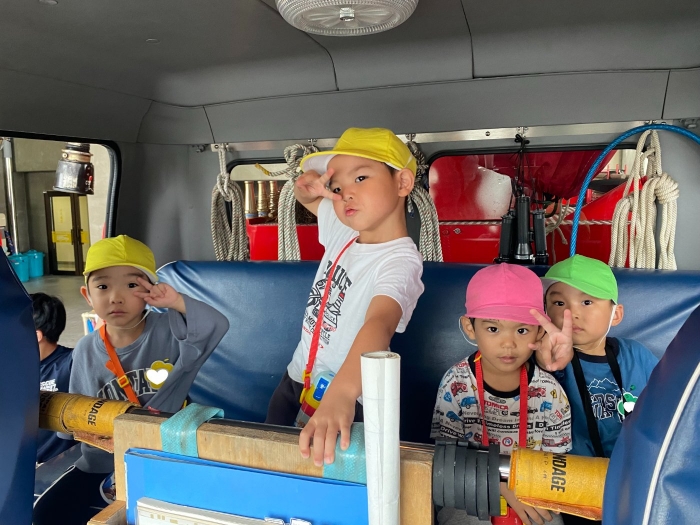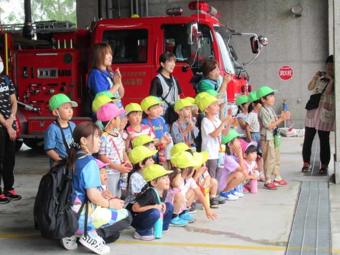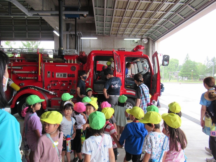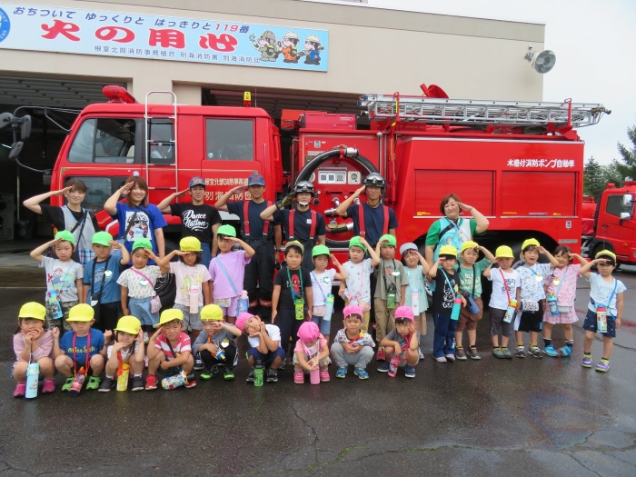 今日は、別海町消防署西春別支署の見学へ行ってきました。先日、火災を想定した訓練を実施していたこともあり、消防士さんのお話を真剣に聞いている様子がありました。お話を聞きながら署内の見学、救急車や消防自動車に乗車、消防士さんの早着替えと出動の様子の見学、実際に放水体験もさせていただきました。きびきび動く消防士さんに憧れ、「消防士になりたい!」というお友達もいましたよ。