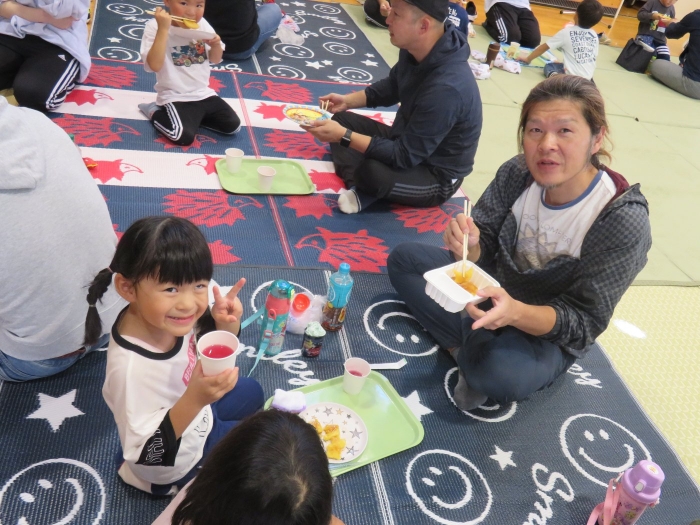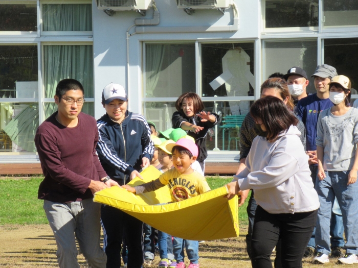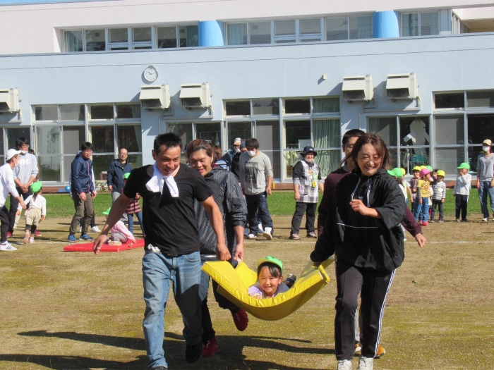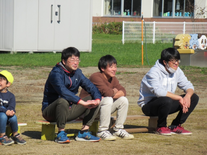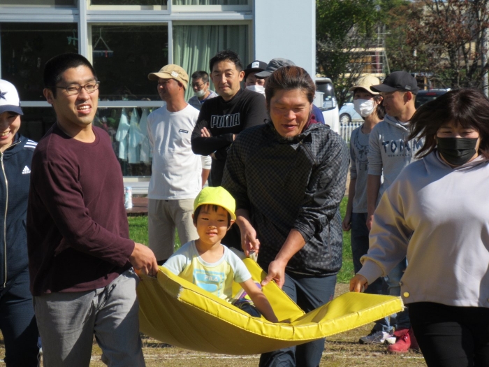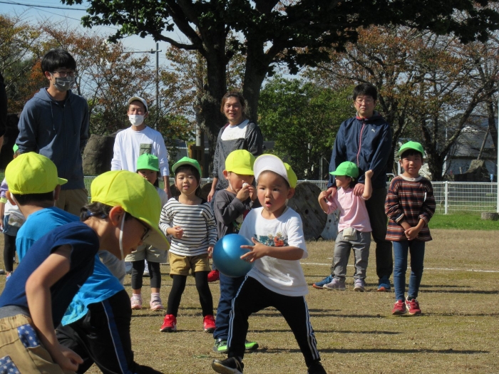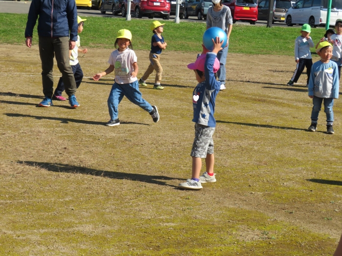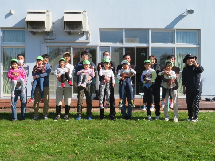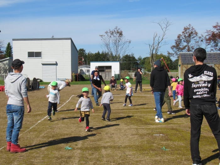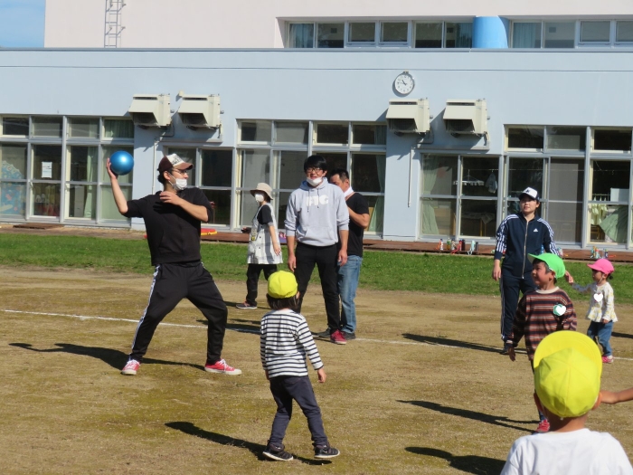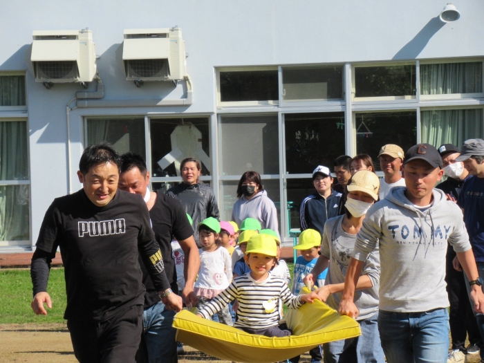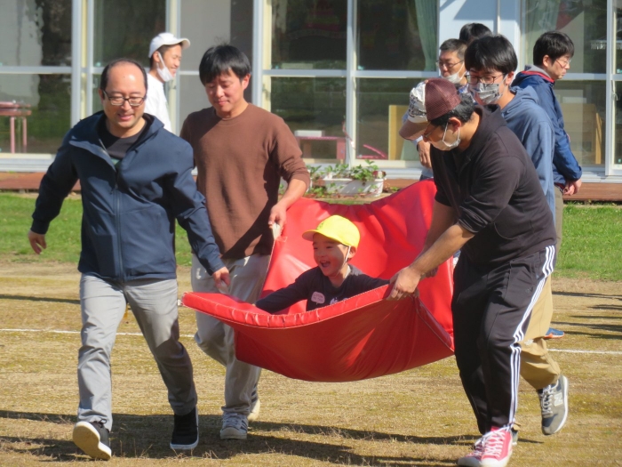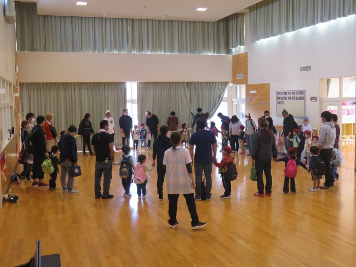 今日は、土曜参観日。昨年までは3学期に行っていましたが、天候に悩まされることが多かったため、2学期に実施することにしました。今日は秋晴れの中、一人も欠席することなく全員参加で行うことができました。朝の会を参観後は、戸外でゲーム。ゲームは、かなり盛り上がっていましたよ。子ども達はもちろん、お父さんお母さんも本気で参加してくださり、たくさんの笑顔が見られていました。今日一日、園での子ども達の様子や参観を通しての感想や気になったこと等、是非連絡帳などで教えていただけると嬉しいです。参加してくださいました保護者の皆様、お忙しい中ありがとうございました。