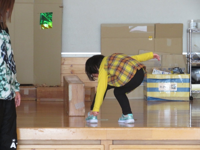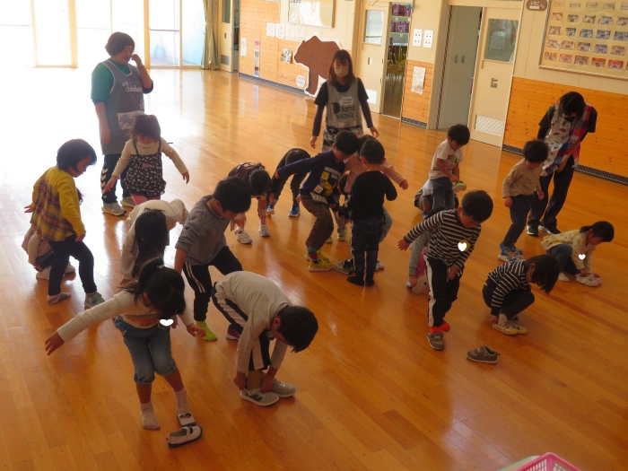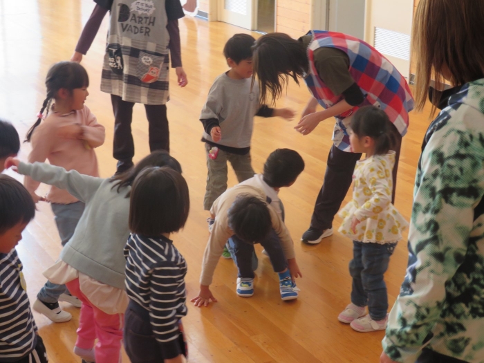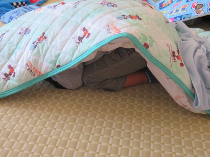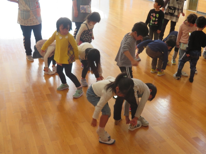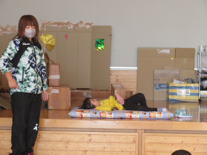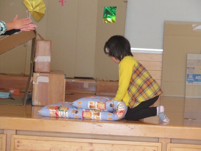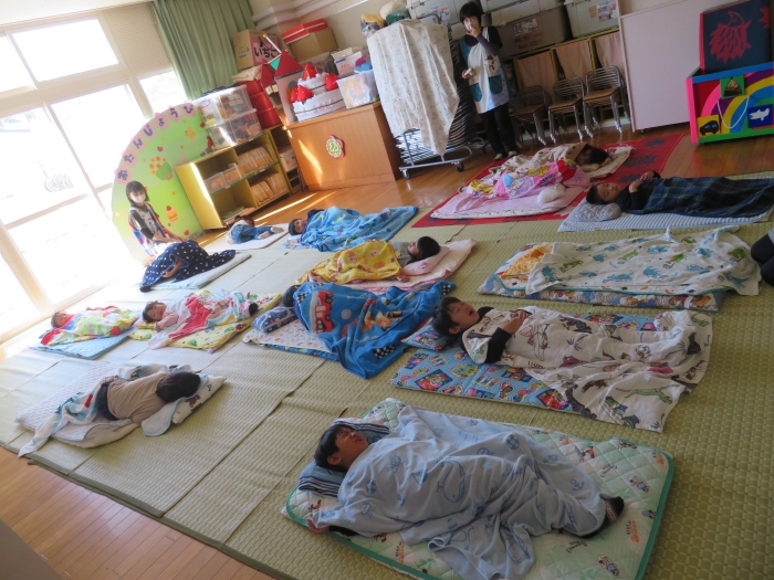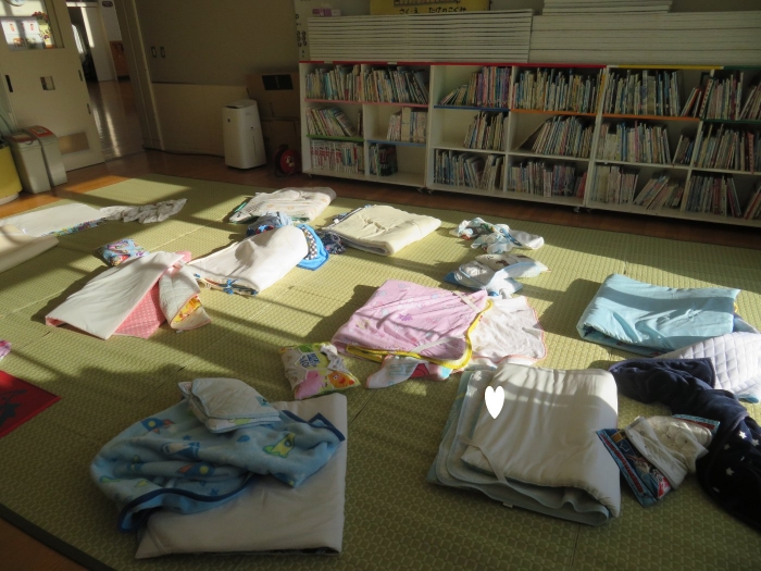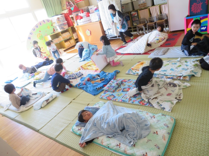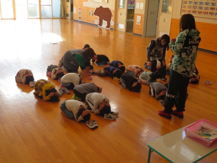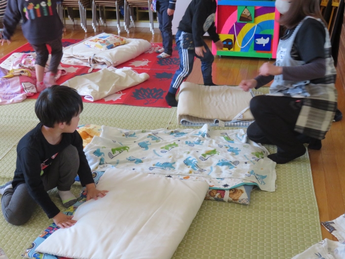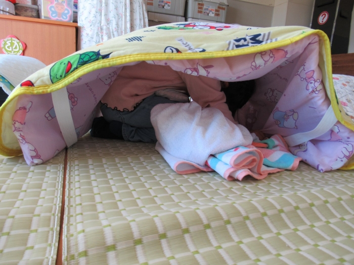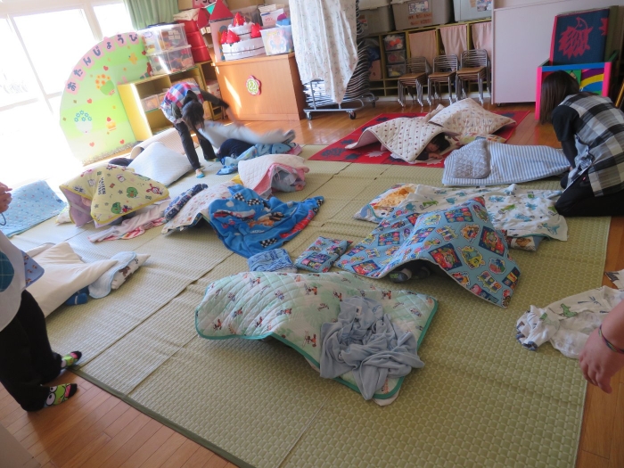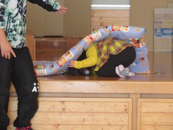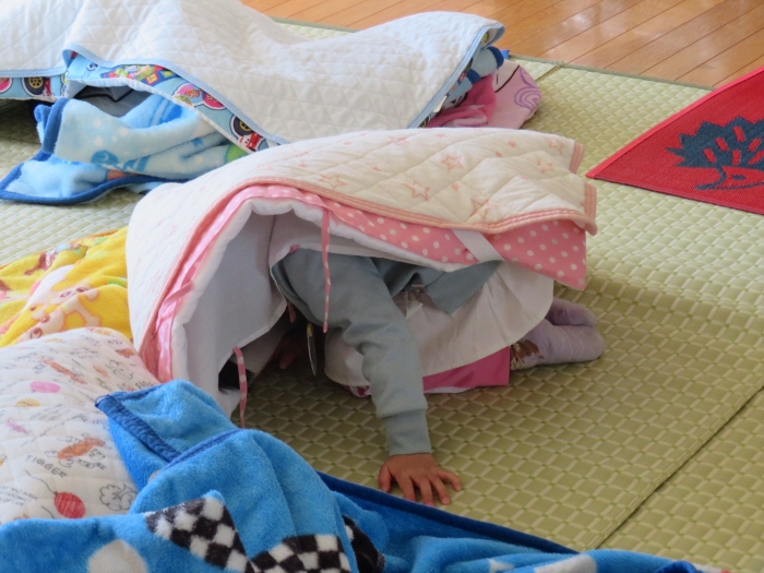 午睡明けの避難訓練 2023年10月24日(火) 行事 今日は、午睡明けの避難訓練を行いました。お昼寝中に地震が起きたらどのような行動をとれば良いのか、たけのこさんにお手本を見せてもらいながらお話を聞き、その後、いちごさん・つくしさんは実際に練習をしました。 寝ている時に地震が来たらどうする? 布団の下に入り頭を守りましょう 避難する時は、布団を半分にたたみますよ 靴は立って素早く履こう ダンゴムシの姿勢から… 急いで靴を履く練習 たけのこさんは、さすが素早い! つくしさん・いちごさんも練習していたので 素早く履けるようになってきました いちごさん・つくしさん、寝ている所からの練習 非常ベルが鳴りました!素早く起きて 布団の下に隠れて体を守ります ダンゴムシの姿勢で待ち 先生のお話に耳を傾けます いちごさんも覚えてね 布団は半分にたたむんだよね、よいしょ 実際の訓練後の午睡室 練習と同じようにできました