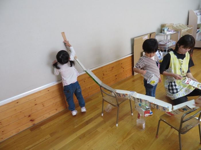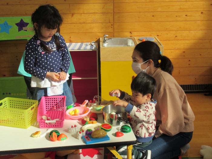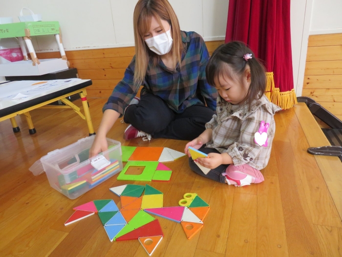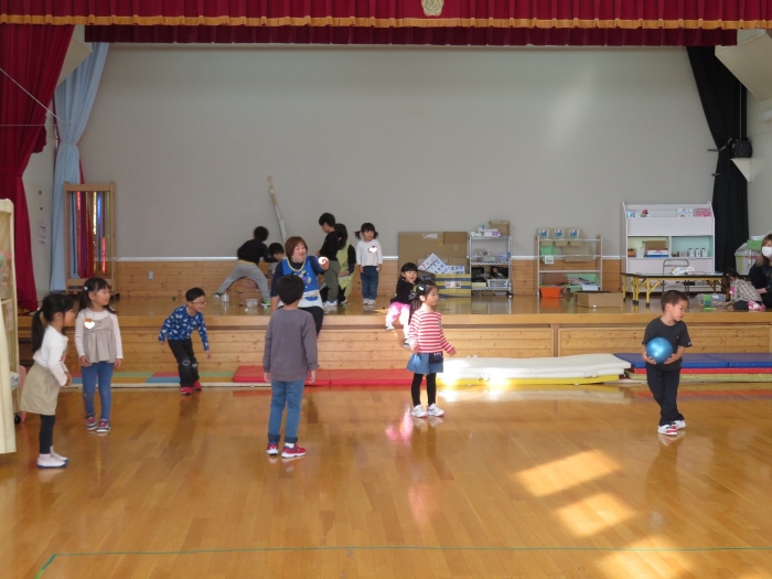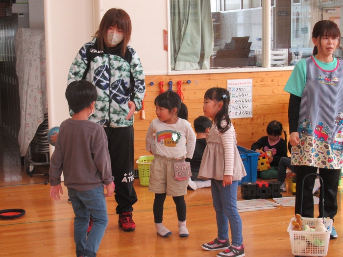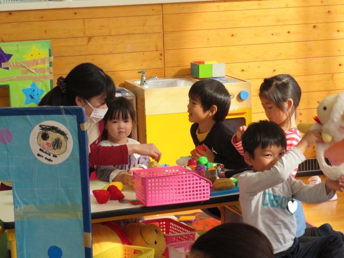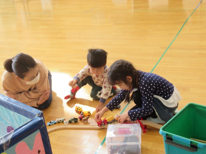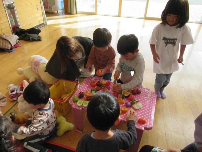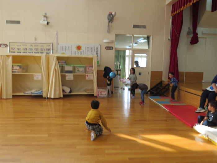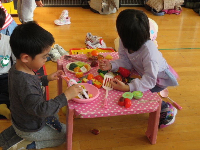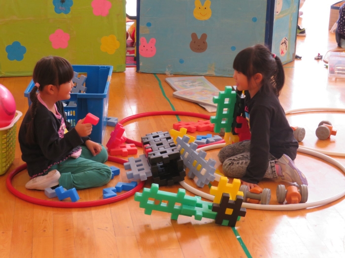 今日は、にこぴんクラブ、4組の親子が遊びに来てくれました。つくし組・たけのこ組は、ゆめの会に向けての話し合い後、プレイルームに出てきて一緒に遊びました。たけのこさんは、小さなお友達と遊ぶことが上手になりましたね。3年間のにこぴんの成果でしょうか。つくしさん、いちごさんは、自分のやりたい遊びを楽しんでいるお友達が多かったようです。次回のにこぴんは、12月6日(水)です。