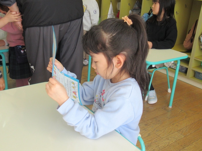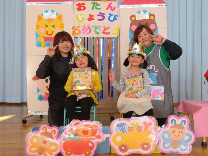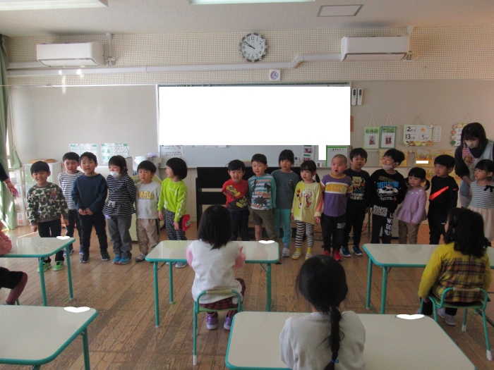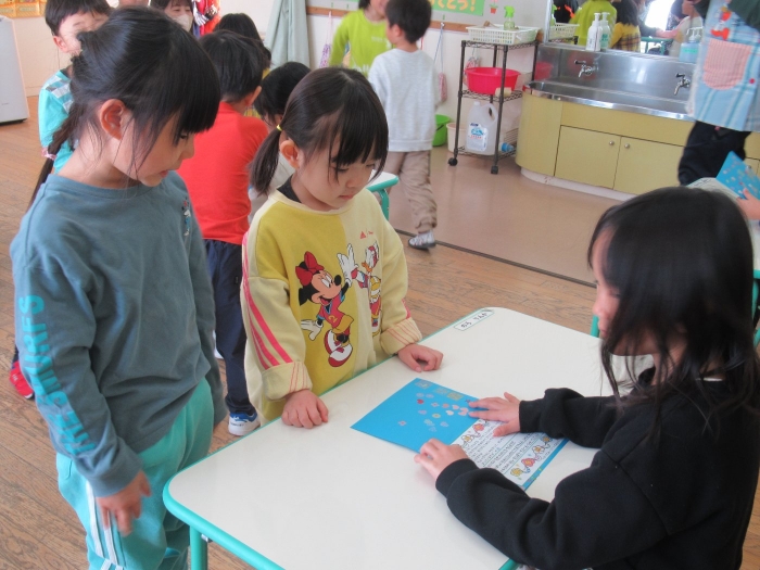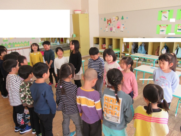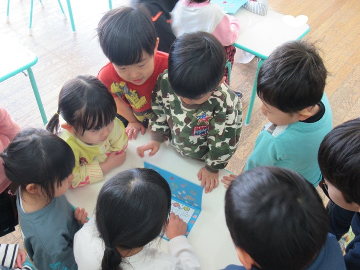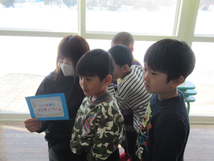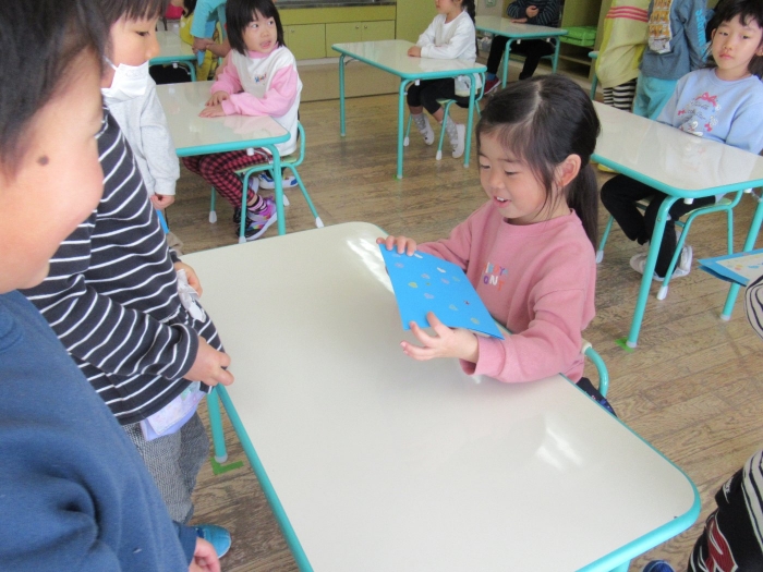 今日は、誕生会が始まる前にもう一つ出来事が。いちごさん・つくしさんが、たけのこさんへお別れ会の招待状をお届けに行っていました。そんなことを全く予想していなかったたけのこさんは、「えっ!どうしたの?」と、ビックリ&大喜びだったようです。