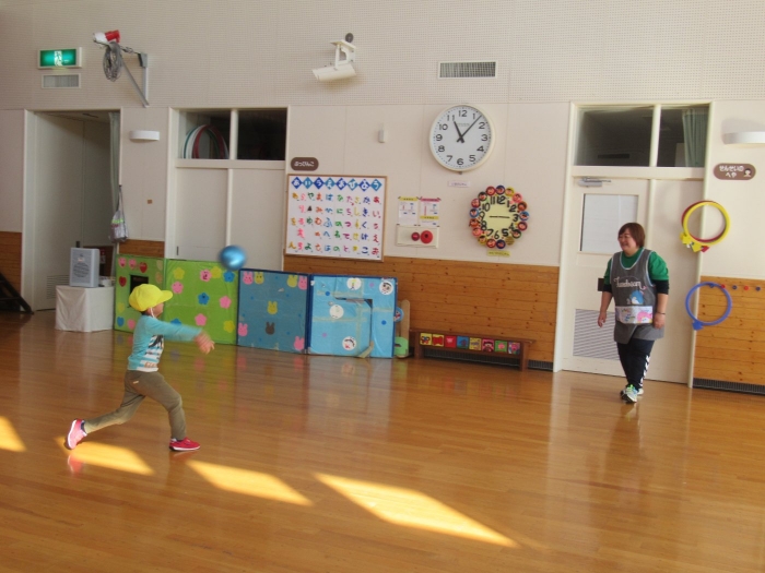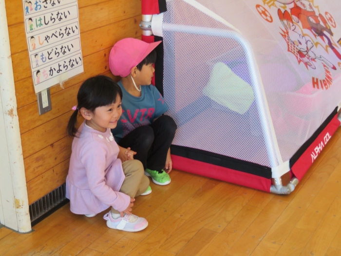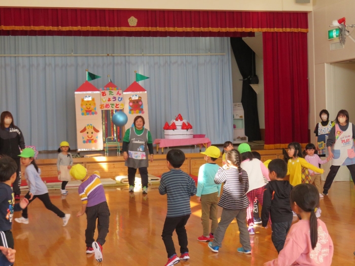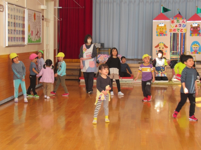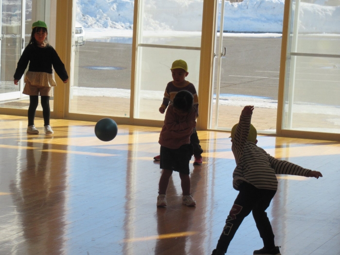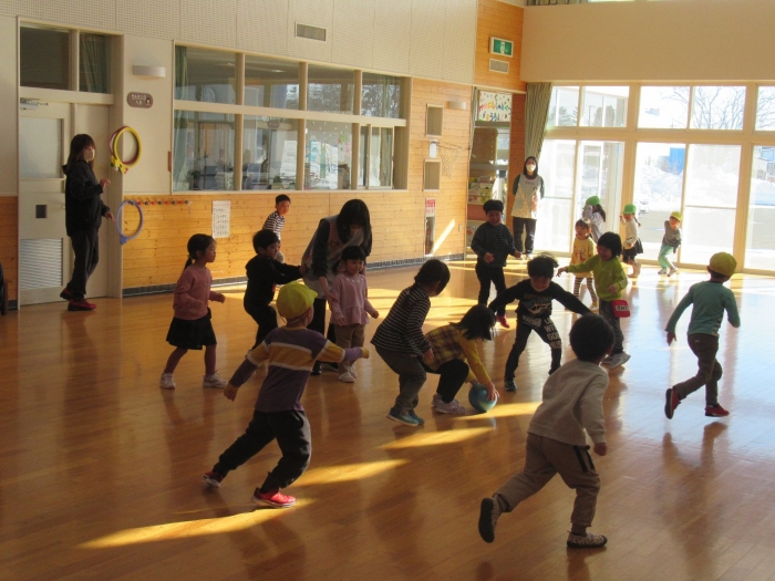 今日は、2月生まれのお友達の誕生会でした。2名の誕生児さんは、ステージ上でとてもハキハキと嬉しそうに自己紹介をし質問にも答えていました。自分の誕生会が来ることを、心待ちにしていたのでしょうね。今日のお楽しみは『かたき』。今年度はドッヂビーを使ったかたきが人気ですが、本来はボールを使った遊びで、今日はボールを使いチーム戦で行いました。第1回戦は、帽子チームVS帽子なしチームの対決。第2回戦は、子どもチームVS先生チームの対決。どちらも白熱しました!