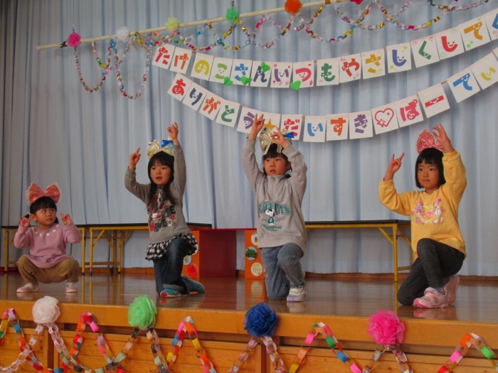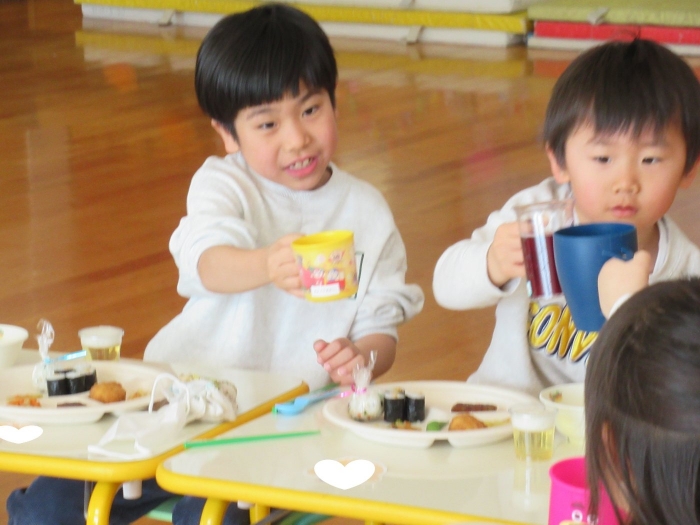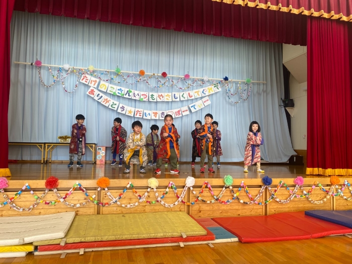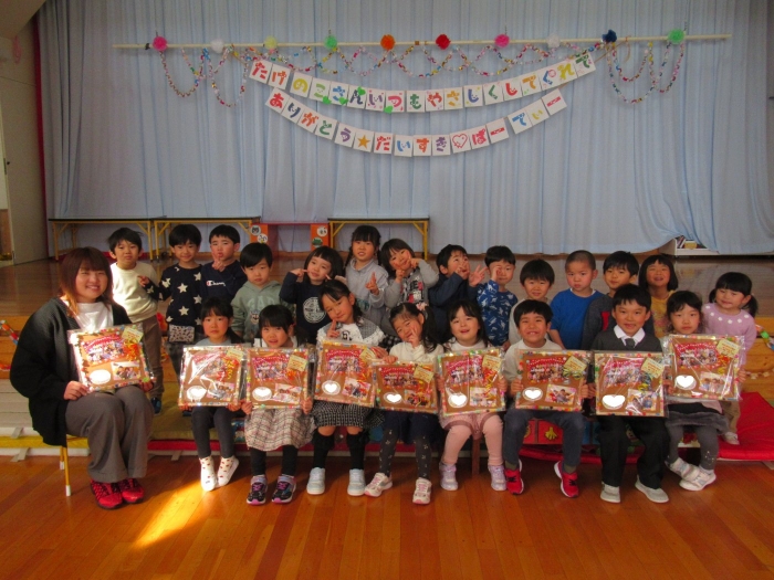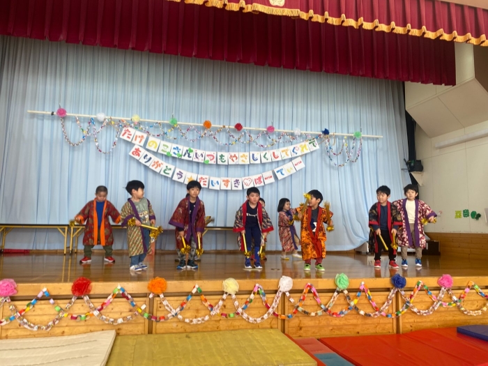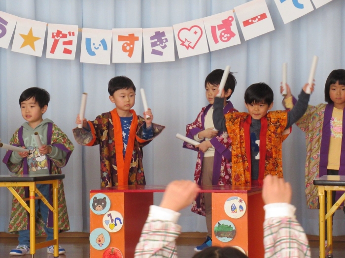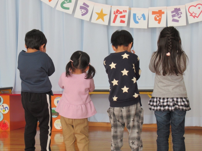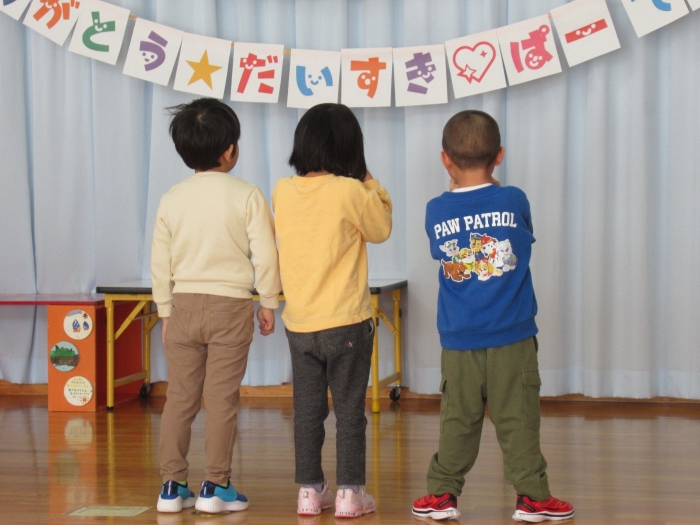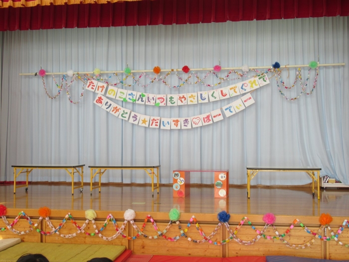 今日は、待ちに待った『たけのこさん・いつもやさしくしてくれてありがとう☆だいすき♡パーティ』でした。昨日は臨時休園、そして今日は10時登園になり、事前の準備にかなり変更がありましたが、無事に行うことができてホッとしました。この一か月、大好きなたけのこさんのために協力して準備をしてきたつくしさん・いちごさん。張り切って出し物を披露したり、一生懸命進行したりする姿は、とても頼もしく見えました。つくしさん・いちごさんの気持ちは、間違いなくたけのこさんに届いていると思います。それでは、写真と共にパーティーの様子をご覧ください。