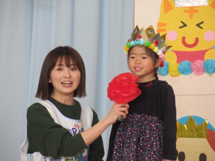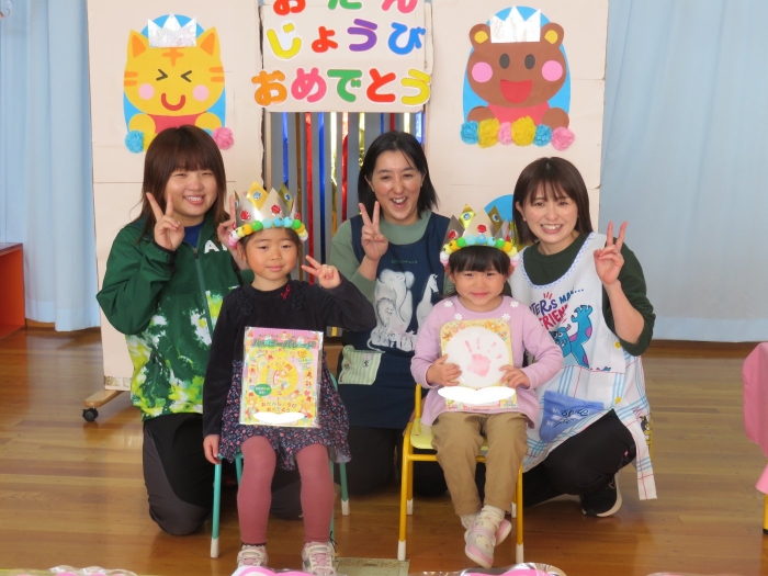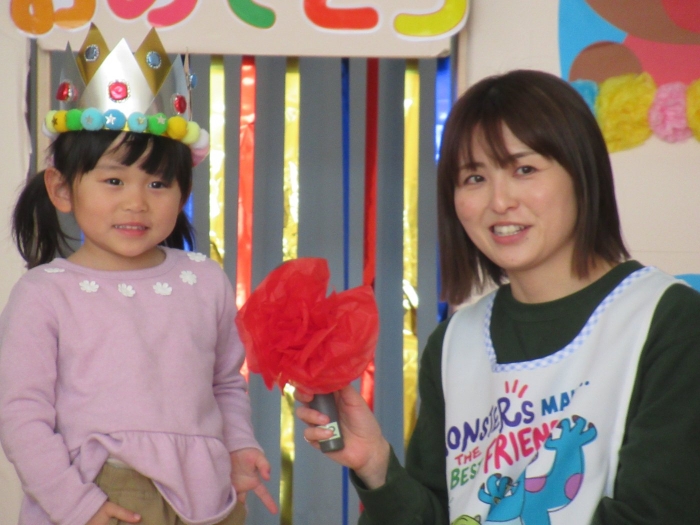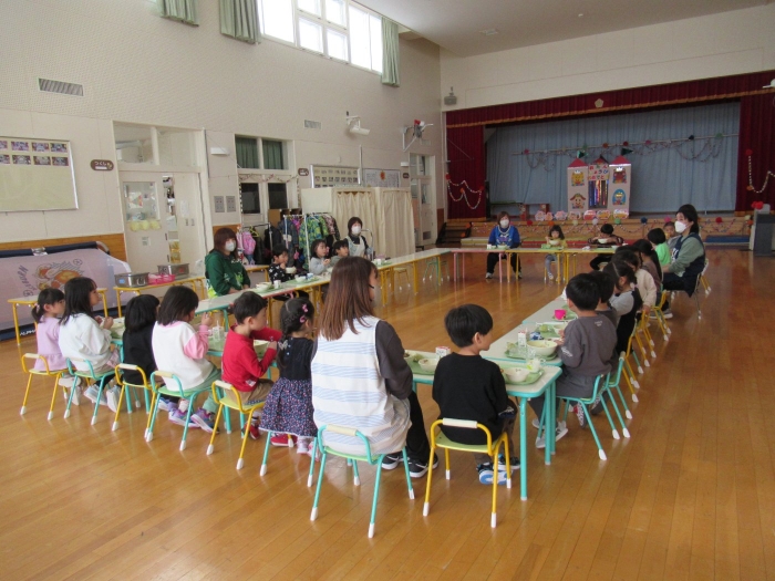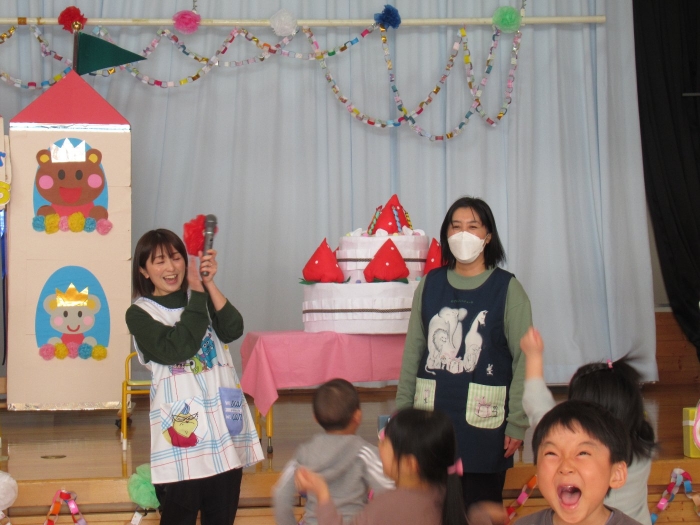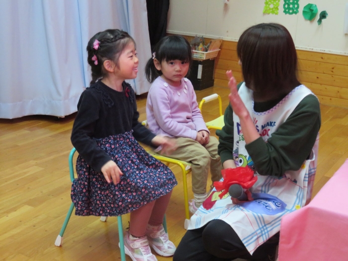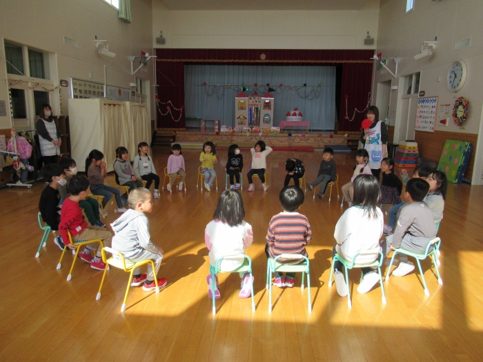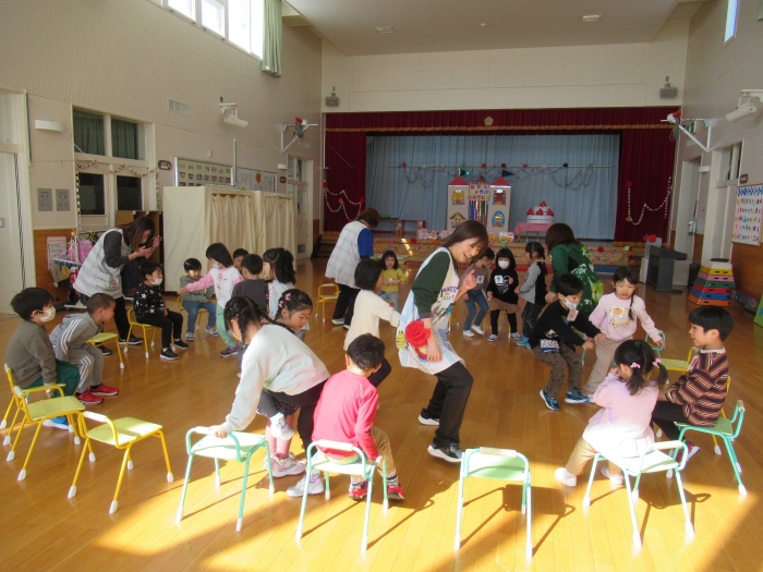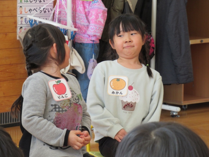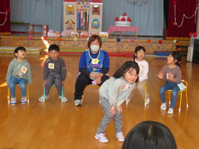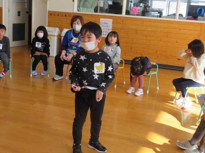 今日は3月のお誕生会、たけのこさん1名、つくしさん1名、いちごさん1名のお祝いでした。約一年間、たくさんのお友達をお祝いしながらこの日を待っていたでしょうね。つくしさんのお友達は参加できなかったため、改めてお祝いをしてあげたいと思います。今日のお楽しみは、『フルーツバスケット』。お父さんお母さんも一度はやったことがある遊びだと思います。フルーツだけでなく、たけのこさんの写真が貼ってあるカードを使って『たけのこバスケット』もやりました。たけのこさんは、自分の名前が呼ばれてうっかり動いてしまうことも(笑)。たけのこさん、幼稚園最後の誕生会楽しめたかな?