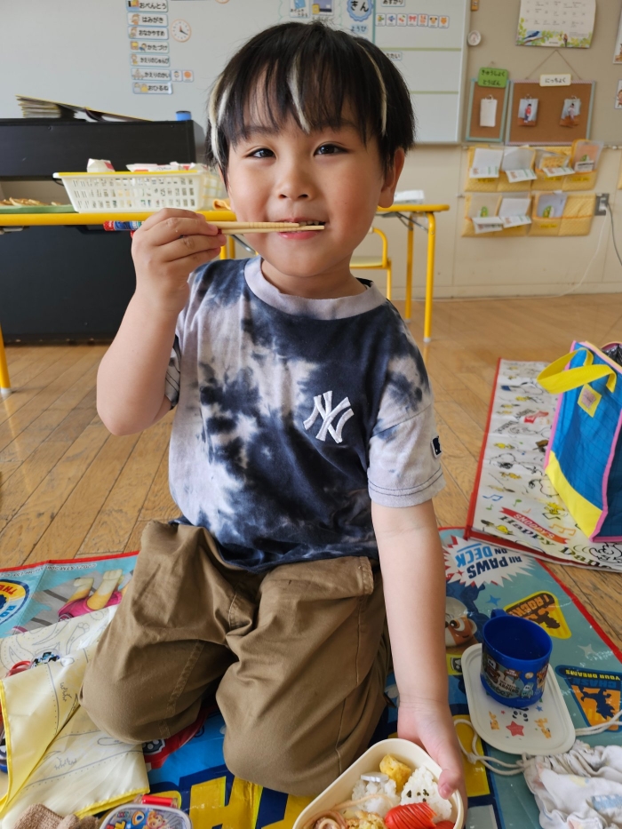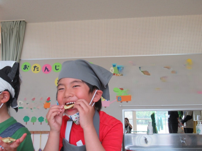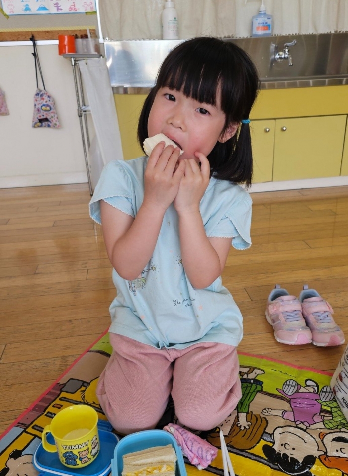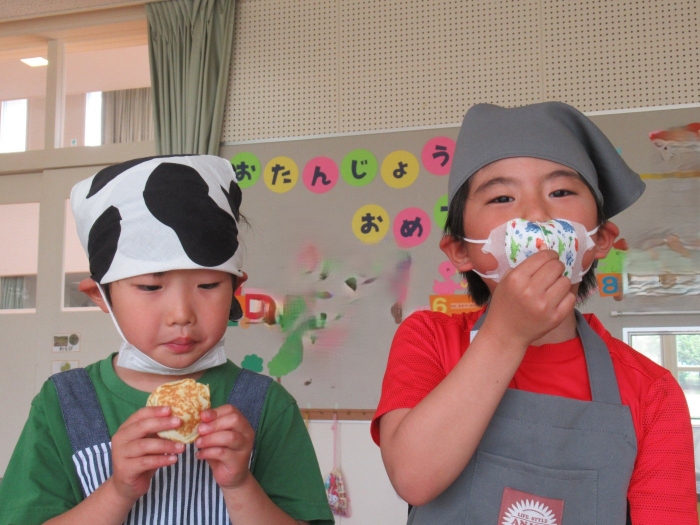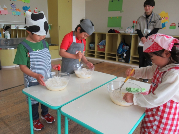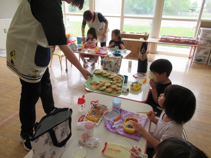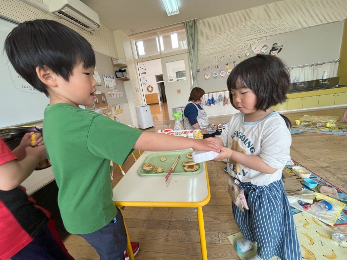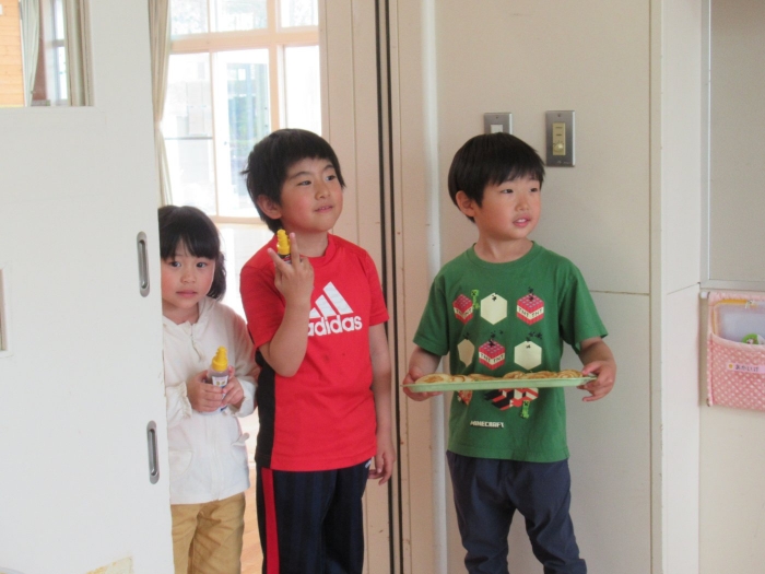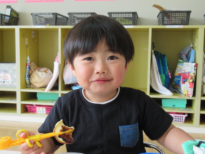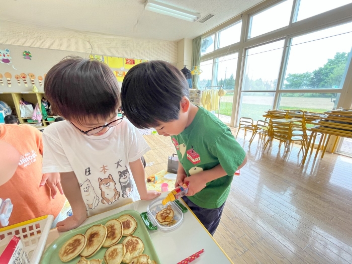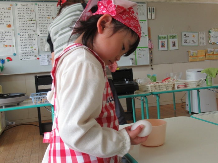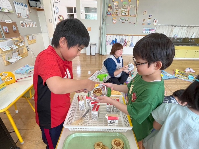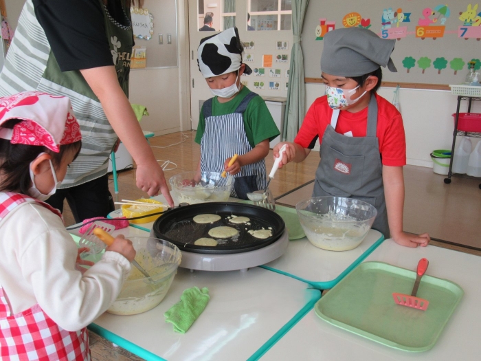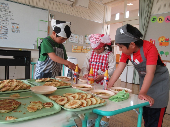 そして、迎えたクッキングの30日(金)! 最初の難関、 エプロン、三角巾も自分で身に付け、調理道具・材料を取り揃え、手順を聞きながら全ての工程に意欲満々で取り組みました。作ったパンケーキは、もちろん、いちご組・つくし組にもお裾分け! もっと喜んでもらいたいと、お好みのソースを掛ける・絵を描くサービスまで考える姿もありました。 みんなが笑顔になった たけのこ組初クッキング! 今度は、クラス4人揃って行いたい!とのことで、みんなにとって嬉しい第2弾を企画中です。