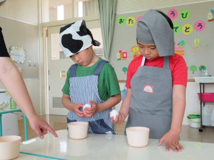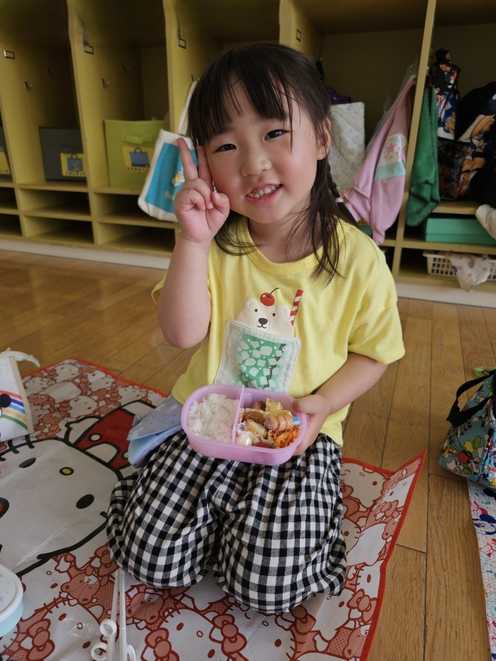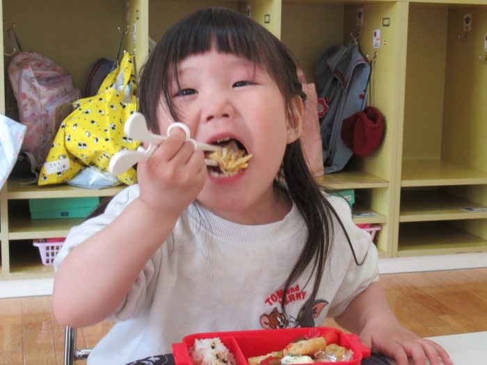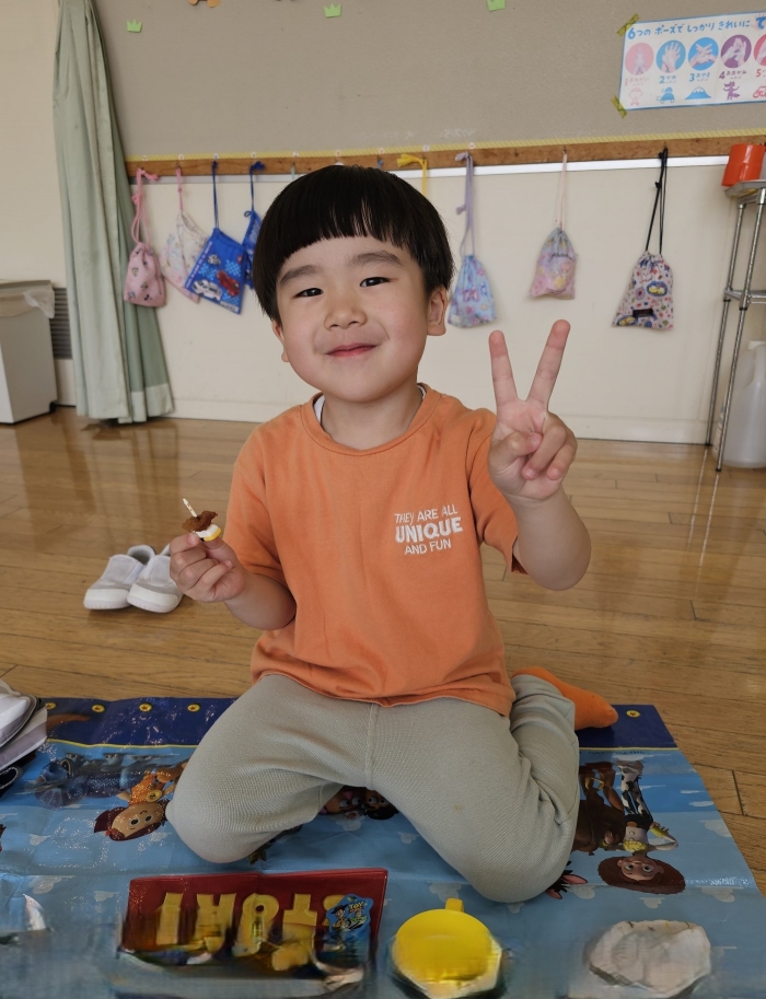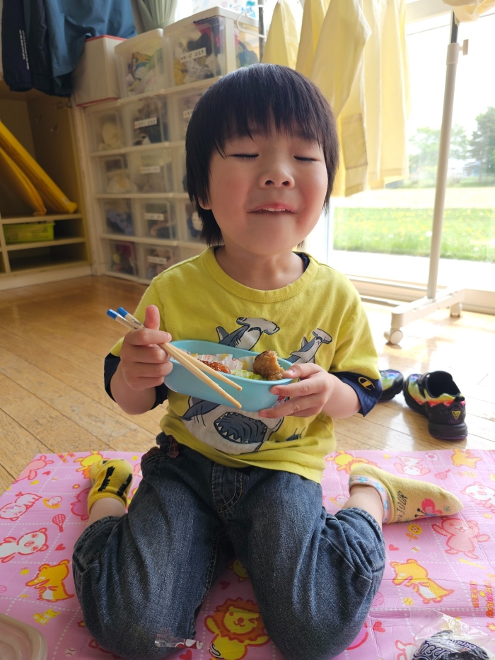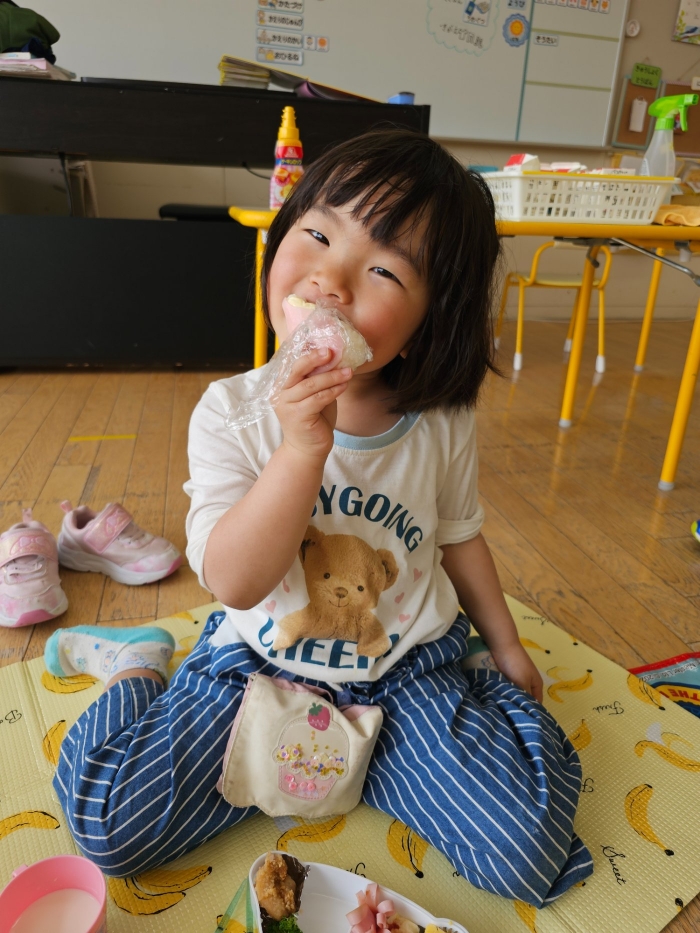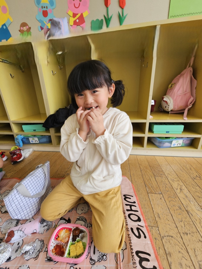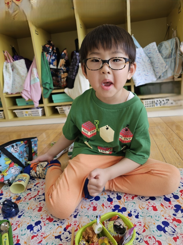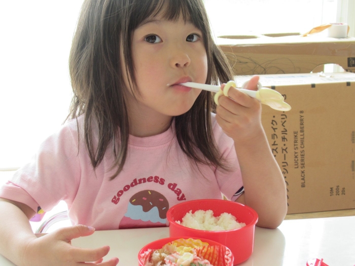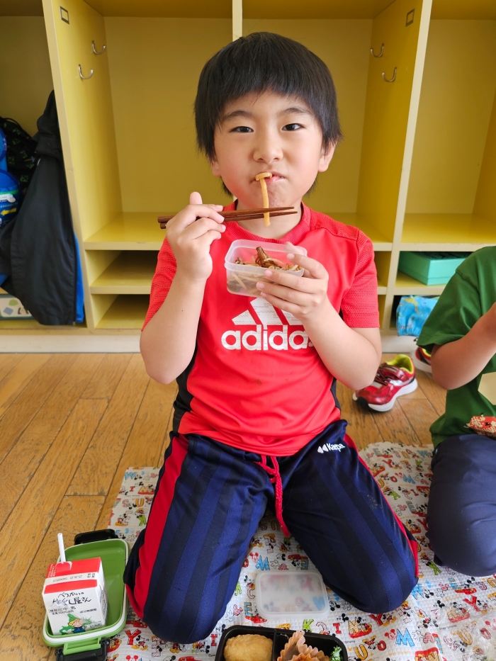 そして、迎えたクッキングの30日(金)! 最初の難関、 エプロン、三角巾も自分で身に付け、調理道具・材料を取り揃え、手順を聞きながら全ての工程に意欲満々で取り組みました。作ったパンケーキは、もちろん、いちご組・つくし組にもお裾分け! もっと喜んでもらいたいと、お好みのソースを掛ける・絵を描くサービスまで考える姿もありました。 みんなが笑顔になった たけのこ組初クッキング! 今度は、クラス4人揃って行いたい!とのことで、みんなにとって嬉しい第2弾を企画中です。