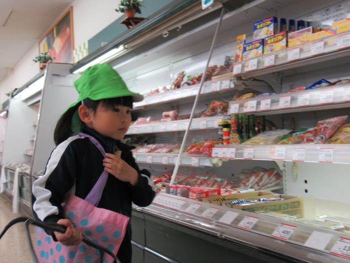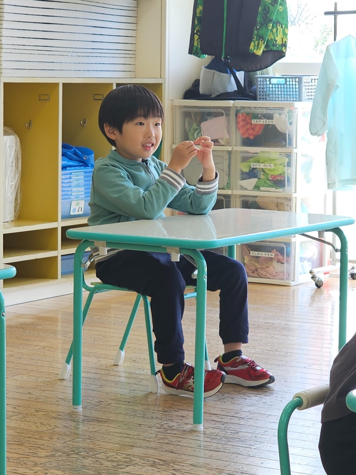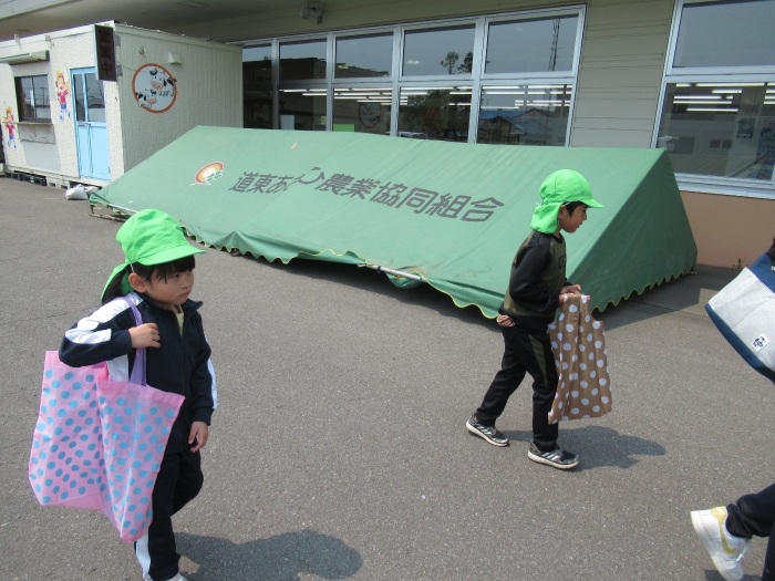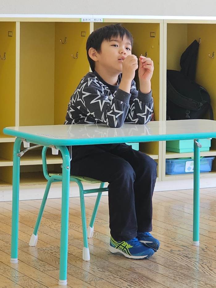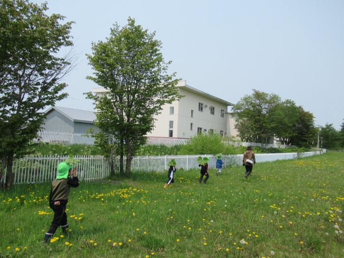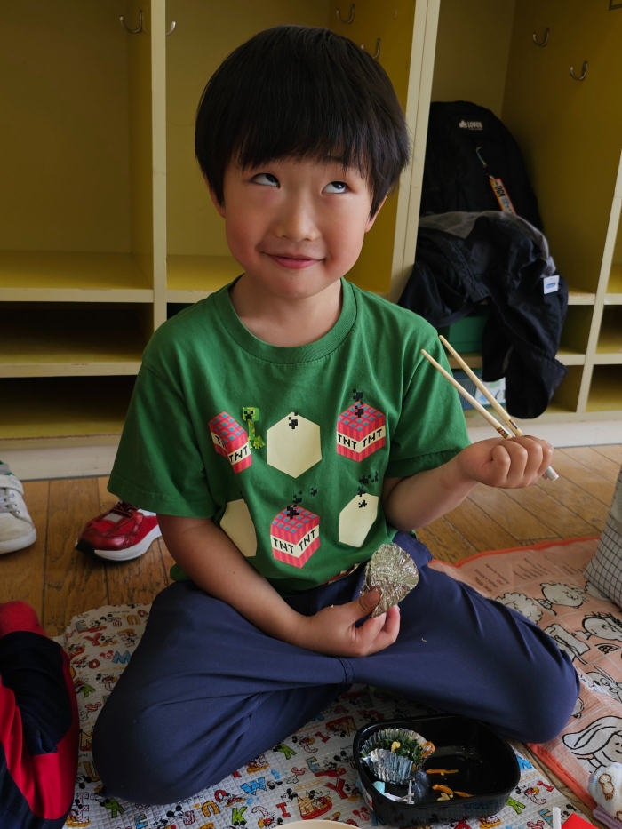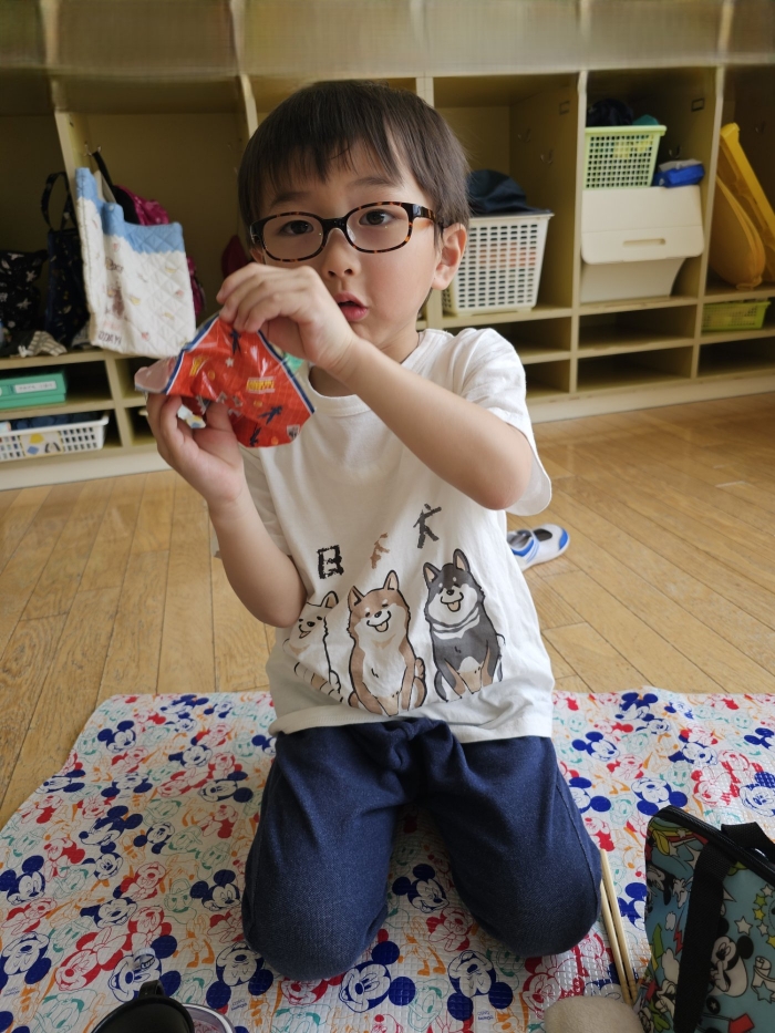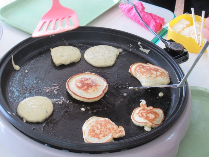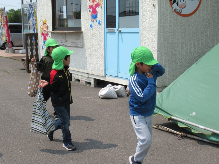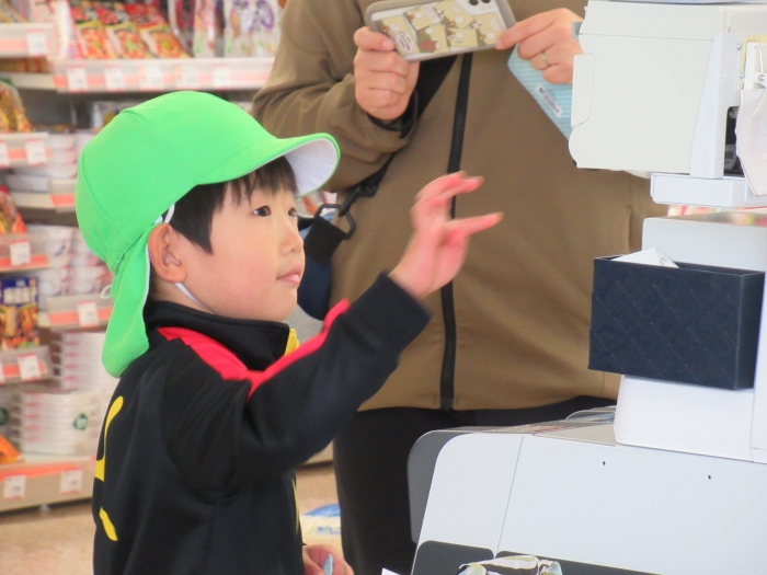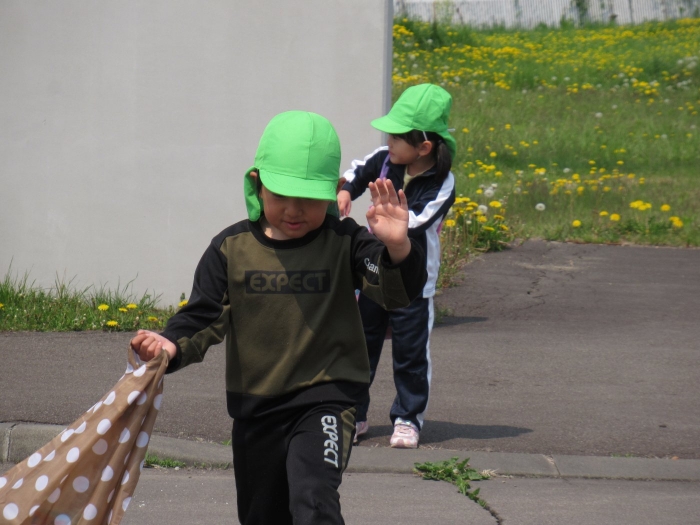 さて、ヨモギを発見した頃から『よもぎパンケーキを作りたい!』と言っていた たけのこ組。歴代の年長組が作って振舞ってくれたこと・味の記憶がよみがえり、後輩たちへ脈々と受け継がれているようです。パンケーキの材料や作り方をお家で聞いてきたり、誰が何を買うか相談し、困った時には助け合いながらAコープで買物をしたり、ヨモギが足りないかもしれないと採りに行くなど、事前の準備も自分達で頑張りました。