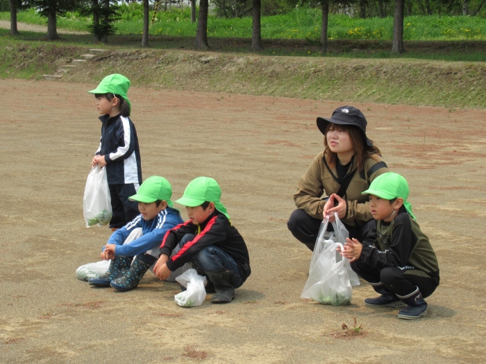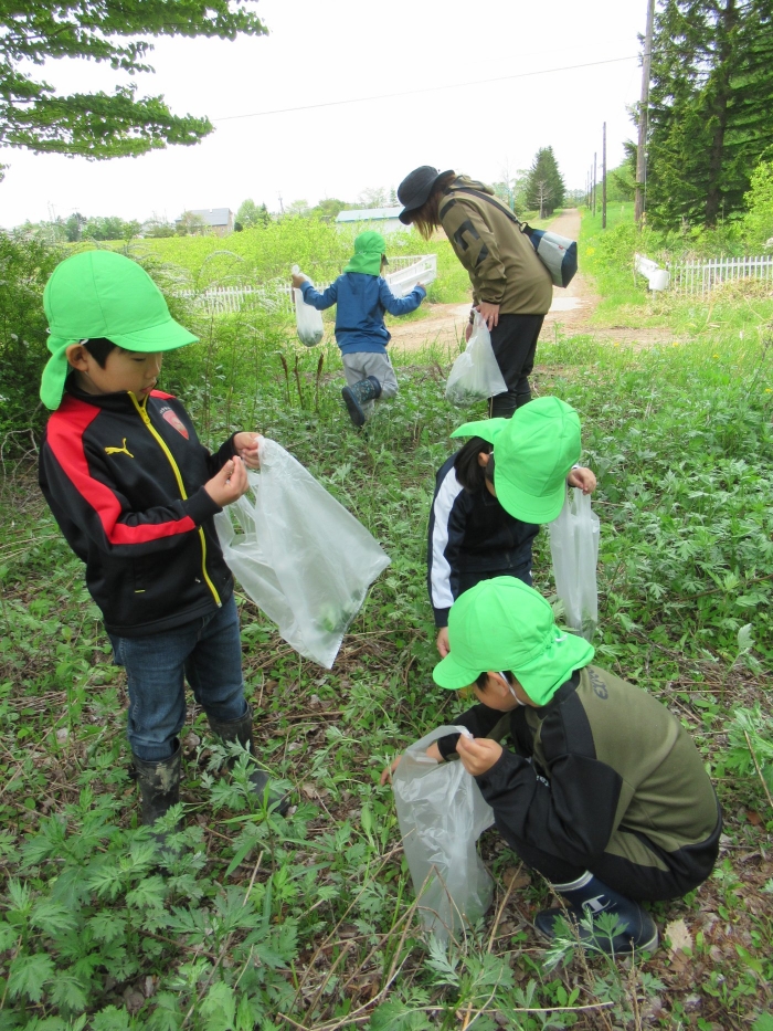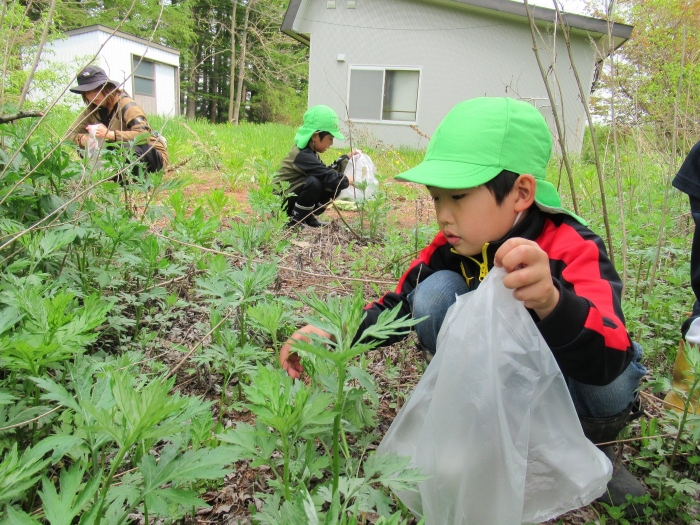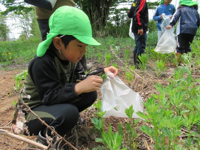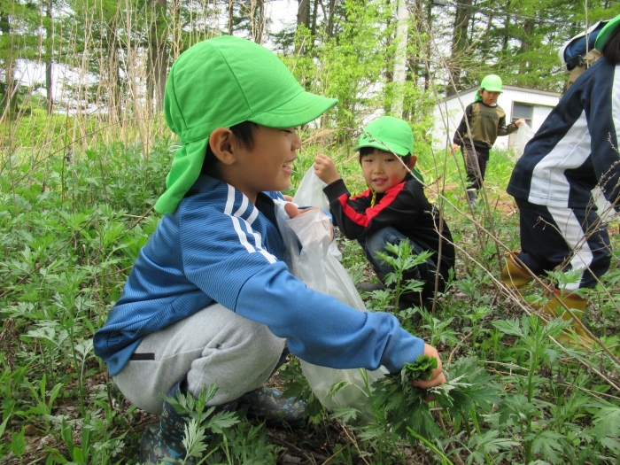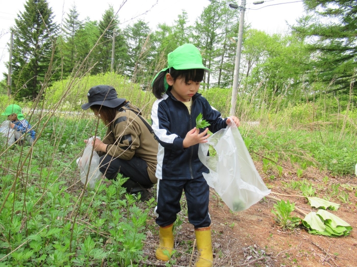フキノトウ、イラクサ、ミツバ、タンポポ、ツクシ、行者ニンニク、ヨモギ、コゴミ…、これまで身近にあるたくさんの自然の恵みを味わってきました。ご家庭でも採りに行ったり、まだ幼稚園で味わっていない山菜(タラの芽、ウド)があると知ると持って来てくださったり、旬を存分に味わい尽くした子ども達。山菜特有の香りや苦みも美味しいと感じられるようになった子もいるほどです。天然素材の味を知る・味覚の発達にもつながっているようです。