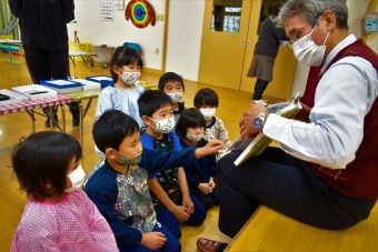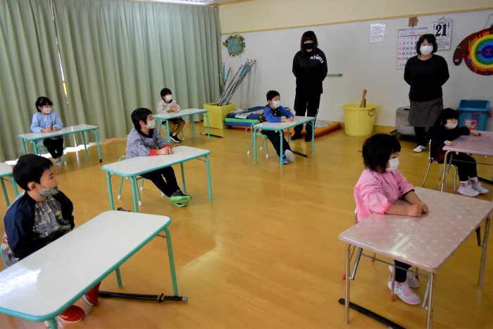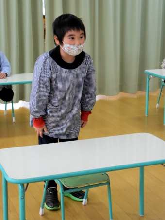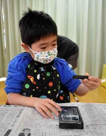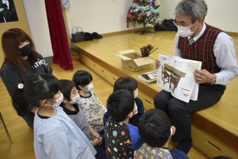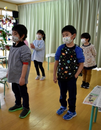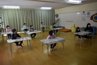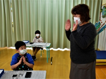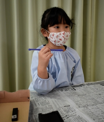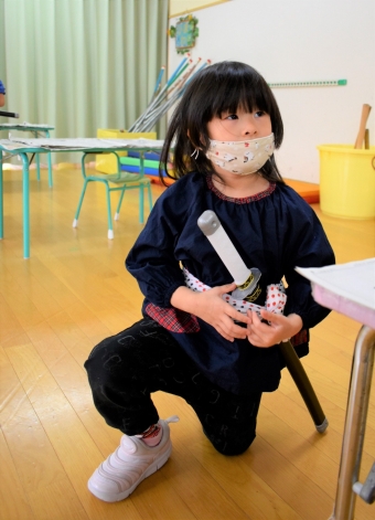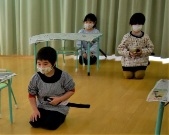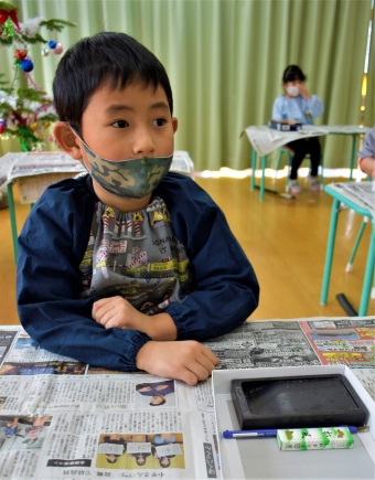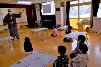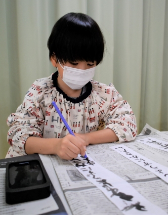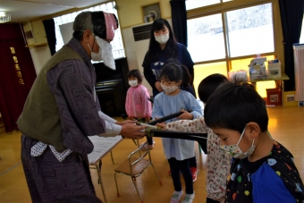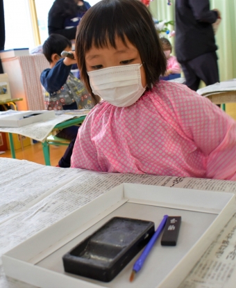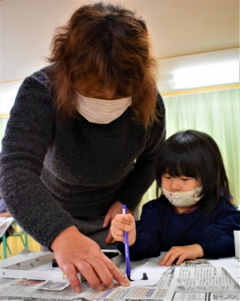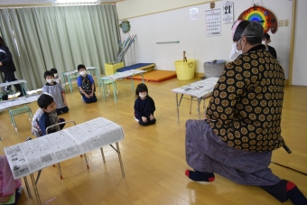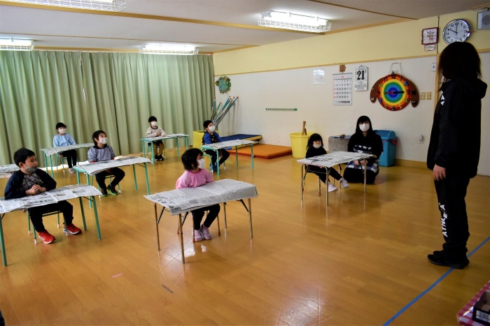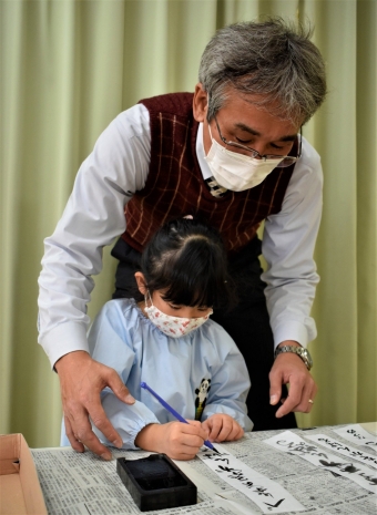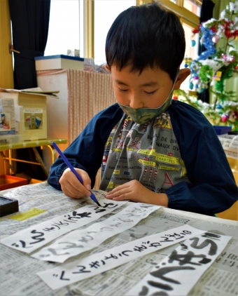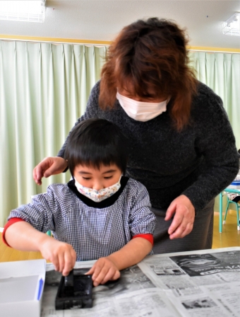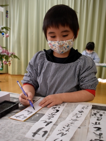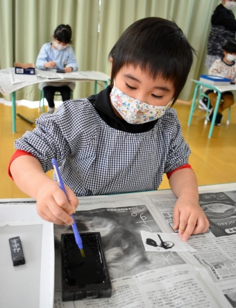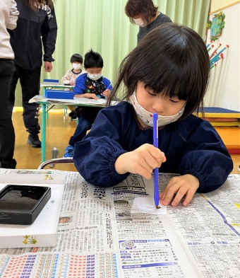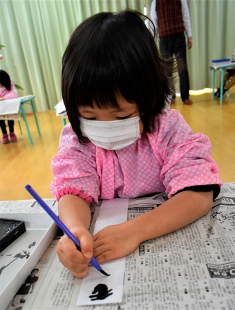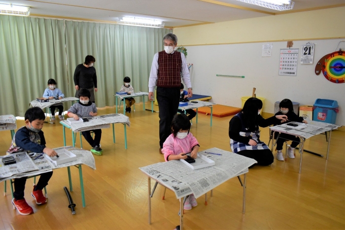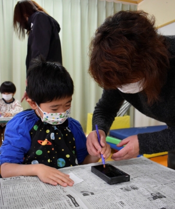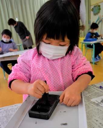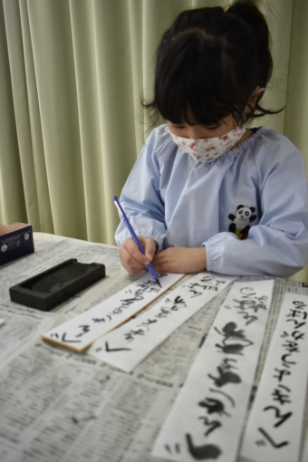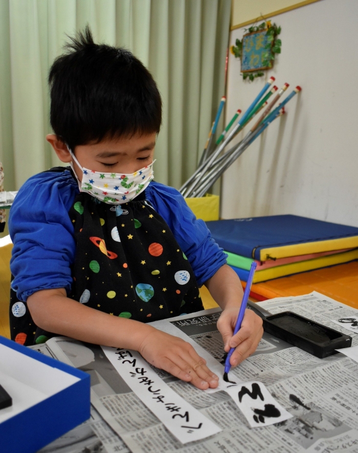 降雪のため遅れてやってきた(演出の)ノリ先生に,仙人とのやり取りを楽しそうに話す純粋な心の子ども達,とても可愛かったです。ノリ先生からは『書道』を教えていただきました。導入として,日本の昔が分かる事典を見せてもらったり,書道の道具や使い方を教わったりし,より書道への興味を高めていた子ども達。『汚さない』(汚さないで書けると字も美しくなる)との約束,目標を掲げ,固形墨から墨液を作るところから始めました。自分で墨の濃淡を確かめ,筆の持ち方・扱い方を教わりながら,年少組は自分の名前を,年長組は小学校での目標を綴りました。知的好奇心を膨らませ,集中して取り組む子ども達の姿勢に,和の心の学びを感じました。