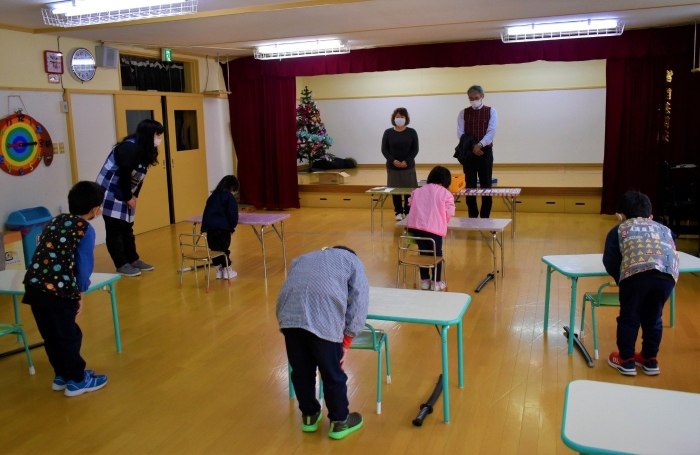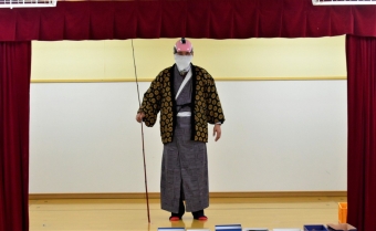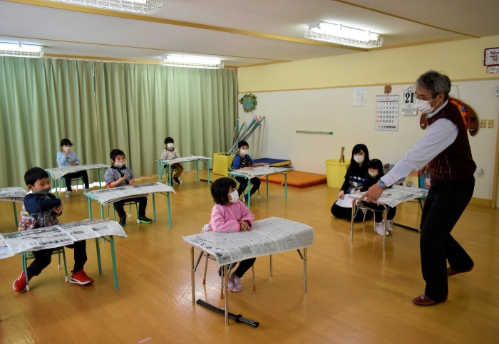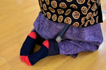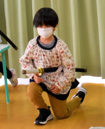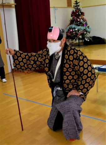 ノリ先生が来ることを心待ちにしていた子ども達でしたが,初めに登場したのは,なんと『仙人』。「・・・・誰!?」「仙人!?って,空飛ぶのの?」「ノリ先生…だよね?」と様々な反応で大賑わいの子ども達でした。 日本文化『正座』の所作を教えに来てくれた仙人。武道に通ずる正座,その座り方・立ち方の作法『左座右起(さざうき)』を見聞きし,刀を身に付け実践し,なぜ左座右起という作法ができたのかを実感していた子ども達です。身に付けた刀は,仙人からのXmas🎁だそうです。和洋折衷!? 時折英語も話す仙人でした(笑)