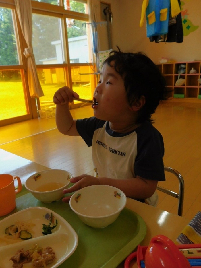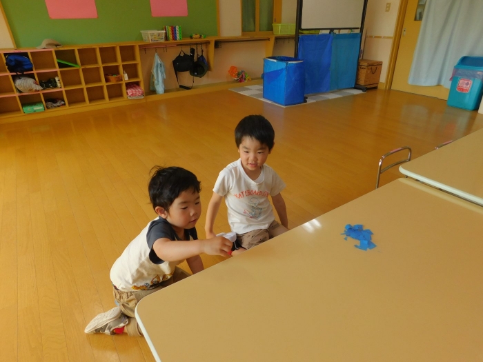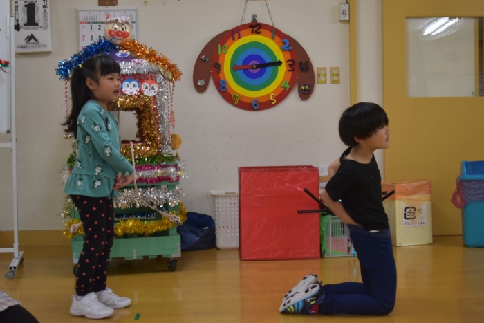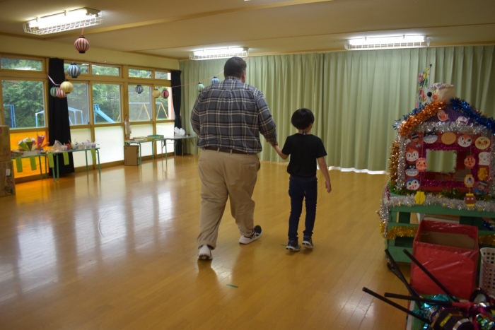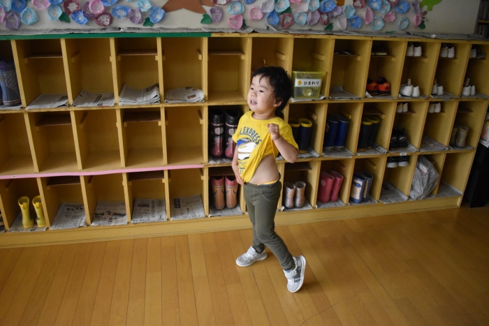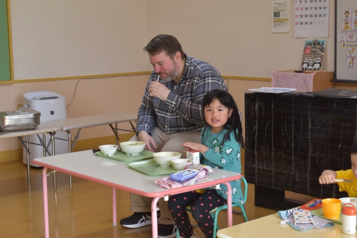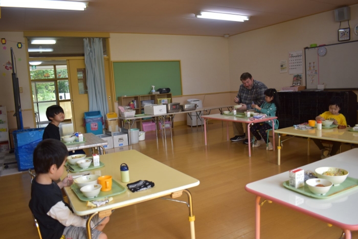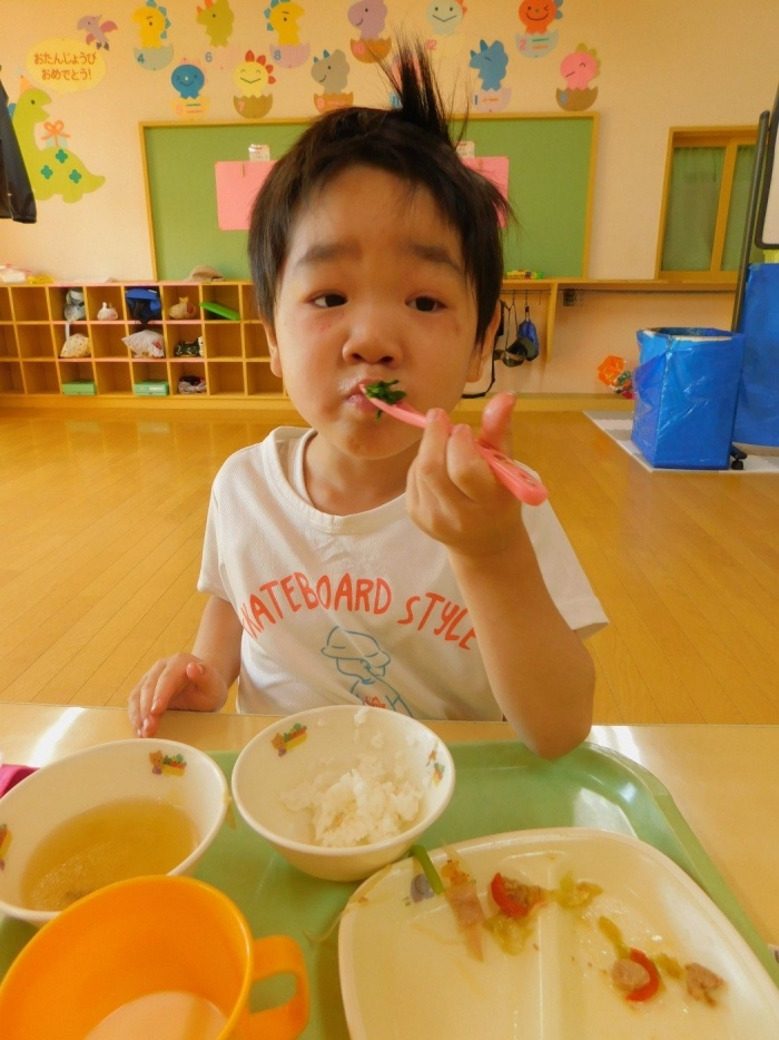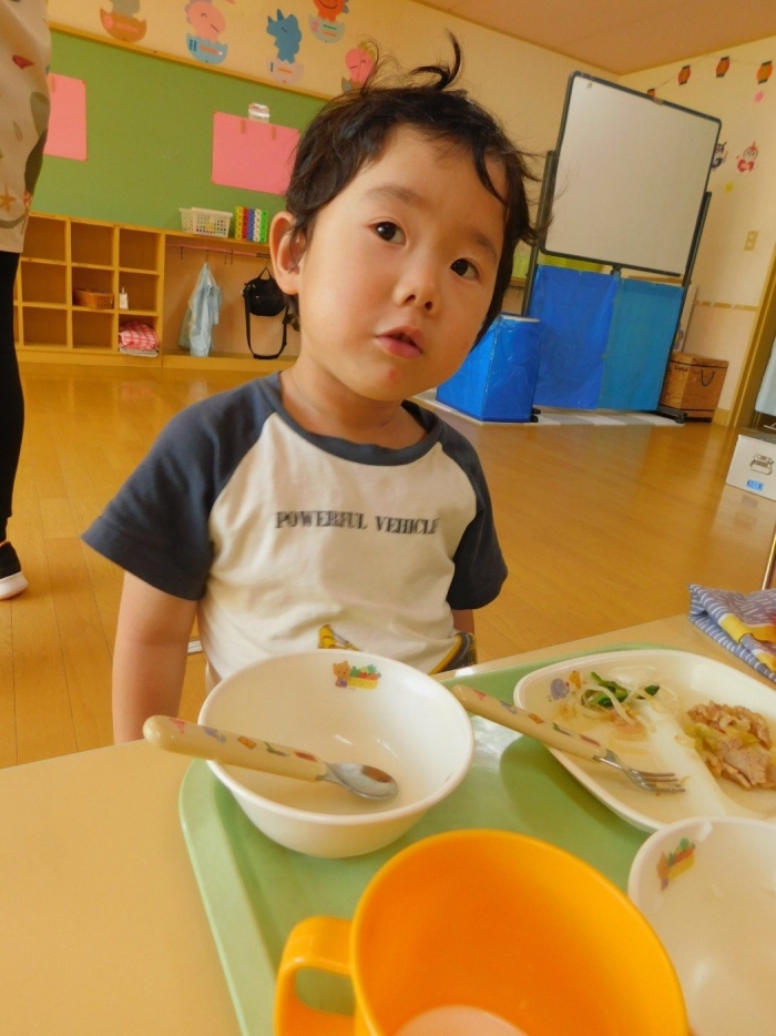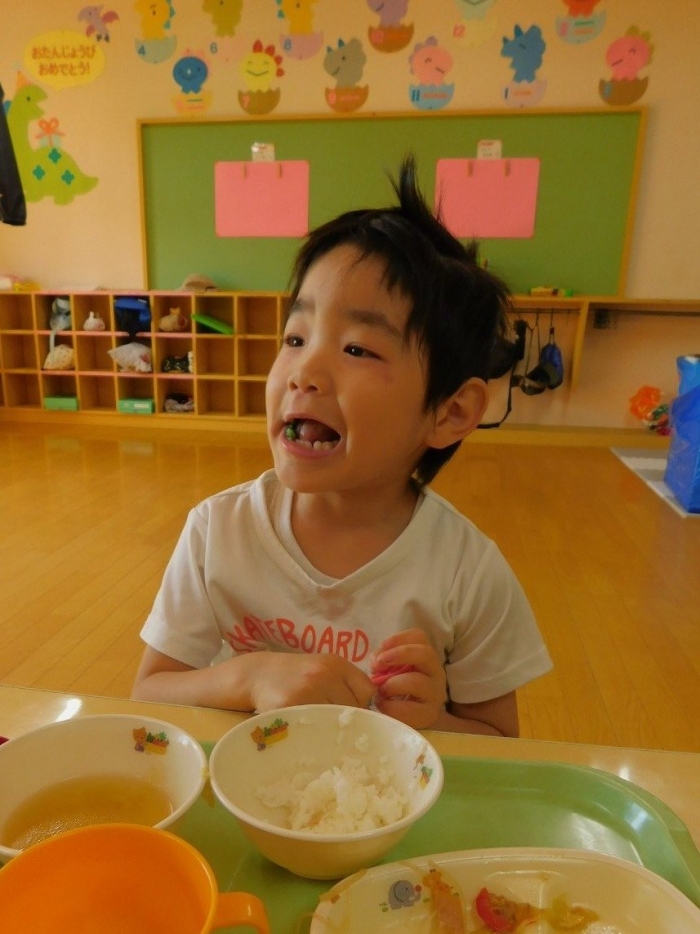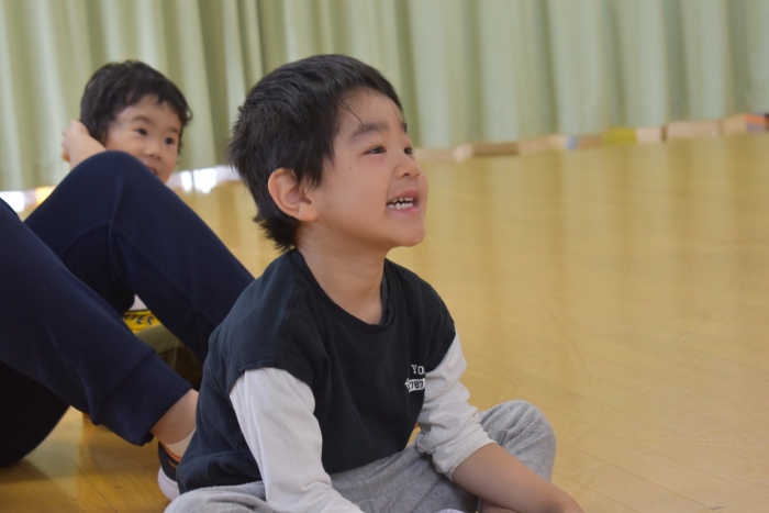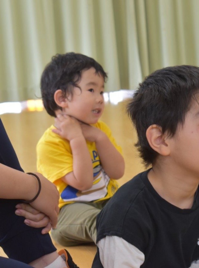 年少児は,初めて出会うマシュー先生に緊張するのかな?と思っていたら,自分から関わりを求めている姿がありました。一緒に遊びたい,関わってもらいたいと,あの手,この手で必死にアピールしている子も(笑) 全力を出しすぎたのか? 午睡は5分くらいで夢の中でした。いろいろな人と触れ合う楽しさから,関わる力がついてきた子ども達です。