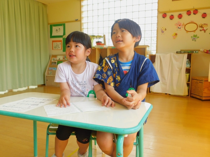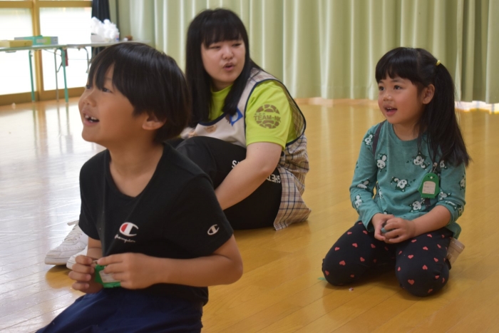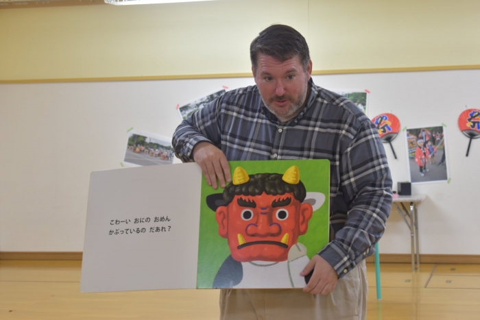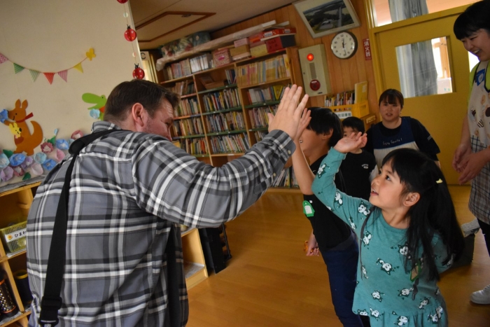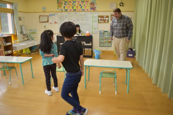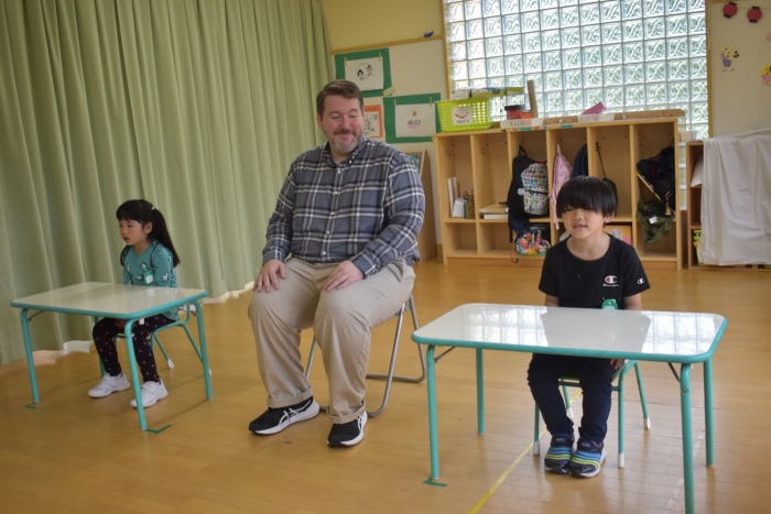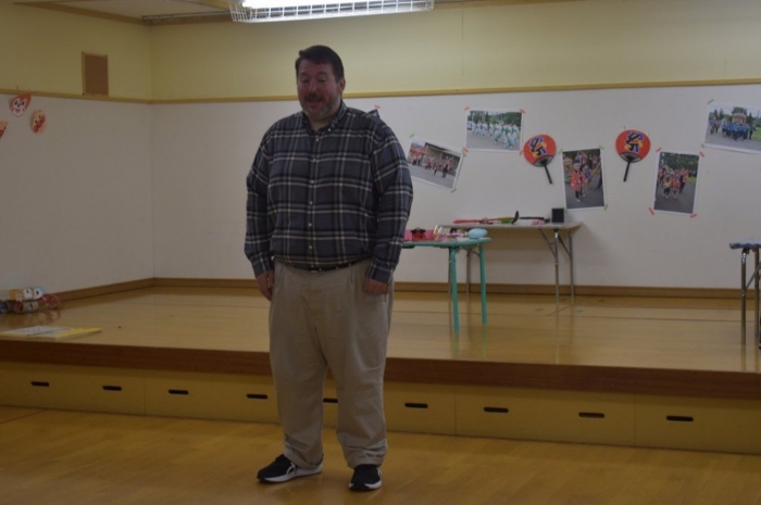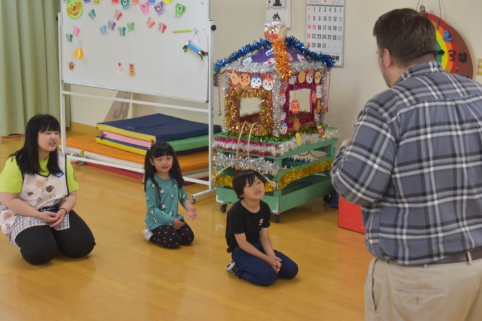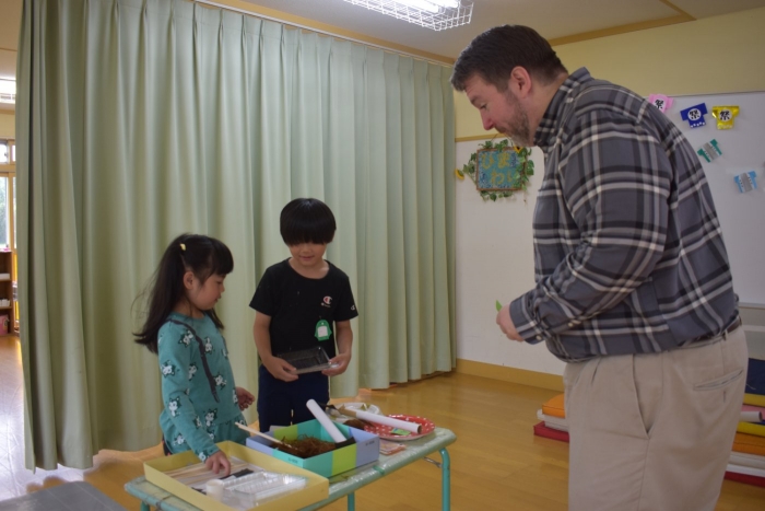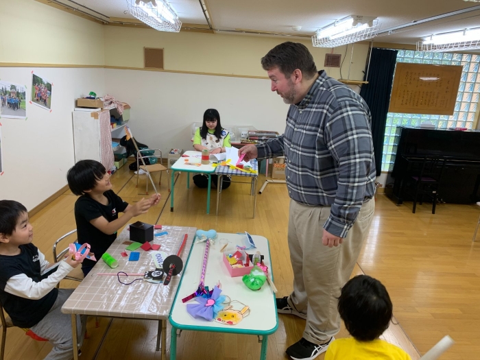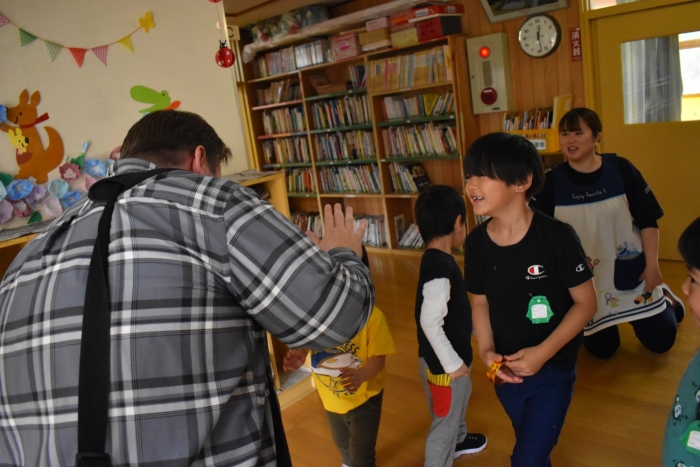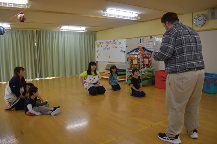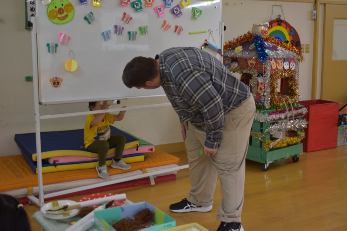 月曜日のALT交流では,マシュー先生が来園! 年長児にとっては,年少組の頃からお世話になっている先生で,自分から遊びに誘い掛けたり,英単語カードや読み聞かせに積極的に参加したりしていました。英語の発音が良すぎて(巻き舌!?)マシュー先生もビックリ!! すっかり英単語を極めています。