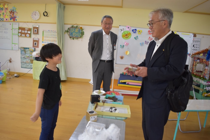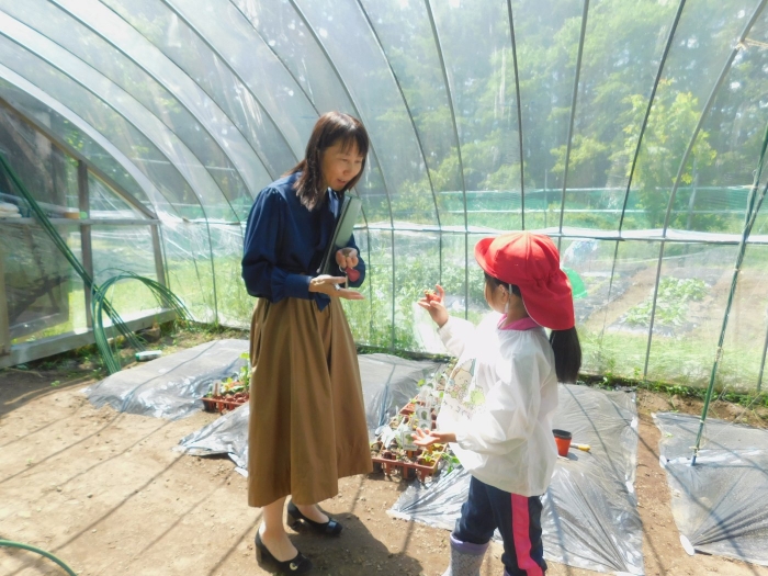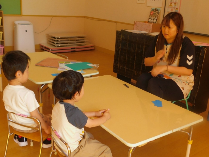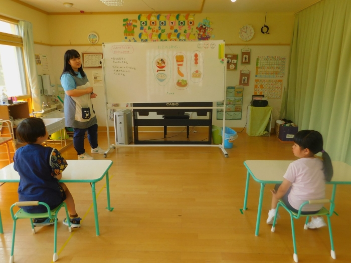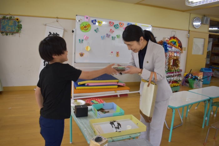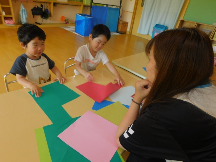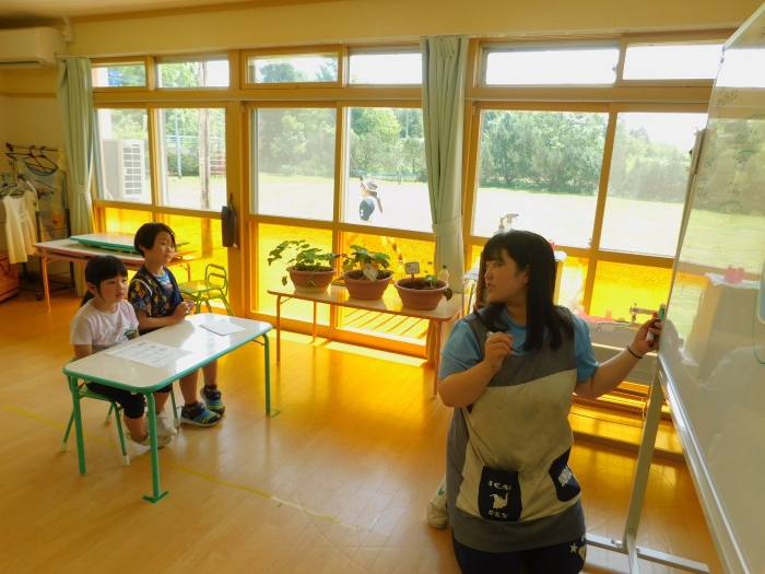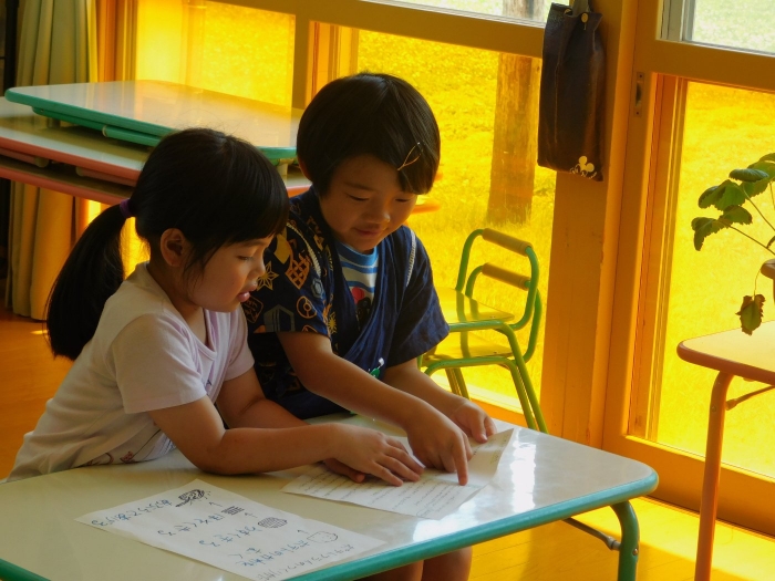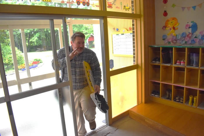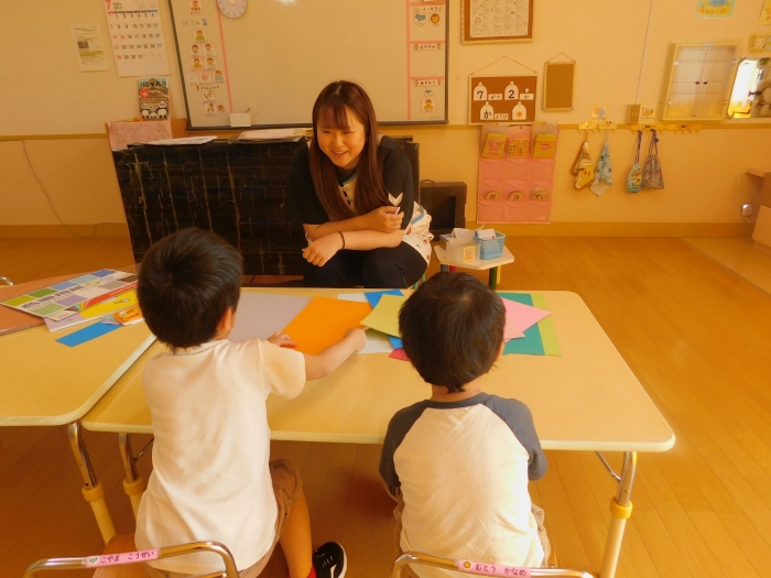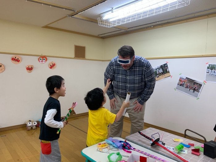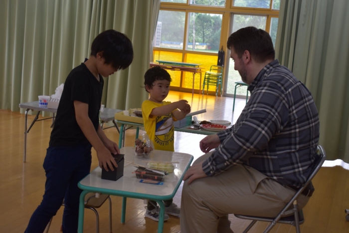 月曜日のALT交流では,マシュー先生が来園! 年長児にとっては,年少組の頃からお世話になっている先生で,自分から遊びに誘い掛けたり,英単語カードや読み聞かせに積極的に参加したりしていました。英語の発音が良すぎて(巻き舌!?)マシュー先生もビックリ!! すっかり英単語を極めています。