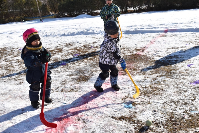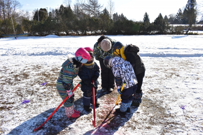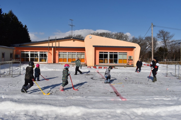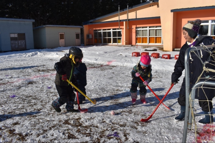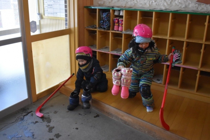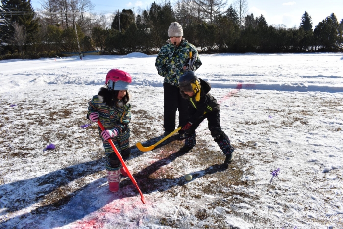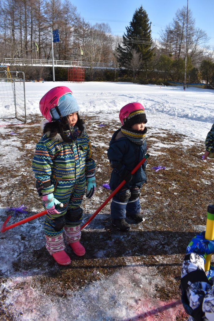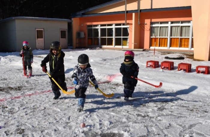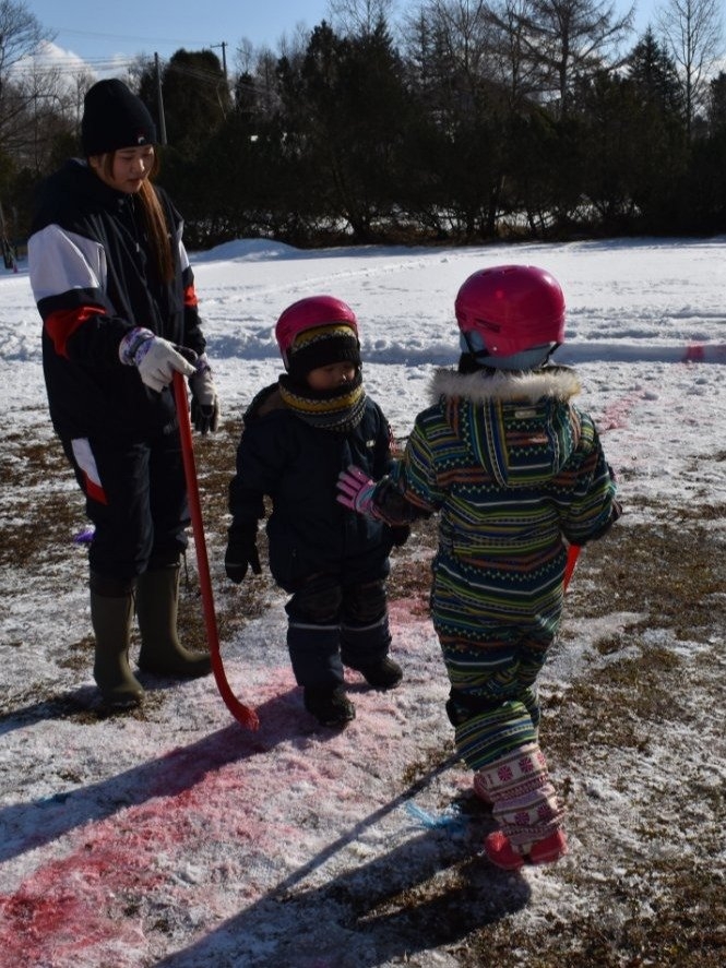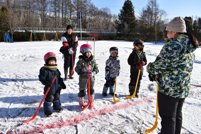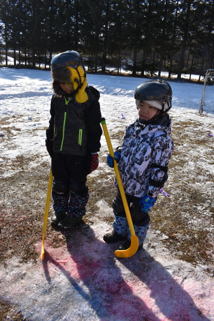 中西別伝統の冬のスポーツ『長靴アイスホッケー』☆彡 幼稚園では,氷上ではなく雪上で楽しんでいますが,今日は年長組に加え年少組も体験しました。年長児に教わりながら防具を身に付けると,気分はもうホッケー選手☆彡 意気揚々とグラウンドのホッケーリンクに向かっていた年少児です。