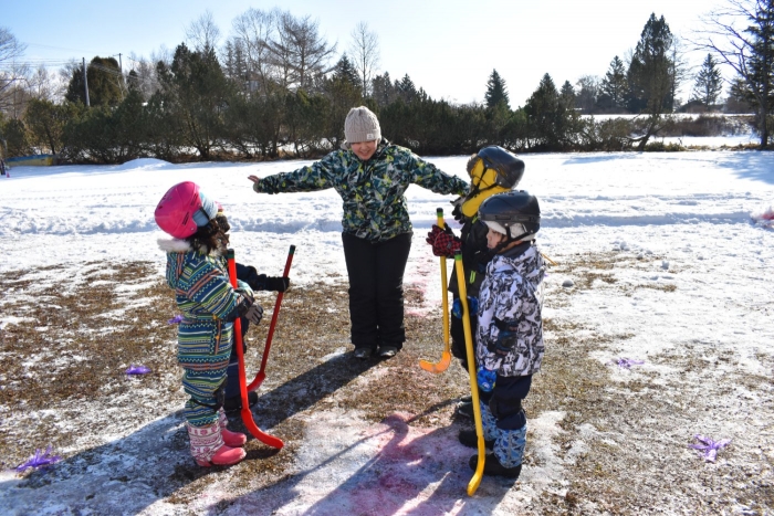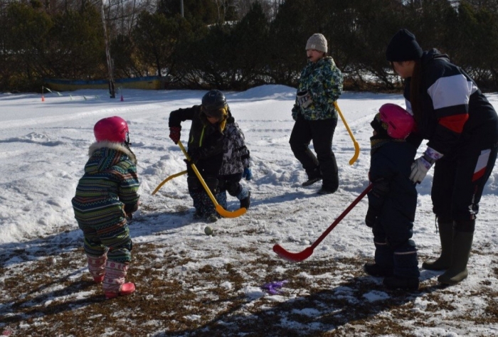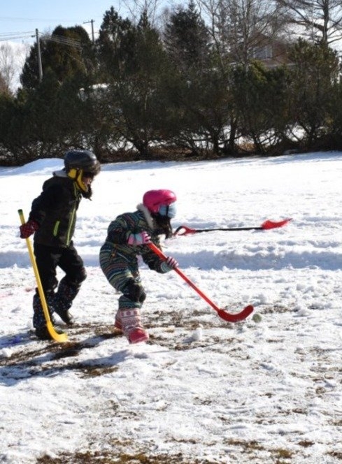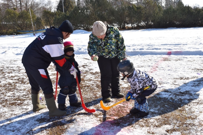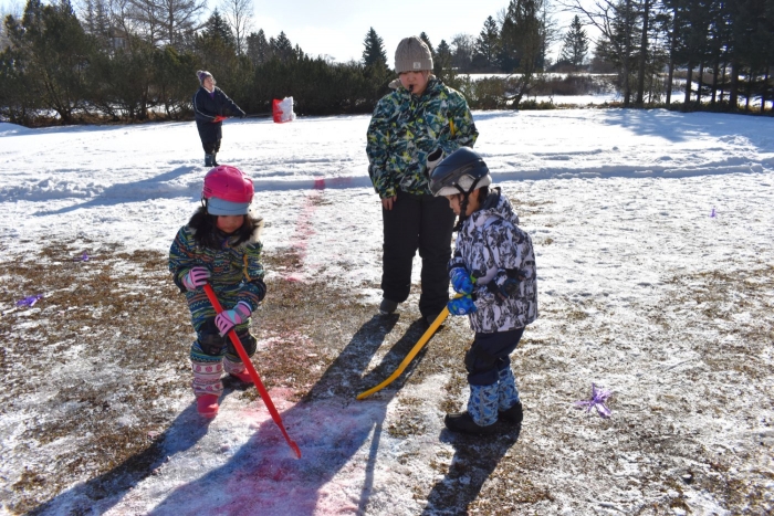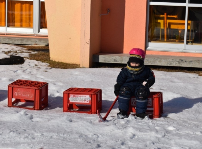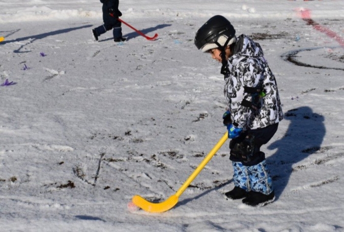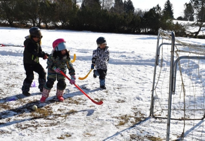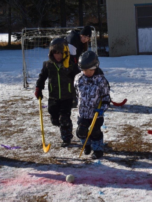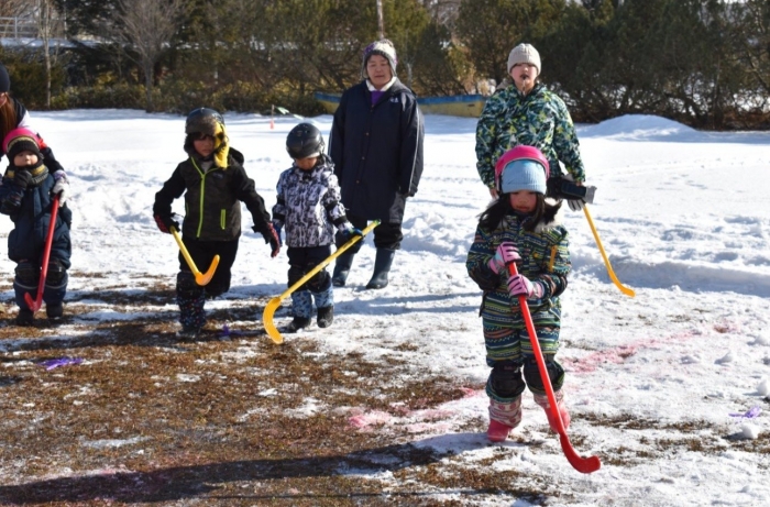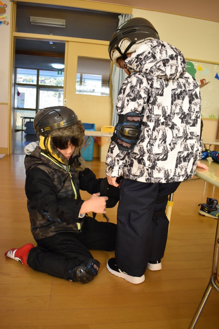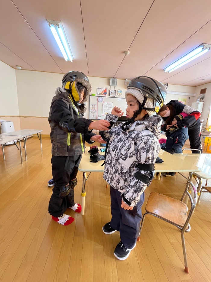 中西別伝統の冬のスポーツ『長靴アイスホッケー』☆彡 幼稚園では,氷上ではなく雪上で楽しんでいますが,今日は年長組に加え年少組も体験しました。年長児に教わりながら防具を身に付けると,気分はもうホッケー選手☆彡 意気揚々とグラウンドのホッケーリンクに向かっていた年少児です。