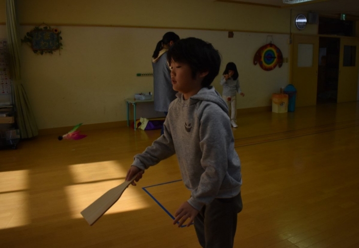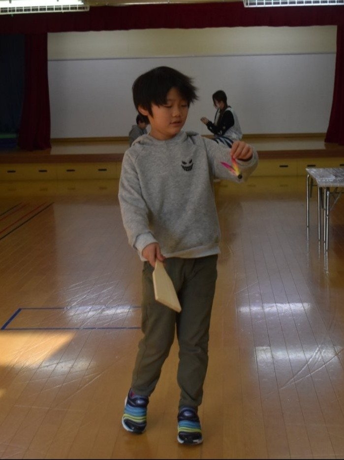 羽子板に巧く羽根が当たるように,繰り返し練習中