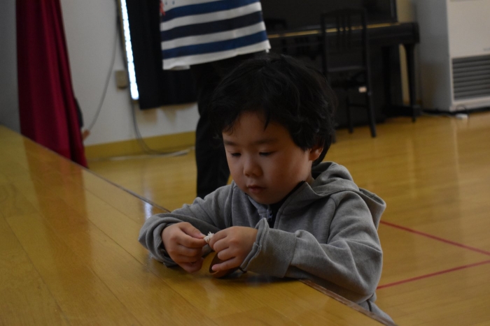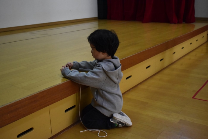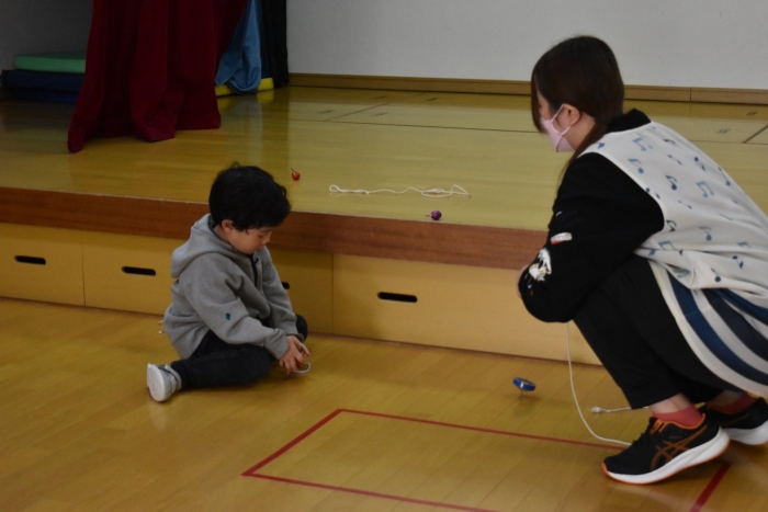 紐ゴマの紐巻き  年長児や先生がコマ回しをしている姿を見て,「やってみたい!!」の気持ちが膨らみました