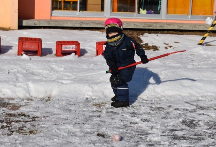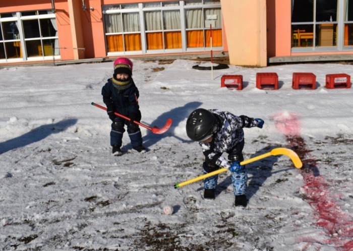 長ぐつホッケーのルールを確認した後,年少組は一人1個のボールで,年長組は二人で1個のボールを使ってフリースタイル練習をしました。練習をしているうちに熱が入る年長児&先生方,初心者の年少児にも容赦がありません。意欲満々な子ども達の様子から,最後は縦割りチームで試合も楽しみました。試合なのですが,年長児にボールを「貸して!」,ボールに追いつけず「ちょっと待って!」と必死にお願いをしていた年少児,でも試合の時には本気・全力の年長児は手を緩めません。これまで,幼稚園で様々なことを教えリードしてくれていた年長組,今回は勝負の世界は厳しいことを伝授してくれたようです。