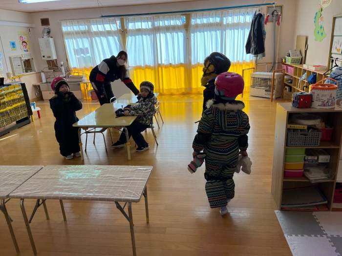 すずらんさんは準備できたかな? 素早く身支度を済ませ,年少児を誘いに来た年長児