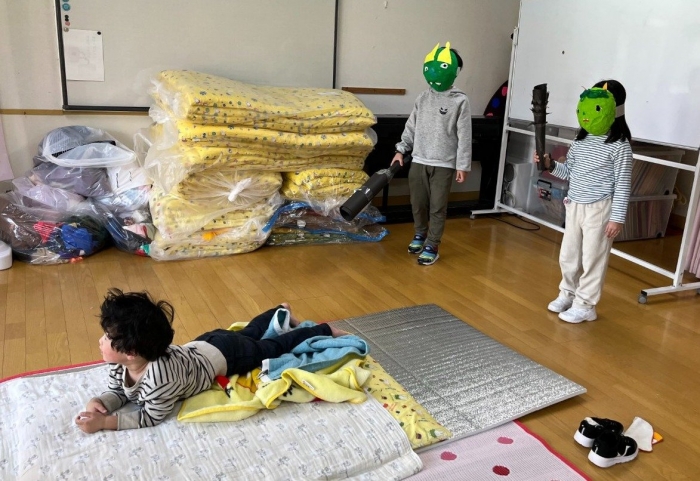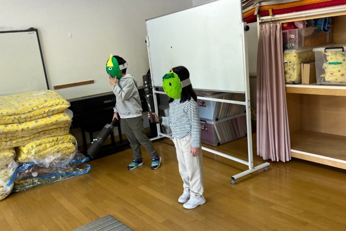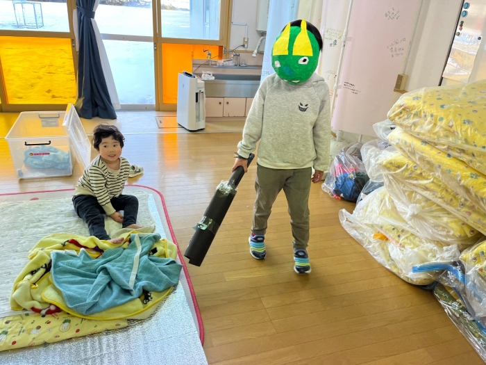 オニに見守られ!? いつもよりスピーディーに目覚め・片付けを済ませていた年少児です