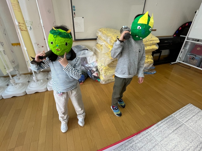 節分のオニのお面が完成した年長組,昨日はお面を見せに