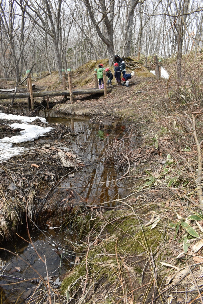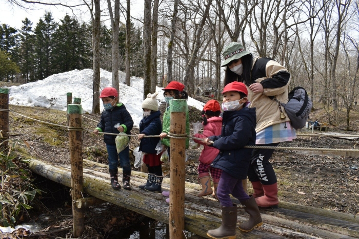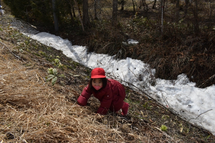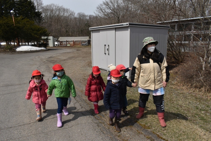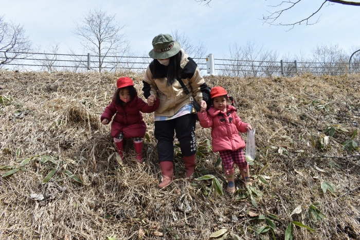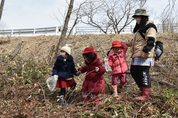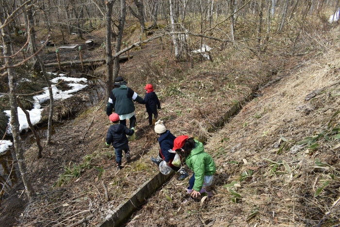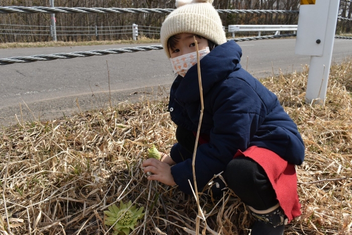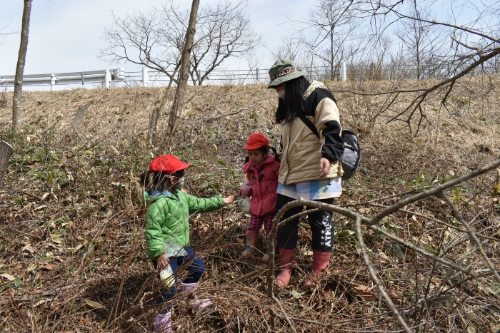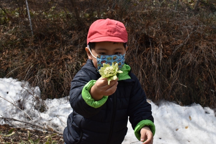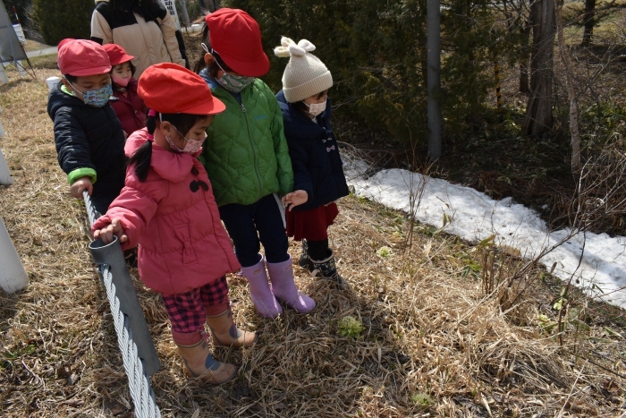 今朝は濃霧に覆われた空模様でしたが,段々と気温が上昇し,日中は17℃というボカボカ陽気に恵まれました。絶好の外遊び日和☆彡新入園児たちは念願の戸外デビューを果たしました。幼稚園に詳しい進級児が,動物小屋を案内したり,先日発見したフキノトウのある場所,わくわくジャングルを案内してくれました。初めて出会うニワトリを恐々覗いたり,急勾配の斜面でフキノトウ探しに奮闘していた新入園児たち。そんな様子を気に掛け,必要に応じで手を差し伸べる進級児たちの姿に頼もしさを感じました。柔らかな春風,フキノトウの独特の香り,雪解け水のせせらぎ,様々な春を感じていました。次はどんな春に出会えるのか,楽しみにしている子ども達です。