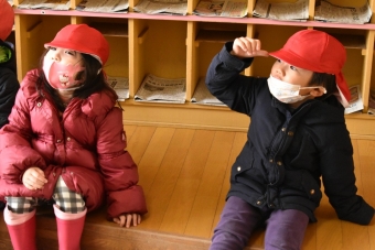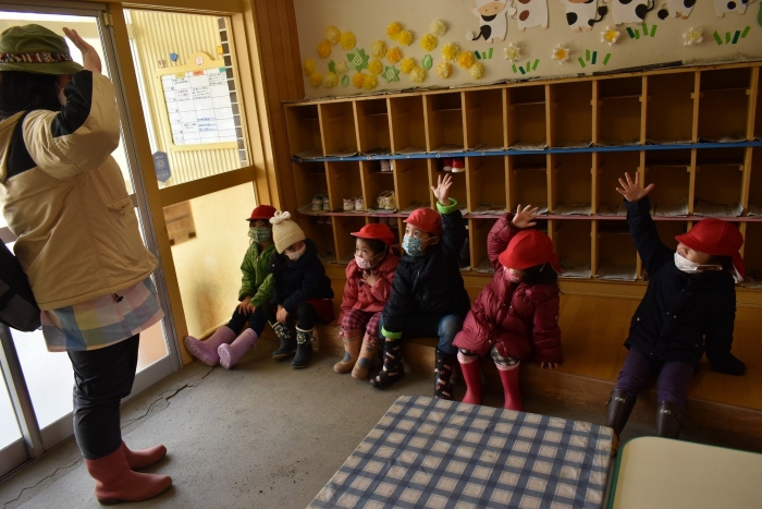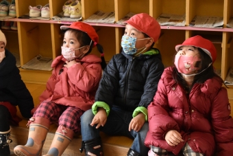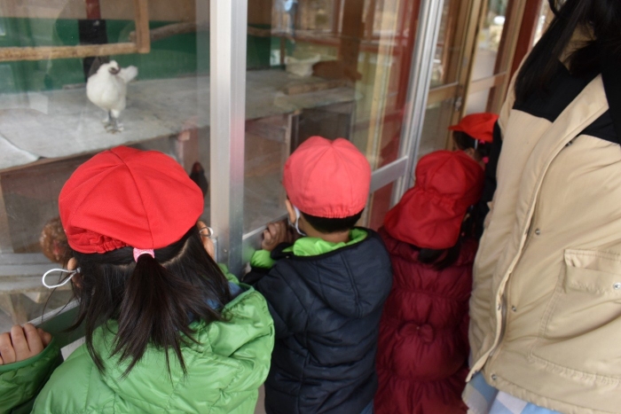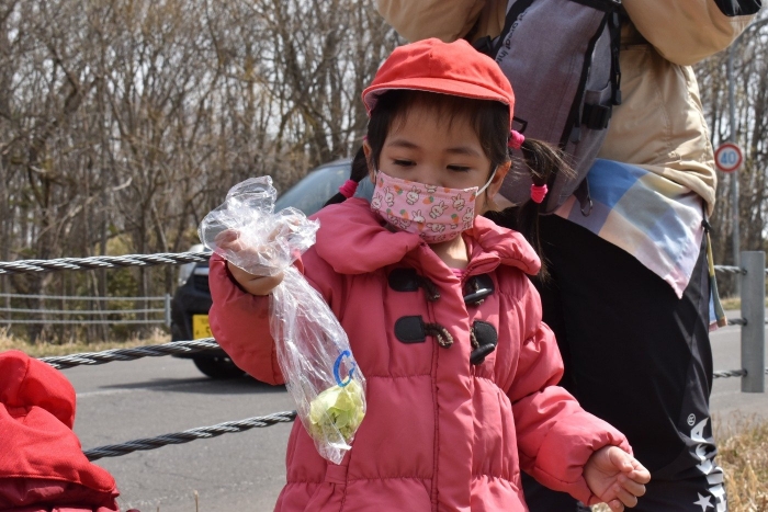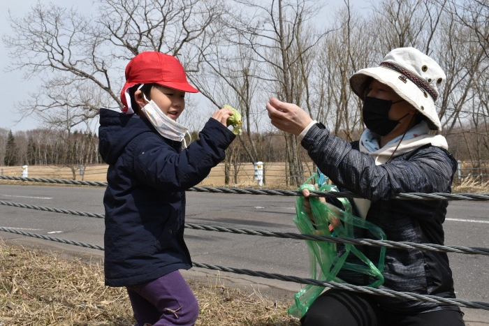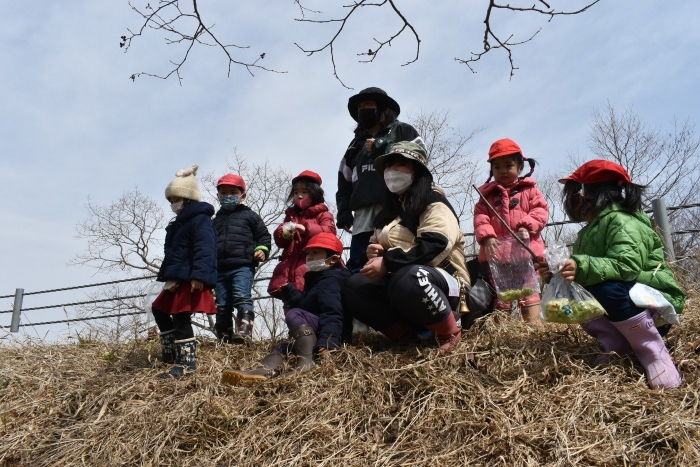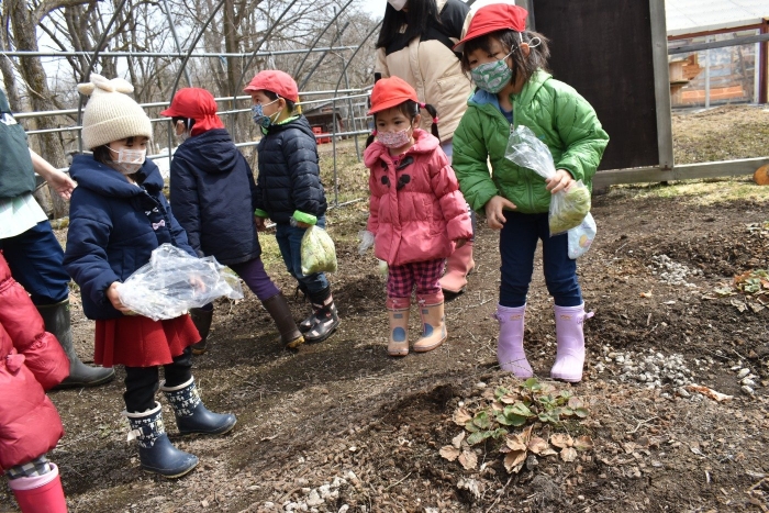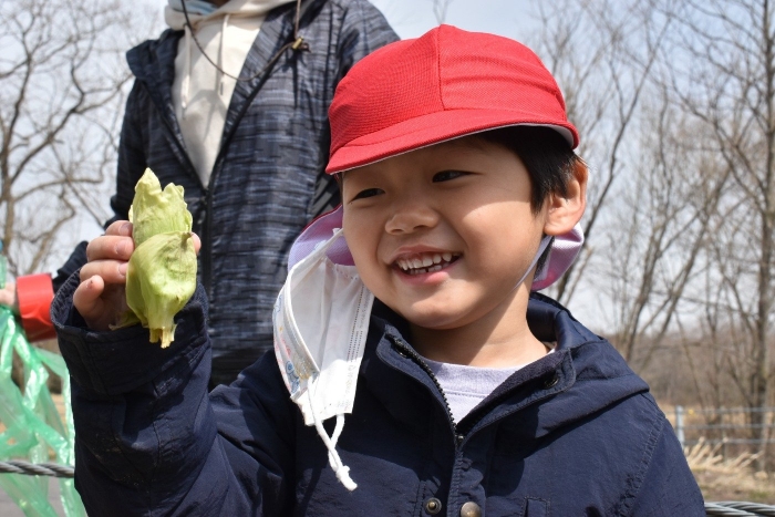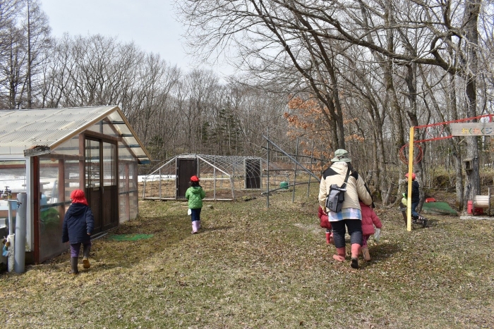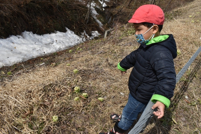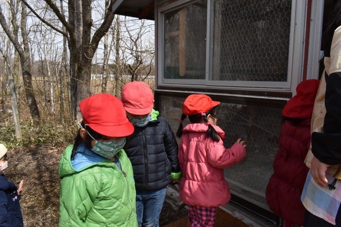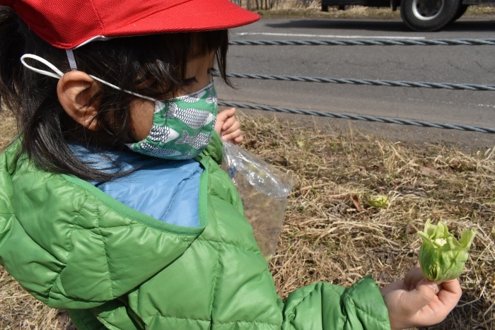 今朝は濃霧に覆われた空模様でしたが,段々と気温が上昇し,日中は17℃というボカボカ陽気に恵まれました。絶好の外遊び日和☆彡新入園児たちは念願の戸外デビューを果たしました。幼稚園に詳しい進級児が,動物小屋を案内したり,先日発見したフキノトウのある場所,わくわくジャングルを案内してくれました。初めて出会うニワトリを恐々覗いたり,急勾配の斜面でフキノトウ探しに奮闘していた新入園児たち。そんな様子を気に掛け,必要に応じで手を差し伸べる進級児たちの姿に頼もしさを感じました。柔らかな春風,フキノトウの独特の香り,雪解け水のせせらぎ,様々な春を感じていました。次はどんな春に出会えるのか,楽しみにしている子ども達です。