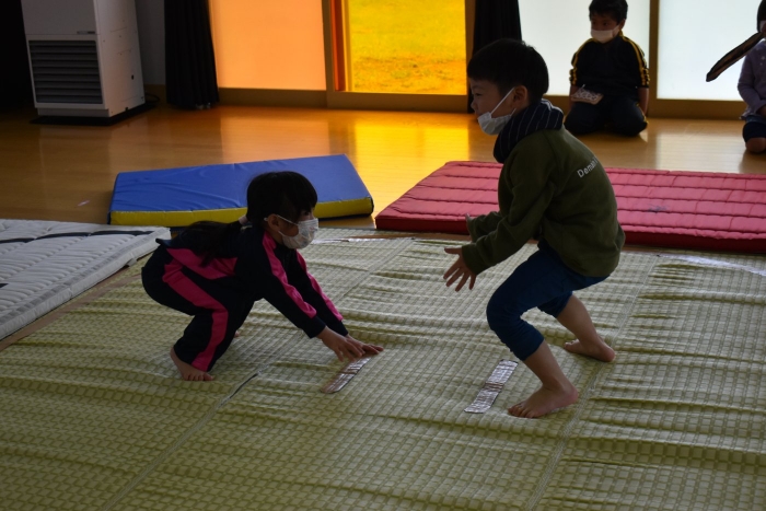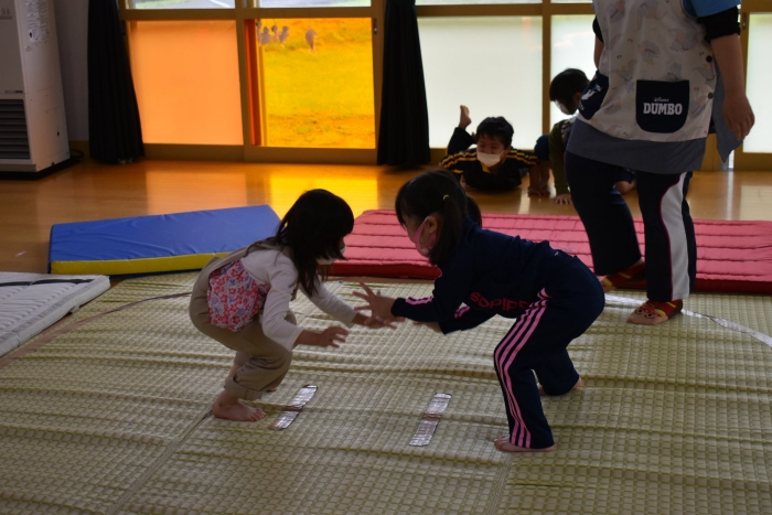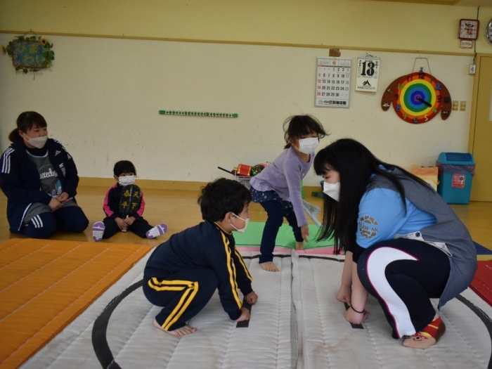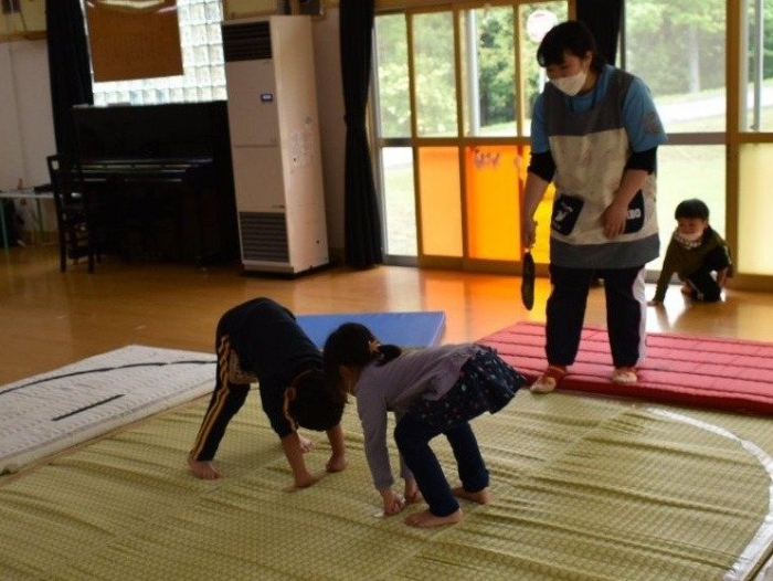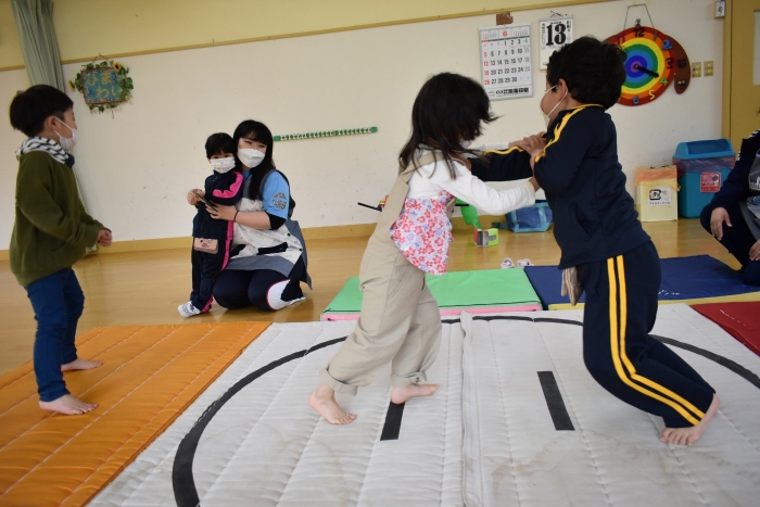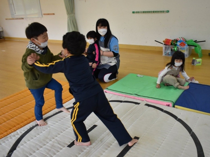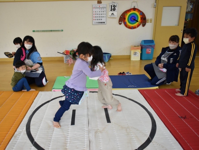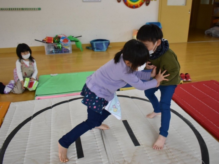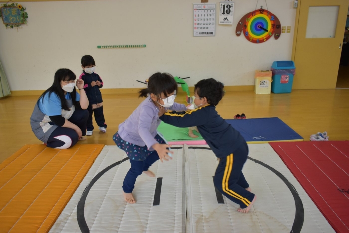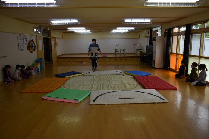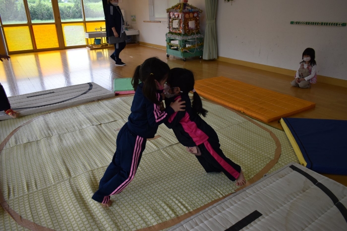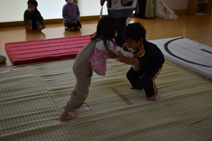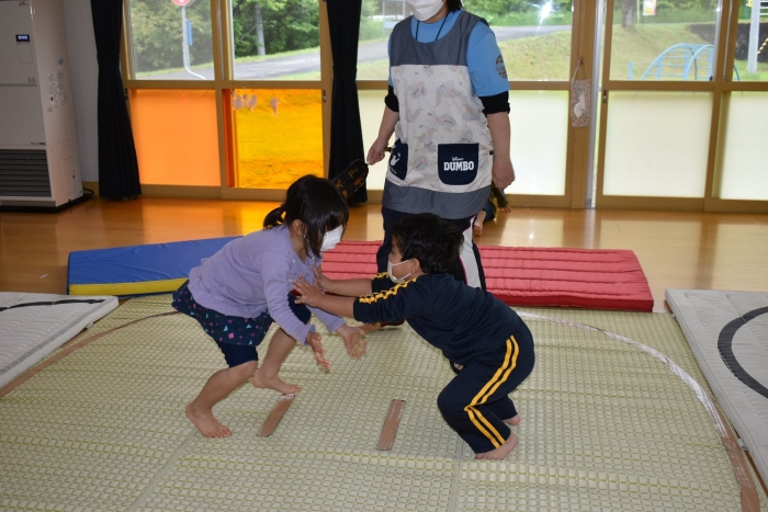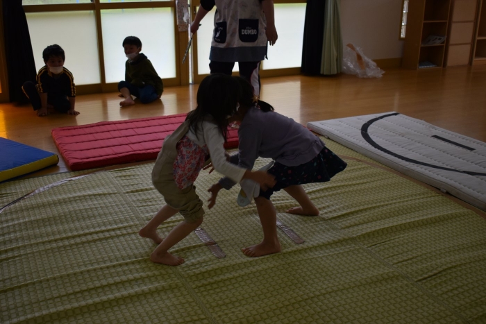 本祭り後,万が一雨が降った場合を想定し,園内での相撲取組も実施。普段の遊びで使っている相撲マットより一回り大きな土俵に切り替え,いざ対戦☆彡 家族の人と練習してきた,勝つための技を教えてもらった子も多く粘り強く果敢に挑戦する姿が印象的でした。