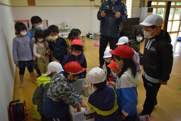 授業の一環で,幼稚園で預かり飼育しているヒヨコを観に1・2年生が来園しました。 運動会をきっかけに,親しみが倍増していた小学生との再会に大喜びの園児たち。中西別ふるさと祭りや,20日(月)実施の小学校読み聞かせ&1年生授業参観での交流を楽しみにしています。