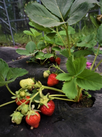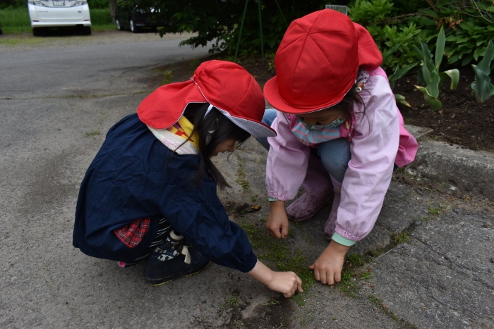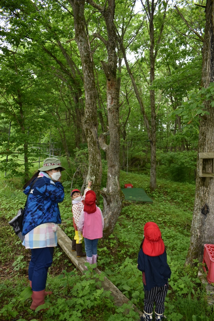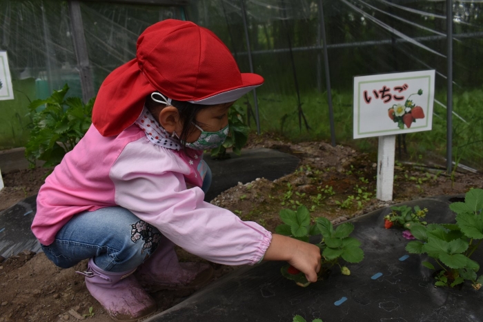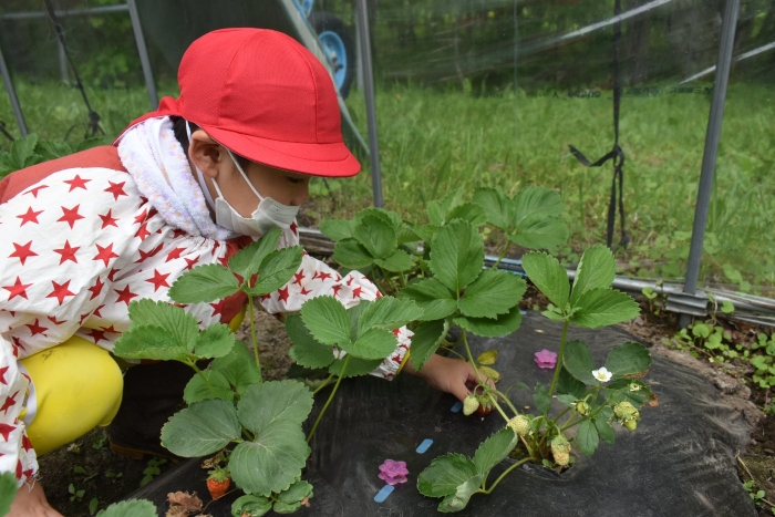 ジャガイモの芽が出てから2週間ほど経ちましたが,目に見えて大きく生長している様子に驚きの子ども達! もっと大きく育つように…と,雑草取りにも精を出していました。赤い実りを楽しみにしていたイチゴも,さっそく手に取り,その場で味わう醍醐味を味わっていました。畑近くの木に巣を作っていたアカゲラの赤ちゃんの声も,初めて聞くことができ,感動していた子ども達です。