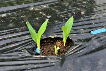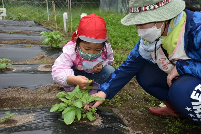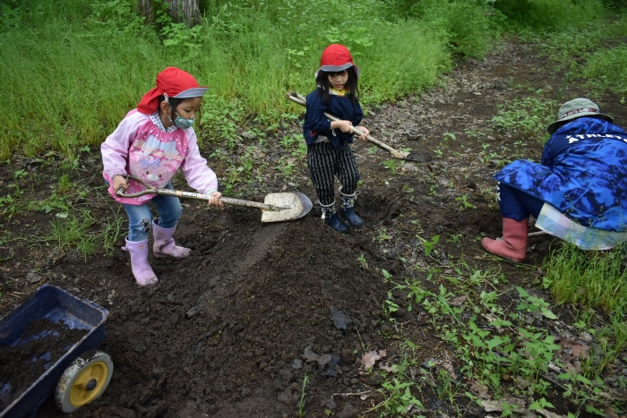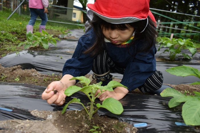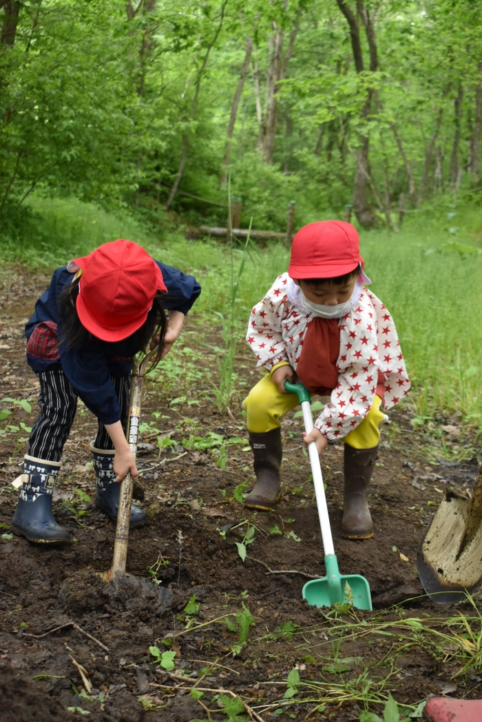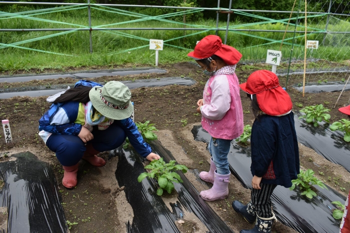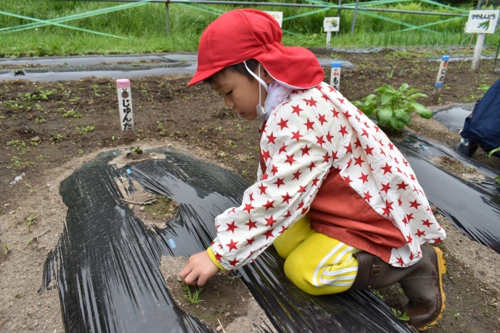 『ジャガイモの芽が出てるー!』『イチゴが,なってる!』と大喜びした後,なかなか足を運べていなかった畑へ,久しぶりに行ってきました。ちなみに今年の畑には,園児のリクエスト・天ぷら用野菜の他,雪印種苗さんからいただいた種(トウキビ,ミニダイコン,ニンジン,サヤエンドウ,エダマメ)も蒔いています。毎年,野菜種を提供していただき有り難うございます。