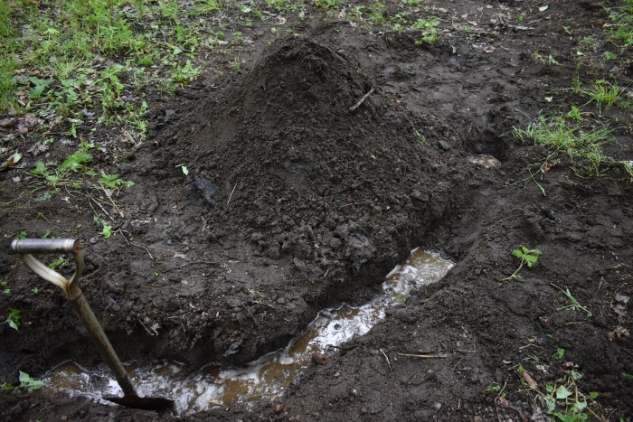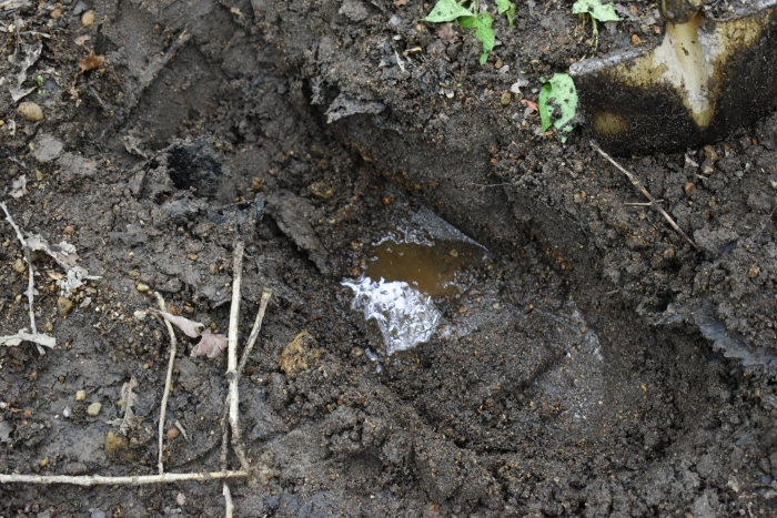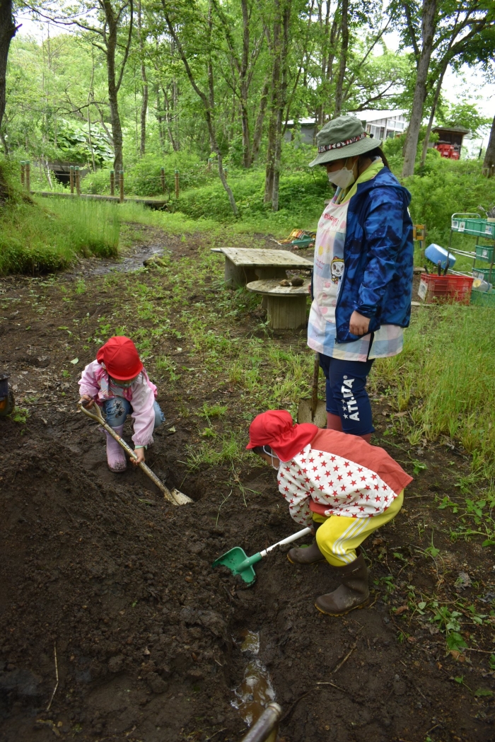 その後は,わくわくジャングルで以前作っていた山作りを再開! どんどん掘り進むと,地中から水が染み出てくることに驚いたり,水を含んでいると土が崩れにくいことに気づいたりなど,様々な気づき・発見をしながら山作りを楽しんでいました。