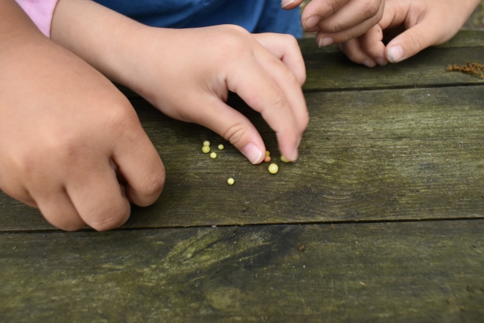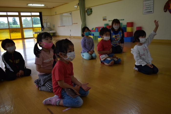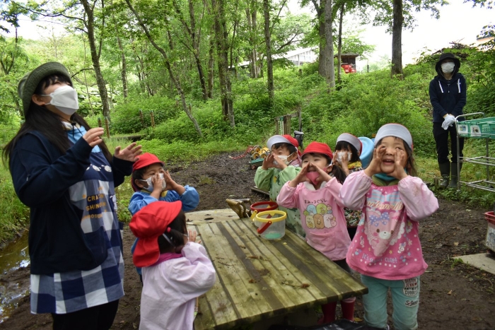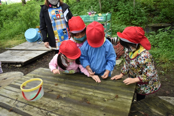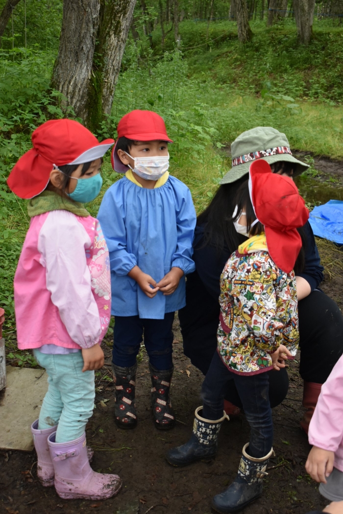 今日も続きをしよう!と,わくわくジャングルへ向かった子ども達。山が大きくなってることに即気づき,「きっと神様だ!わくジャンの神様が大きくしてくれた」と喜ぶ進級児。昨年度のかまくら作りでも,同じような現象が起きたことを思い起こしたようです。七夕の由来でも『神様』の話題が出たことで,イメージがどんどん膨らむ子ども達。山の頂上に謎の実を発見!目を凝らすと辺り一面に落ちていて「神様の実だ!!」と大興奮したり,「今,神様の声が聞こえた!」という子も出てきたりと,『山を大きくしてくれたのは神様』だと確信していました(笑)
