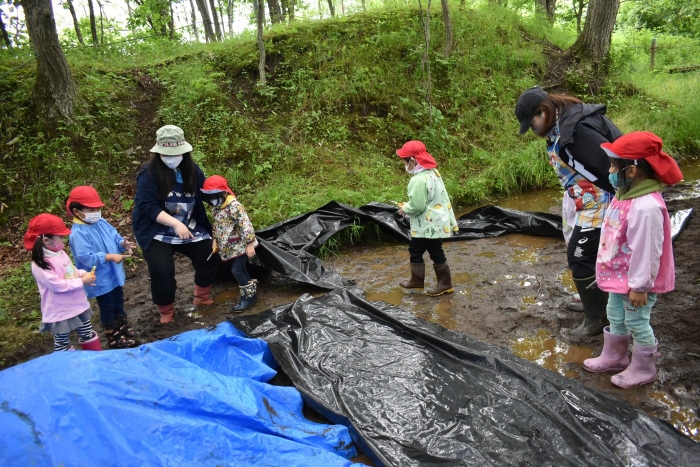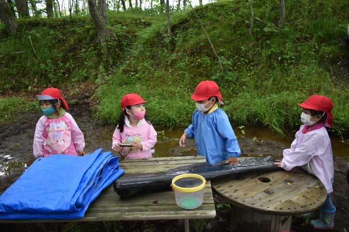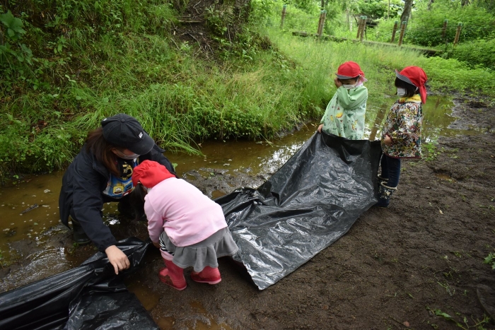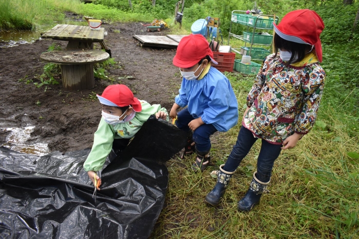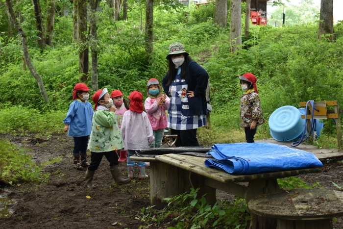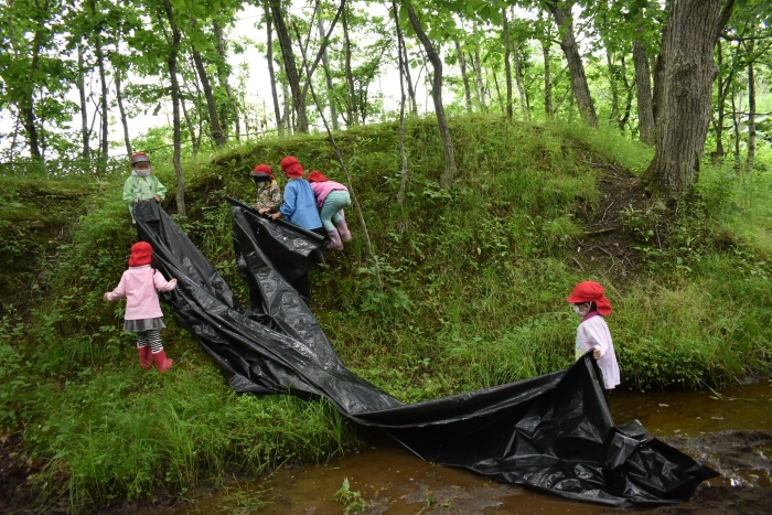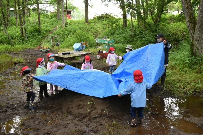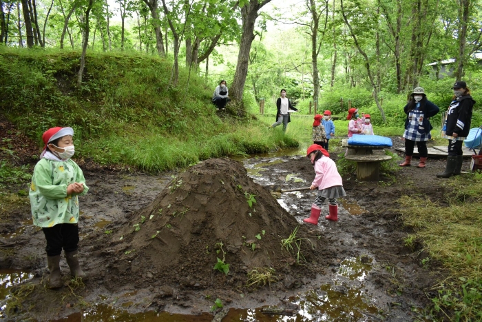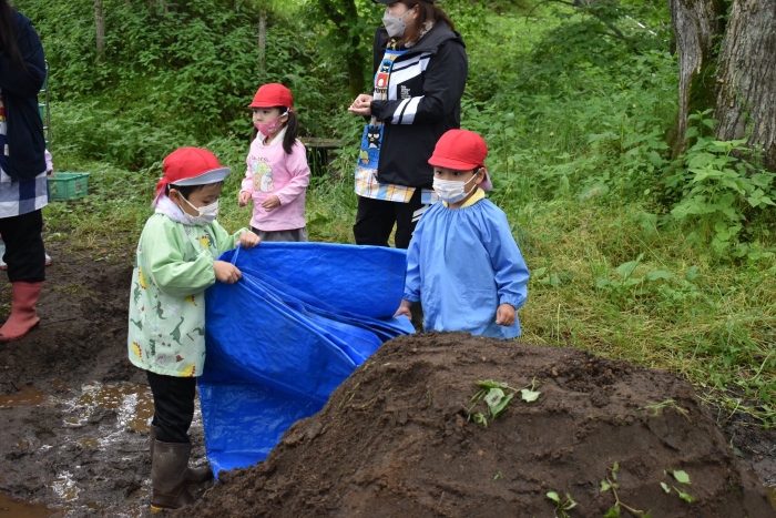 年中児を中心に『みんなで遊べる大きな山』『大きな山で滑って遊ぶ』ことを目指し,土を掘り,運び,盛り,固め続けていた子ども達。しかし,段々と子どもの力だけで大きくするには難しい状況に…。共有の楽しい体験,友達と力を合わせたからこそできた成功体験につなげたいとの願いから,密かに先生方で山を倍の大きさにしておきました。