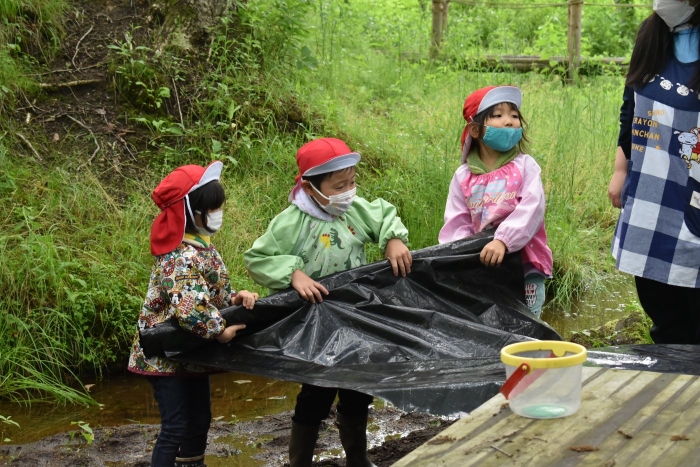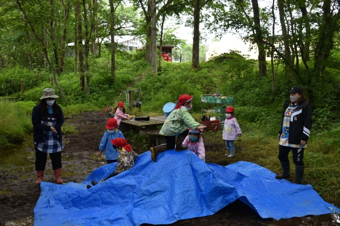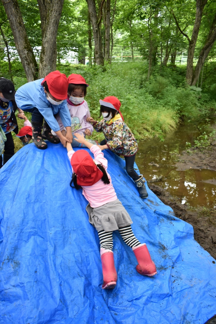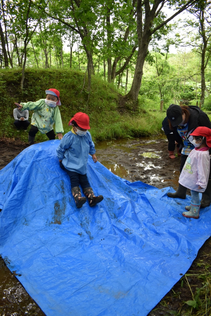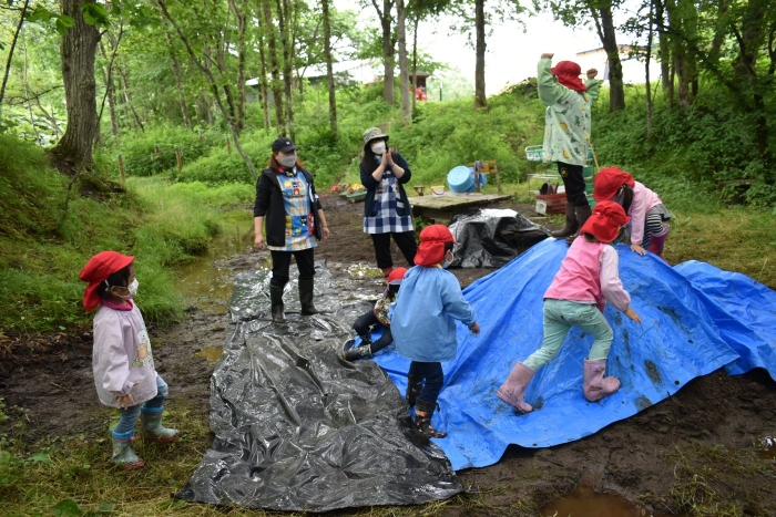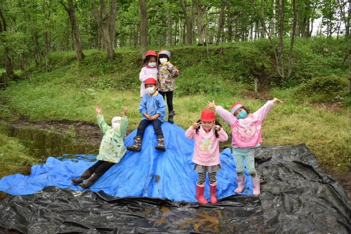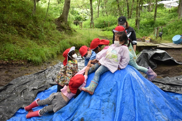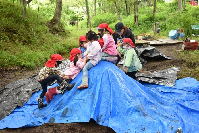 神様が大きくしてくれた山に,みんなでシートを敷き,充実感・達成感に満ち溢れた表情で念願の山滑りも満喫☆彡 「神様,ありがとーーーう!!」と,わくわくジャングルに子ども達の歓喜の声が響いていました。