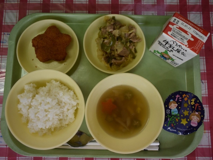 今日は給食も『七夕』にちなんだメニュー! 星形のコロッケやゼリー,天の川に見立て春雨や星型のニンジン・オクラが入った献立で,大喜びの子ども達でした。