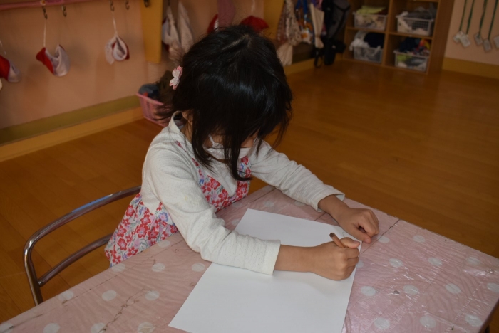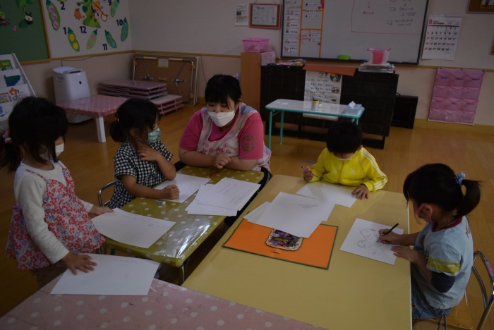 小学生が育てたジャガイモ『いもにしちゃん』を貰い・味わい,大喜びしていた子ども達ですが,午睡中の訪問で,その場でお礼を伝えることができずにいました。「どうしたら,この嬉しい気持ちが小学生に伝わるか」担任が話題を振ると,字に興味・関心のある年中児たちから「手紙を書こう!」と話が広がり,みんなで絵や手紙を書(描)くことに! ジャガイモの絵や, 笑顔の自分たちと小学生のお兄さん・お姉さんを描いたり,思いを言葉にしながら書いたり,それぞれの嬉しい思いを表現する姿がありました。